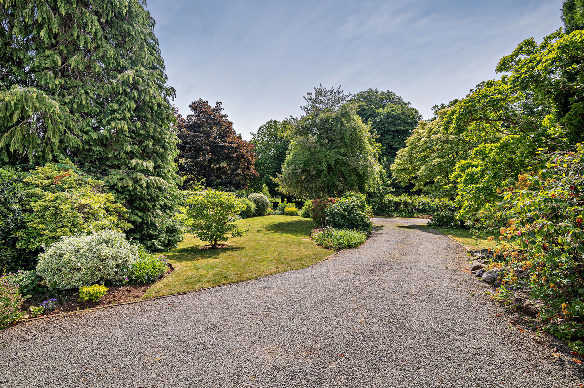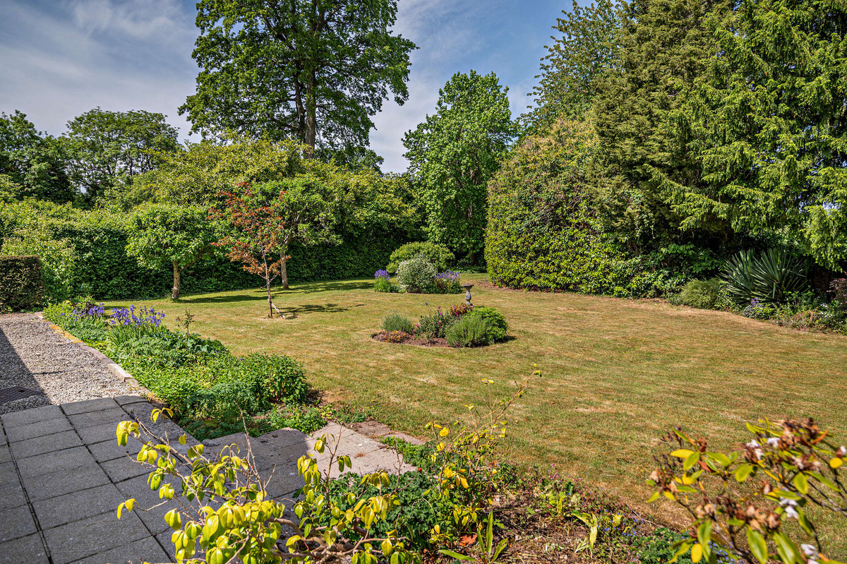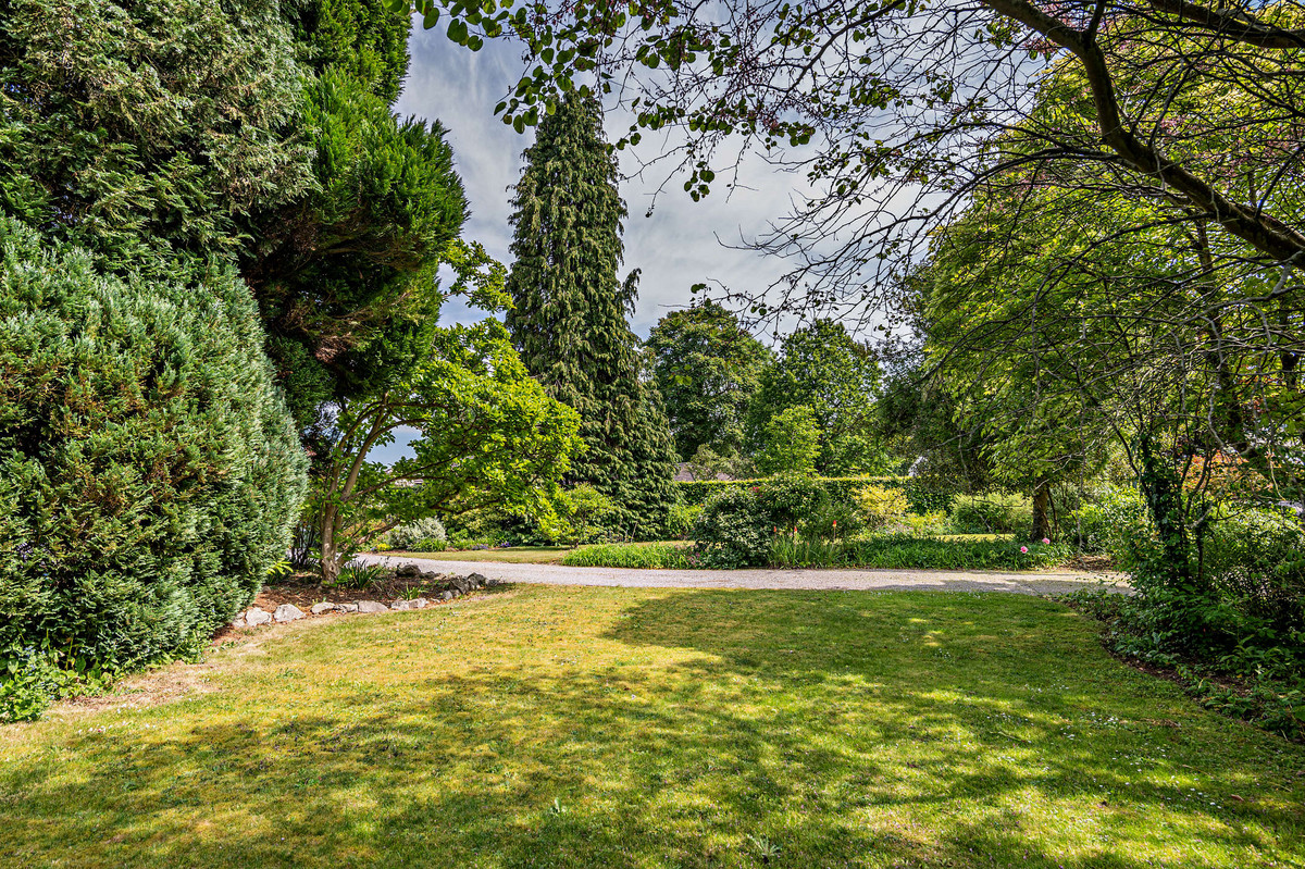 Approached via a long private driveway, the home is gracefully positioned within a generous, established plot. The front garden is a haven of colour and calm, featuring vibrant borders, flowering shrubs, and a magnificent magnolia tree that heralds the arrival of spring.