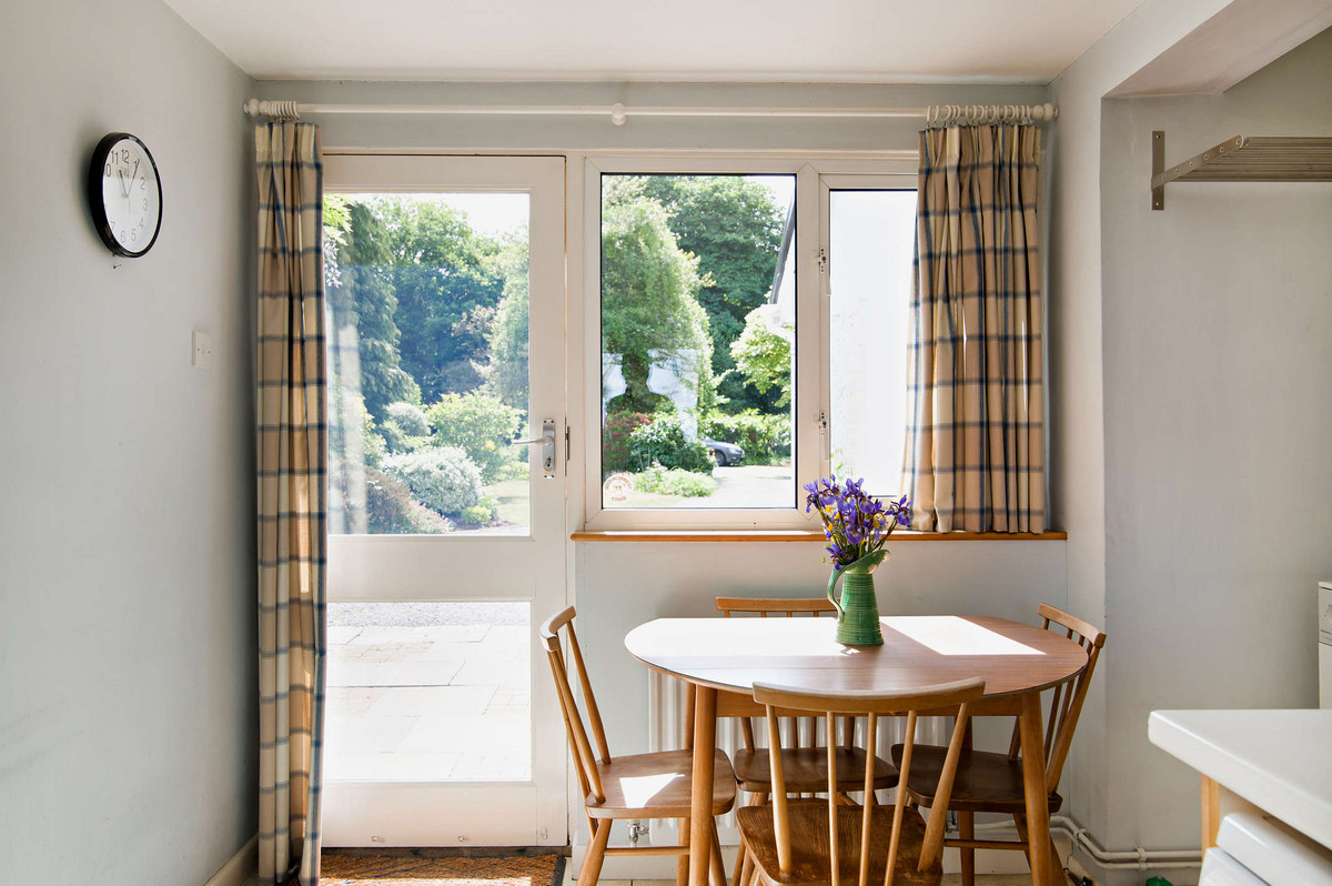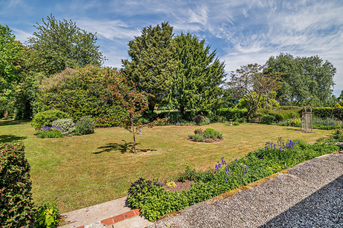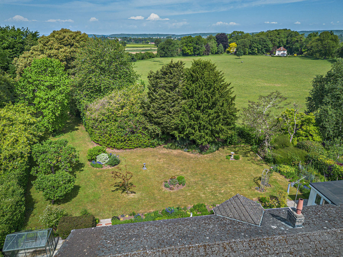 The rear garden is truly the showpiece — a wide, level lawn framed by mature trees and vibrant planting. It’s a garden made for both quiet reflection and family enjoyment. Beyond the boundary, glimpses of rolling farmland and Tickenham Hill offer a picturesque and ever-changing rural panorama.