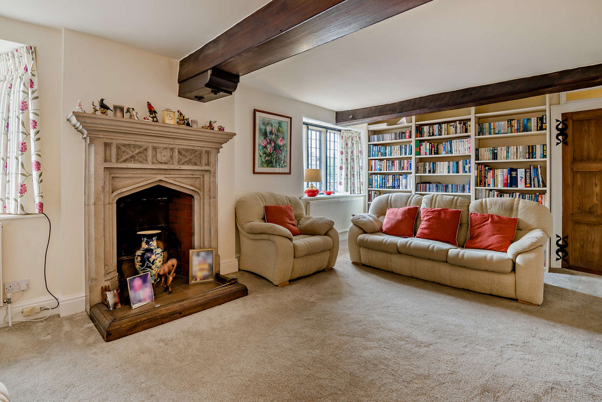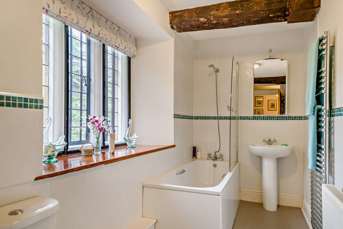From the entrance hall, a staircase rises to what is currently arranged as a generous first-floor living room. Here, a grand open fireplace forms the centrepiece, while windows frame views across the courtyard. Adjacent lies the family bathroom. This flexible level could equally serve as a spacious third bedroom if preferred, allowing the home to be enjoyed as either two bedrooms with two living areas or three bedrooms with a single reception space.