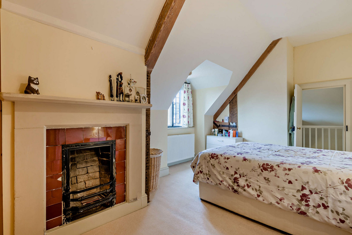 The upper floor is dedicated to the bedrooms, where a charming original fireplace graces the landing. The master suite impresses with a vaulted ceiling, exposed beams, bespoke storage, and a private ensuite – a serene retreat that balances history with comfort. A further well-proportioned bedroom completes this floor.