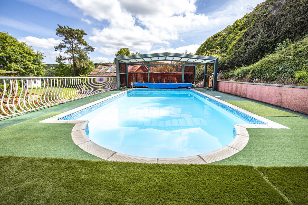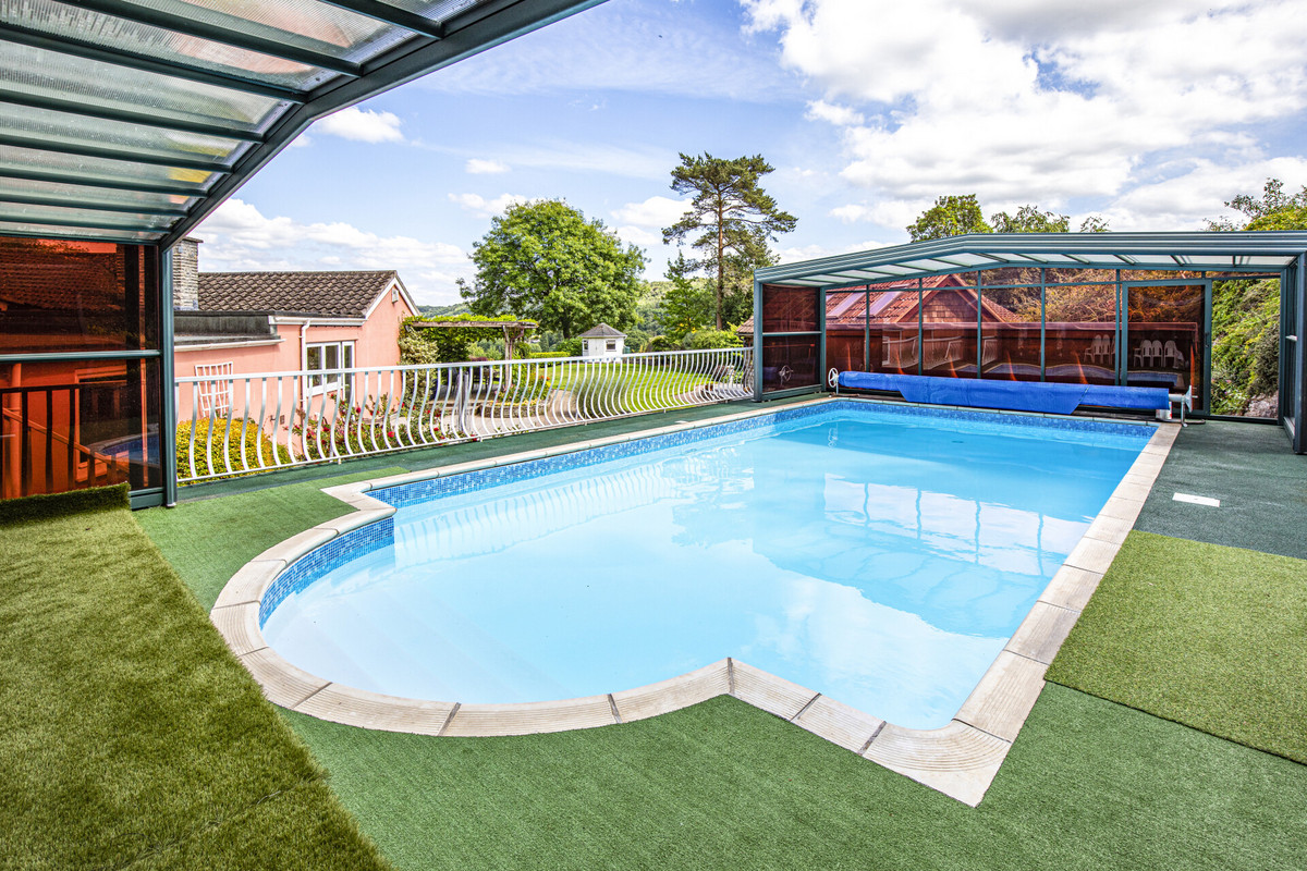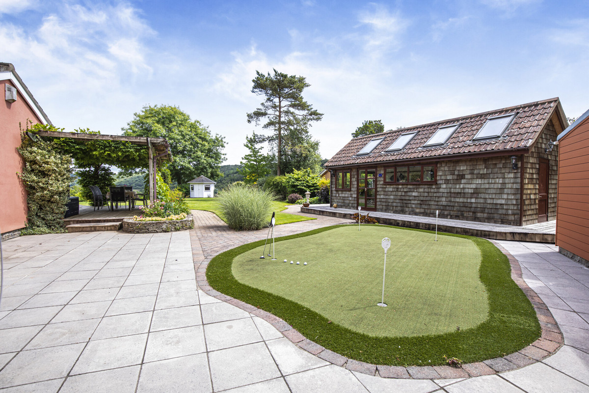 Between the terraces, mature borders burst with colour — a painter’s mix of trees, shrubs and seasonal planting. A small putting green adds a playful touch, especially with Clevedon Golf Club just up the hill, while a nearby heated swimming pool with retractable roof adds a sense of luxury next to a raised terrace. Adjacent to this, an art studio with a shower room offers huge flexibility — ideal as a creative space, garden office, or potential annexe.