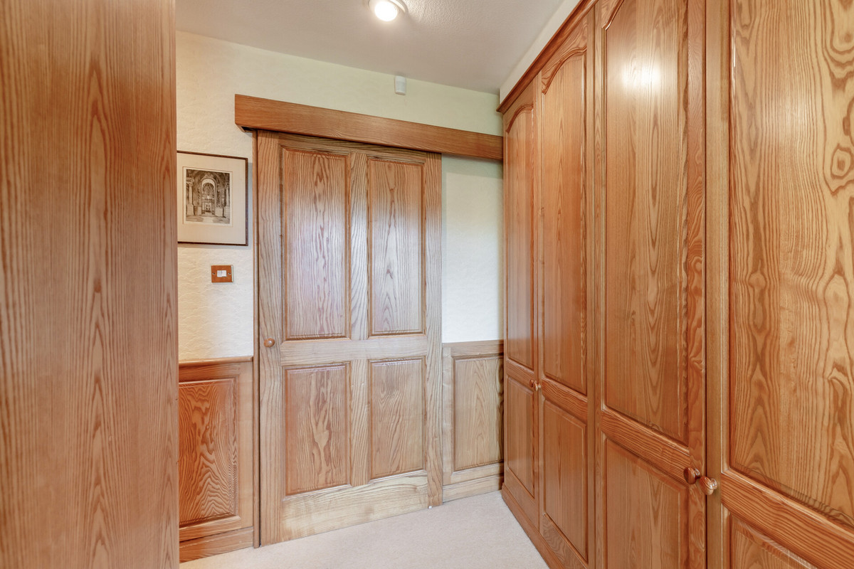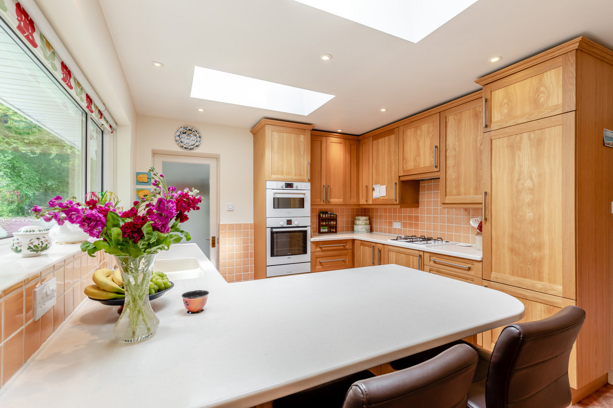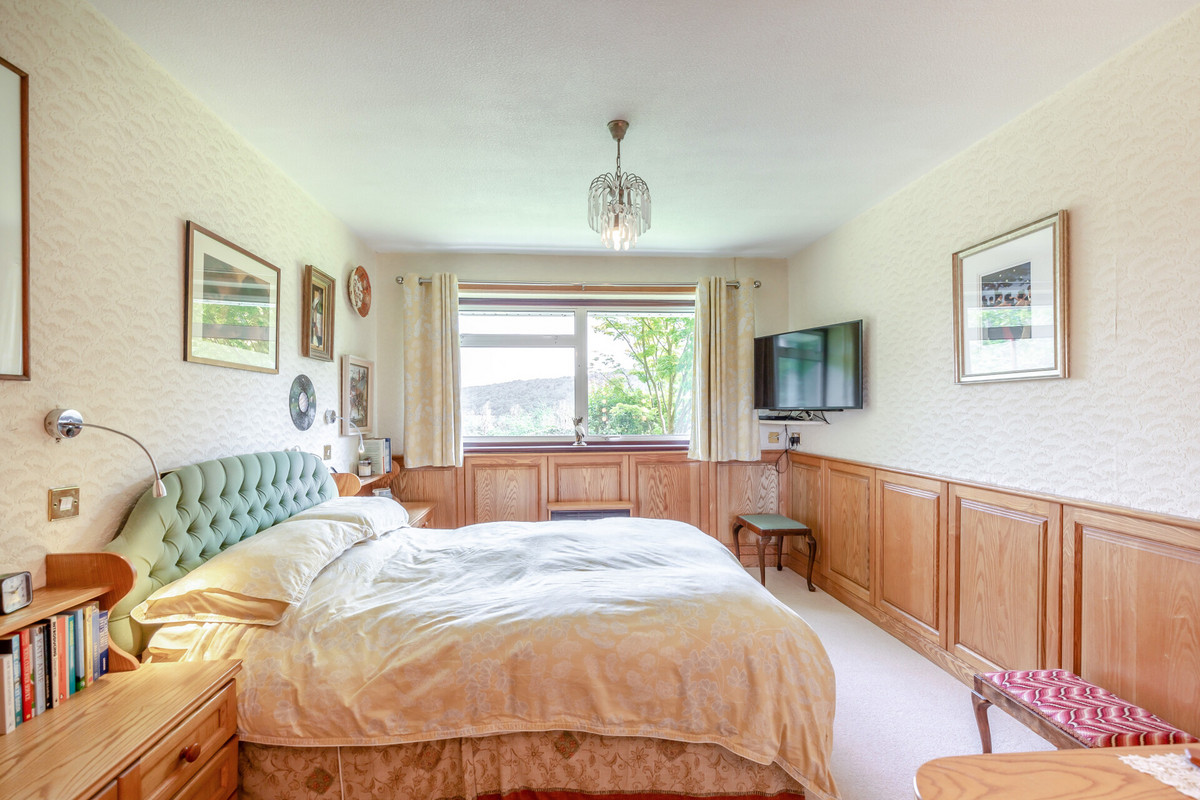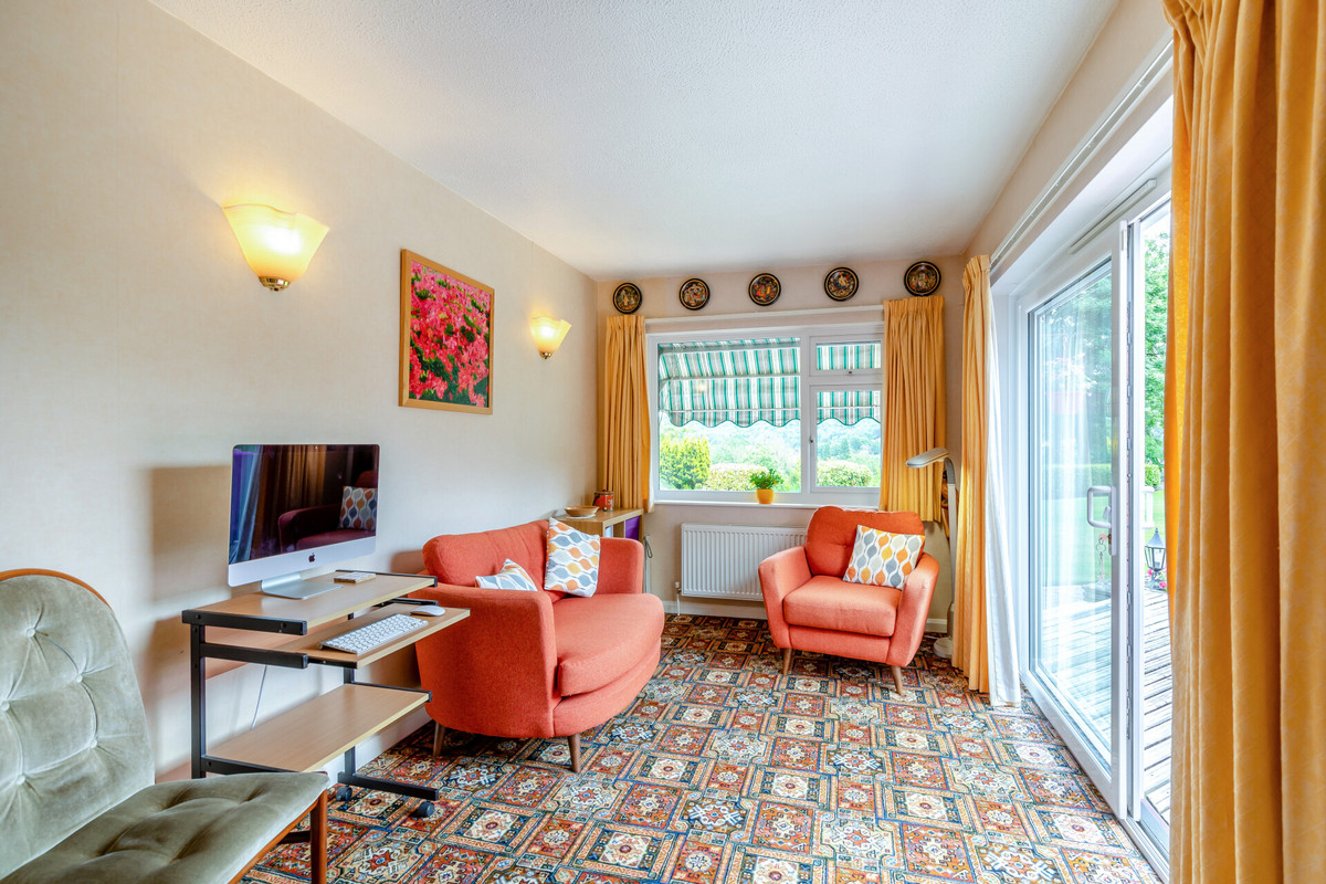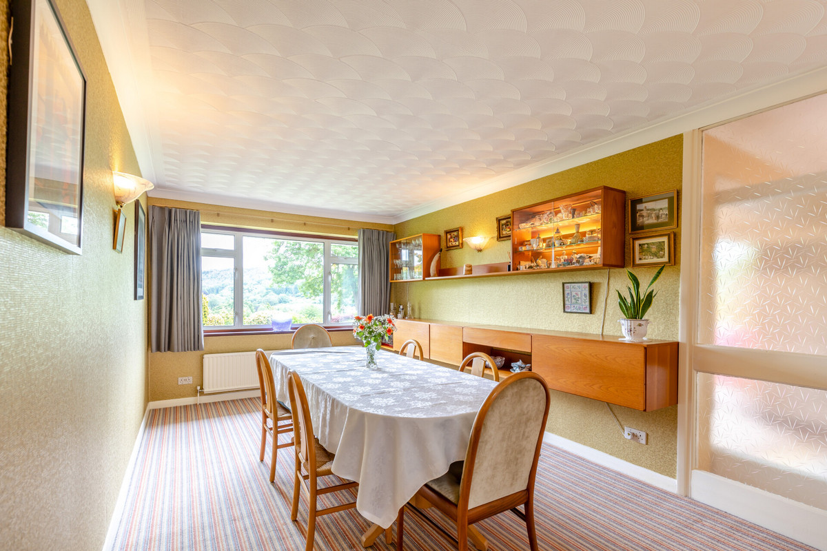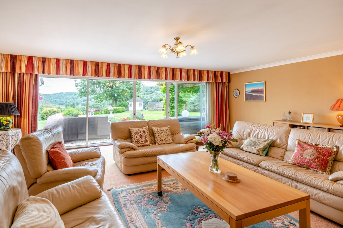 Inside, the layout is bright, balanced, and ideal for modern living. A cosy sunroom or snug offers French doors out to the garden, perfect for reading or enjoying morning coffee. The generous sitting room features a feature fireplace and large sliding patio doors that frame the valley beyond. This flows into a large dining room — perfect for hosting or enjoying family meals — and a stylish kitchen/breakfast room. An unusually large utility room completes the living space and offers practicality.