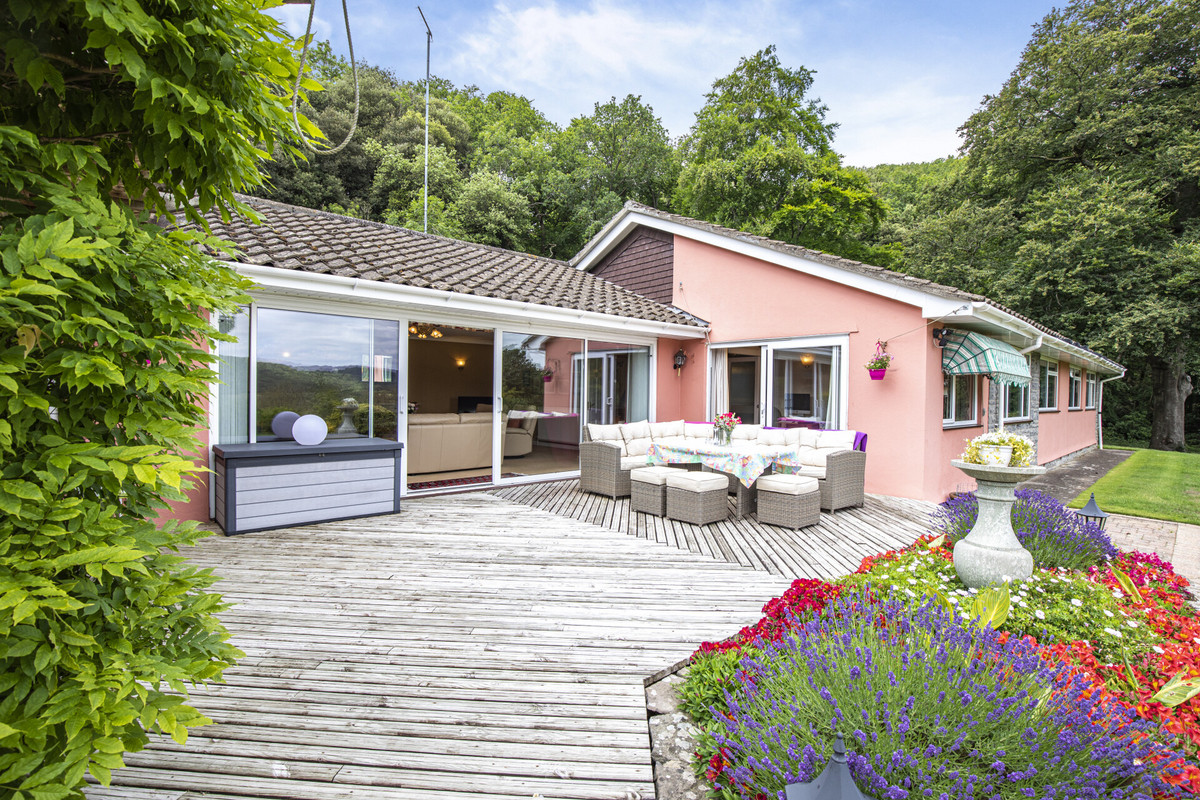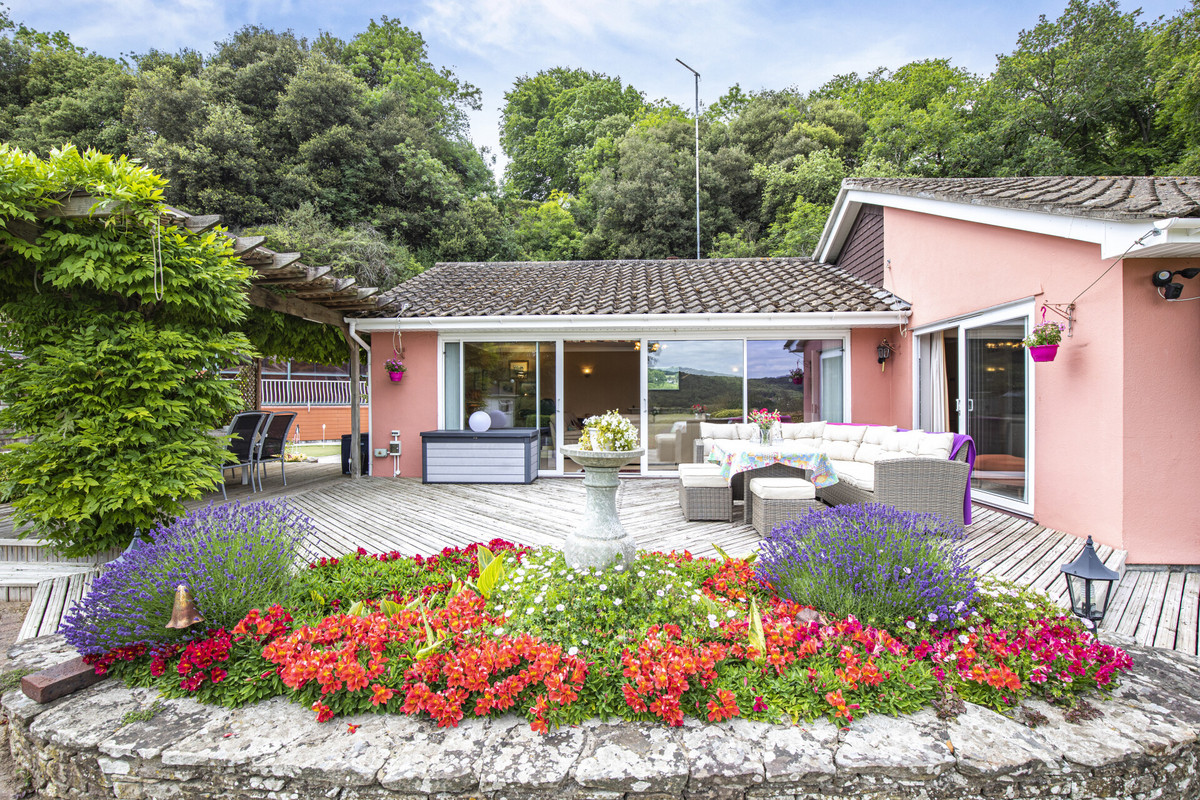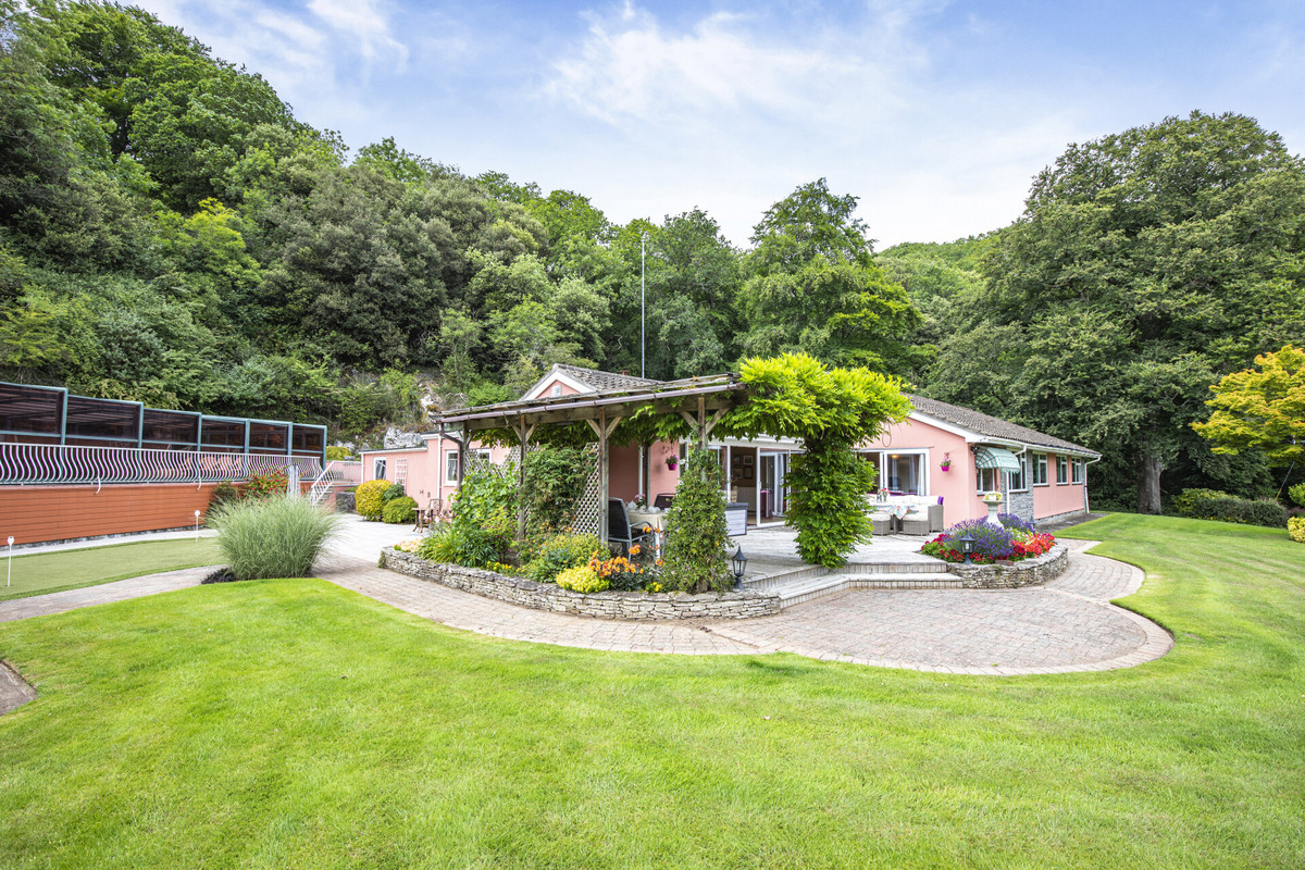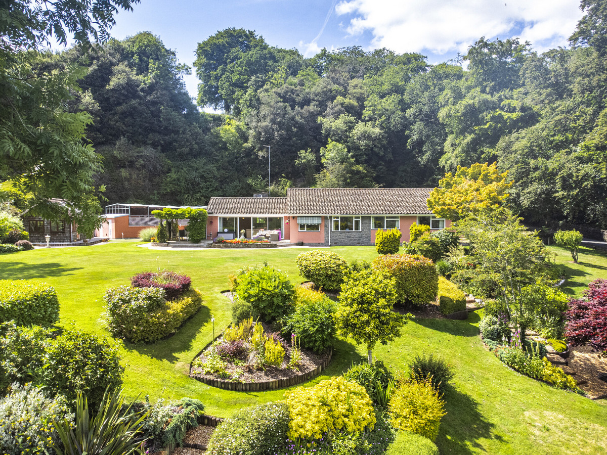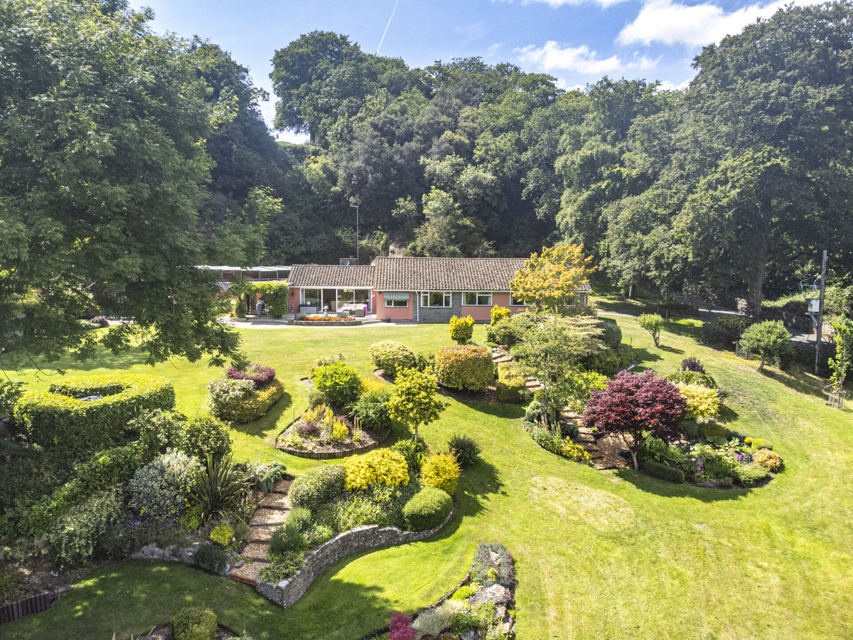 Built in c.1967 and discreetly nestled into the wooded hillside, Fingals is a rare gem — a single-storey home set within a beautifully manicured one-acre plot, with commanding views across the Gordano Valley. Tucked away to the Eastern side of Clevedon, this private retreat offers exceptional outdoor living, generous proportions, and timeless tranquillity.