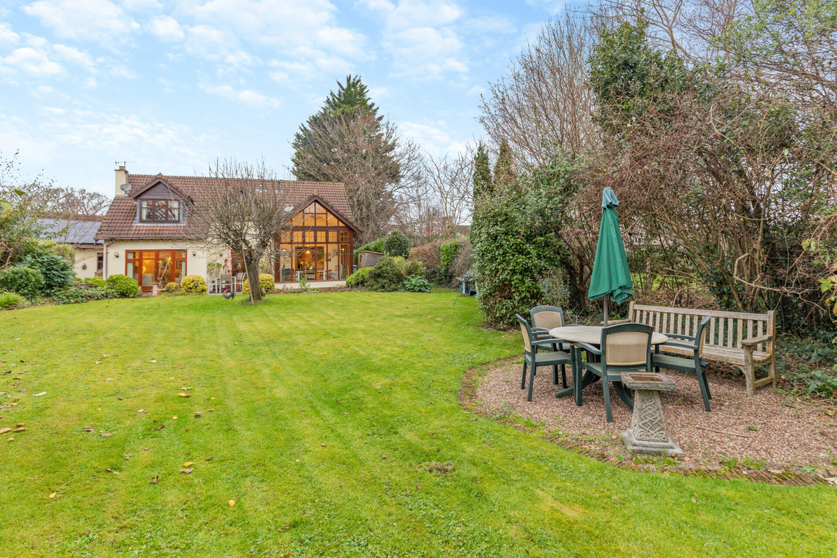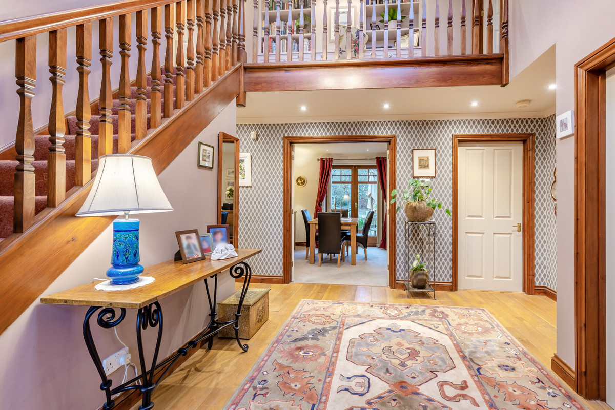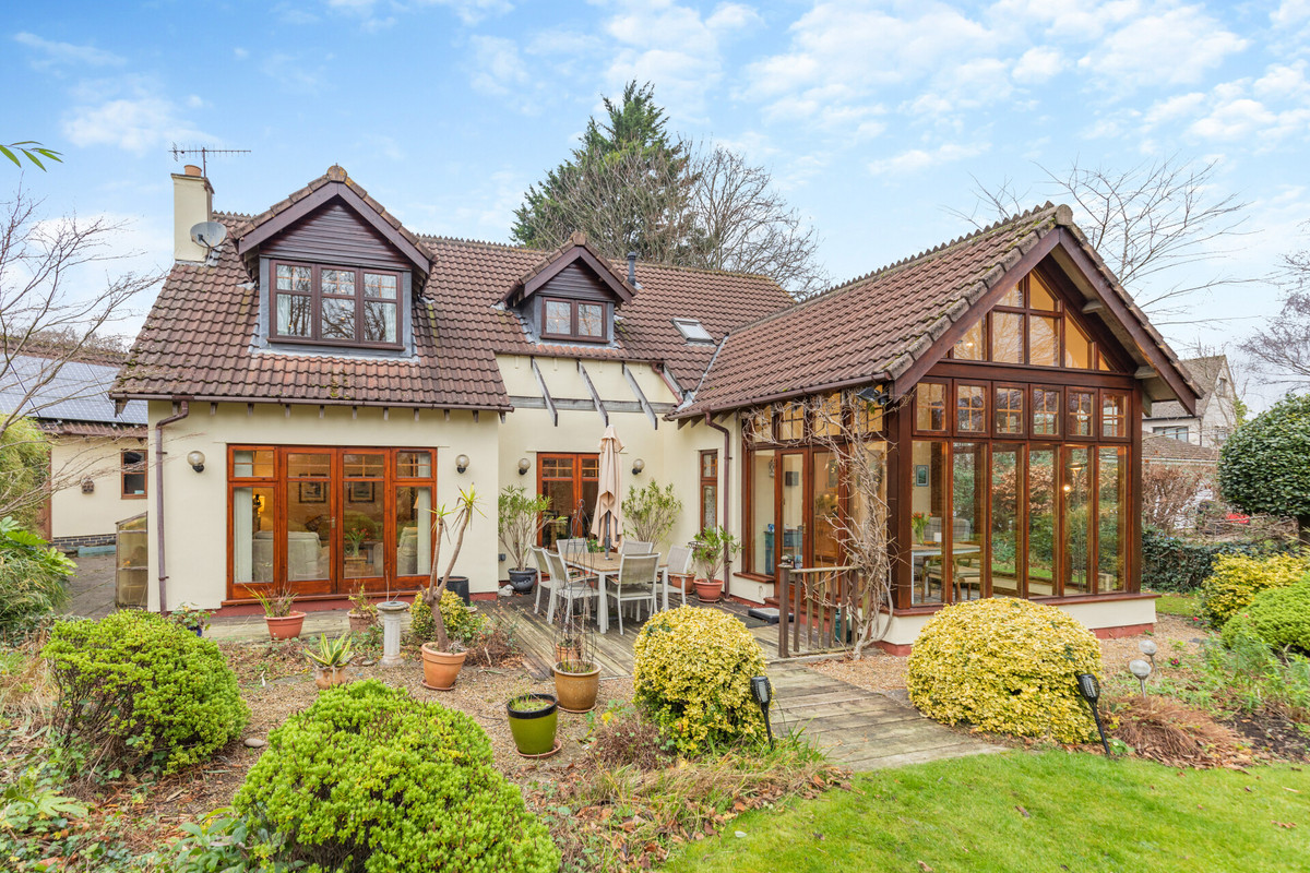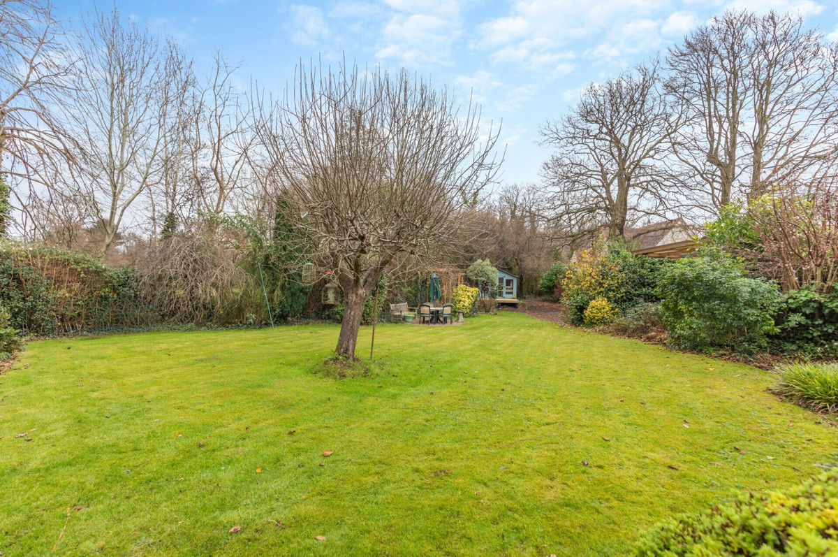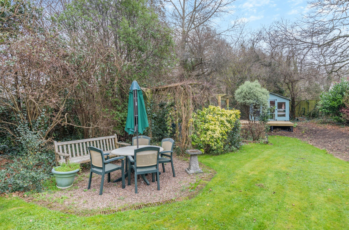 The south-facing rear garden is a tranquil haven, adorned with vibrant shrubs, mature trees, and colourful flower borders. Multiple seating areas invite you to relax or entertain alfresco, while a summerhouse and a section of private woodland add to the enchanting atmosphere.
