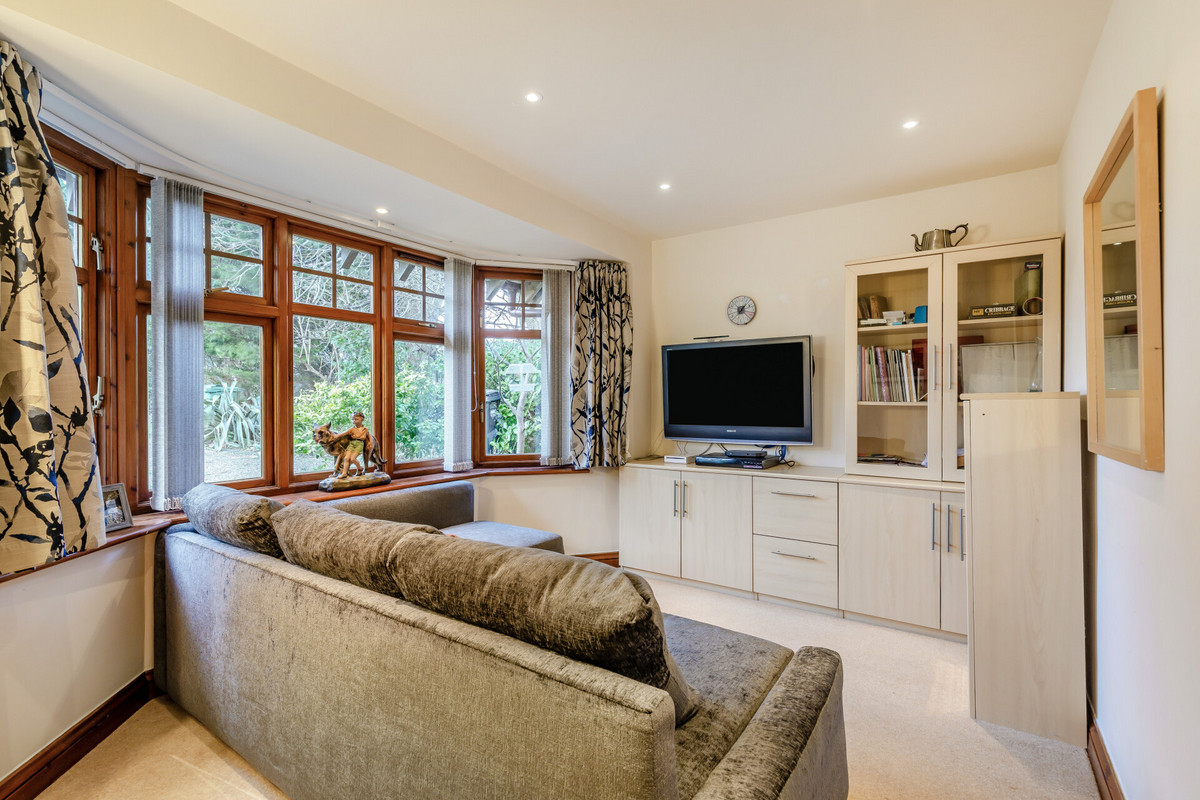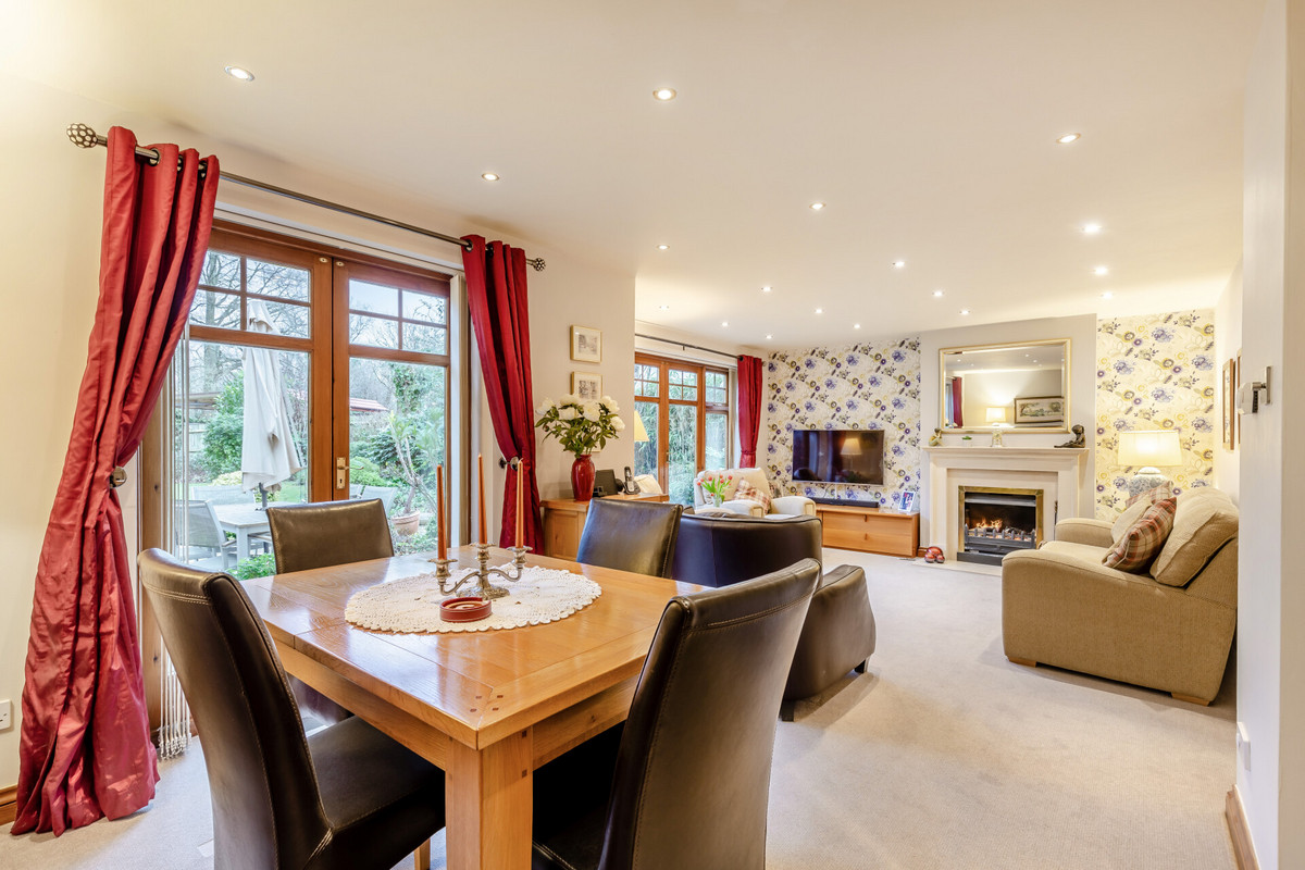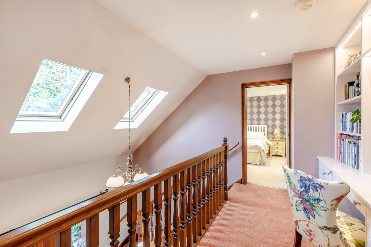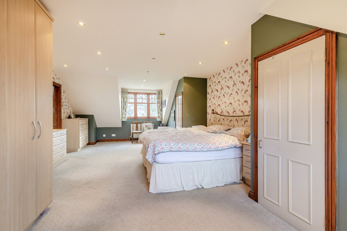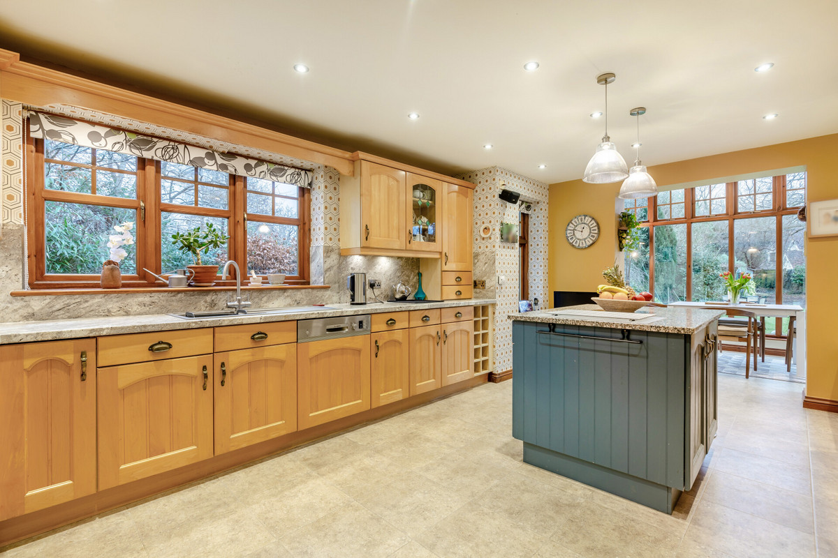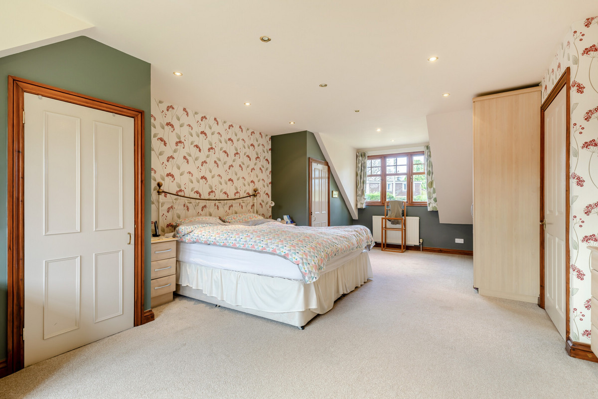 The south-facing rear garden is a tranquil haven, adorned with vibrant shrubs, mature trees, and colourful flower borders. Multiple seating areas invite you to relax or entertain alfresco, while a summerhouse and a section of private woodland add to the enchanting atmosphere.