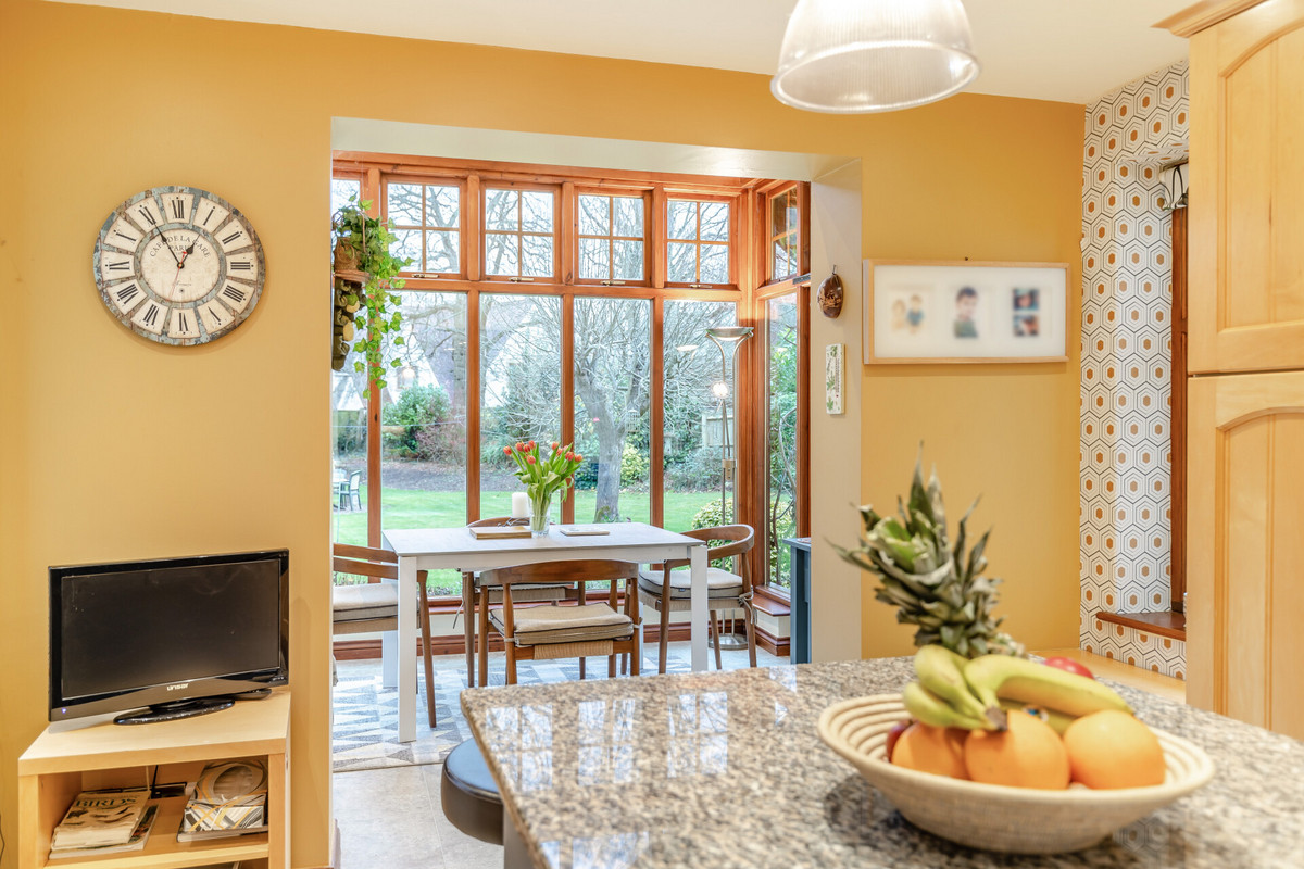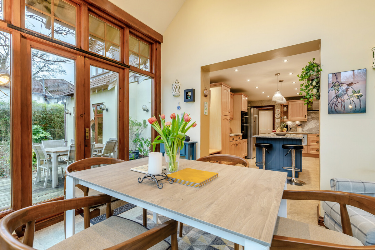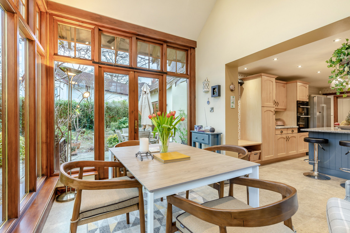 Step inside, and you’re greeted by a stunning galleried hallway that sets the tone for the refinement within. The ground floor offers flexible living spaces, including a large sitting room with a convector stove, space to dine, and French doors that lead out to the rear terrace and gardens. The kitchen breakfast room is a true centrepiece, boasting a central breakfast island with stone worktops, built-in appliances, and a tiled floor. This space flows seamlessly into a breathtaking sun-room, featuring high vaulted ceilings and abundant natural light—perfectly designed to connect you with the outdoors.