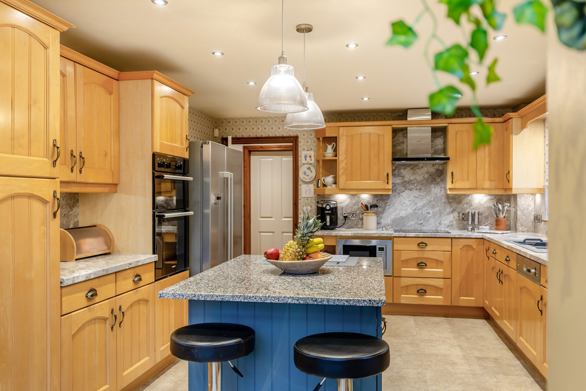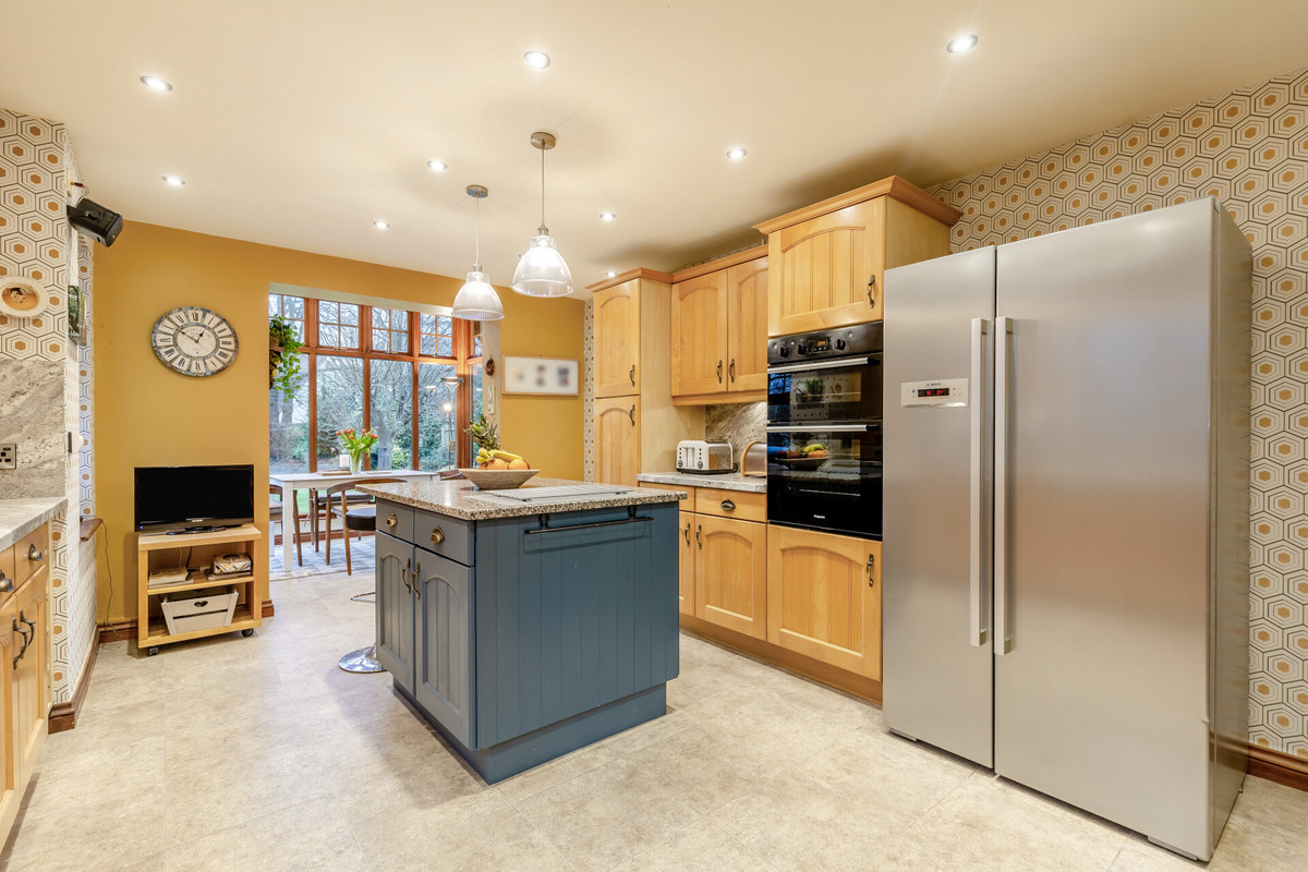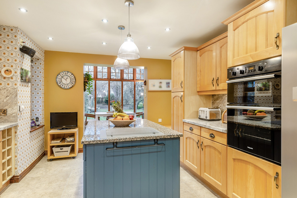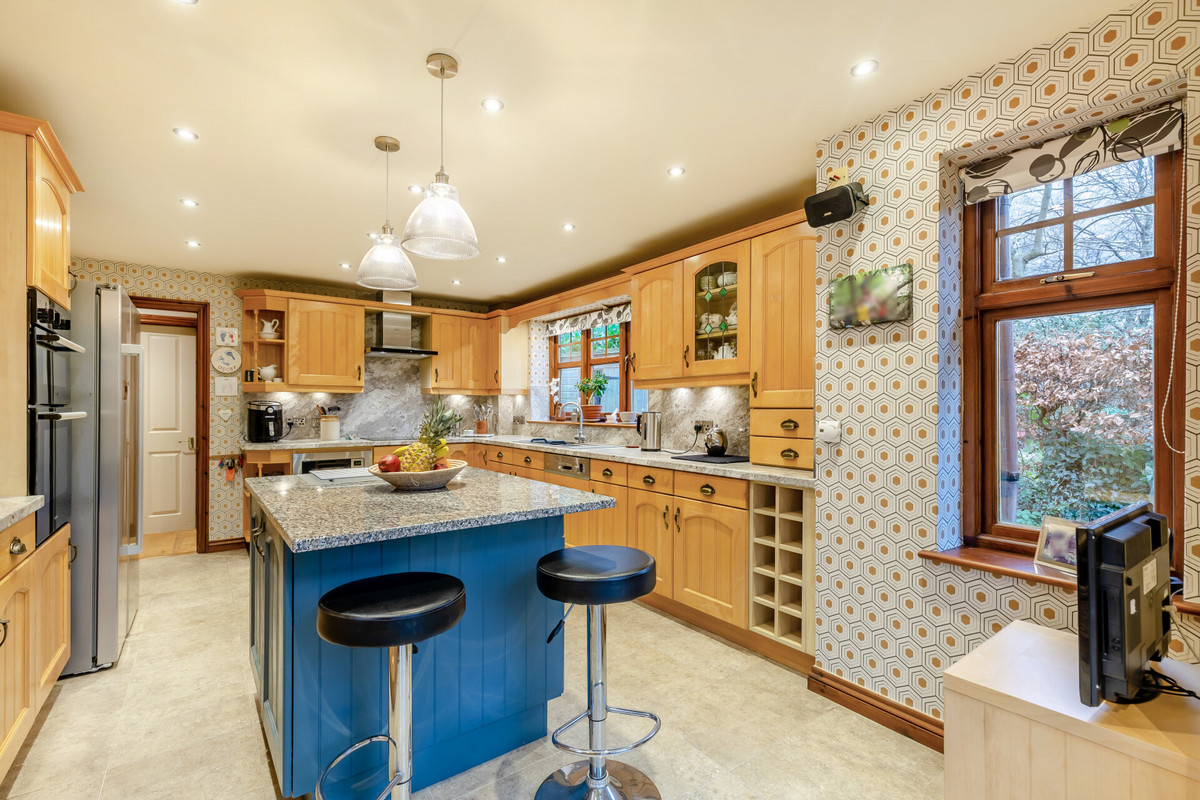 Step inside, and you’re greeted by a stunning galleried hallway that sets the tone for the refinement within. The ground floor offers flexible living spaces, including a large sitting room with a convector stove, space to dine, and French doors that lead out to the rear terrace and gardens. The kitchen breakfast room is a true centrepiece, boasting a central breakfast island with stone worktops, built-in appliances, and a tiled floor. This space flows seamlessly into a breathtaking sun-room, featuring high vaulted ceilings and abundant natural light—perfectly designed to connect you with the outdoors.