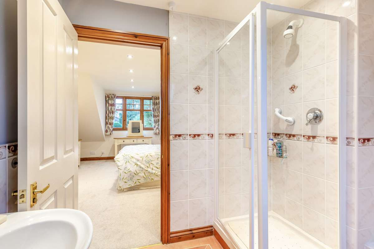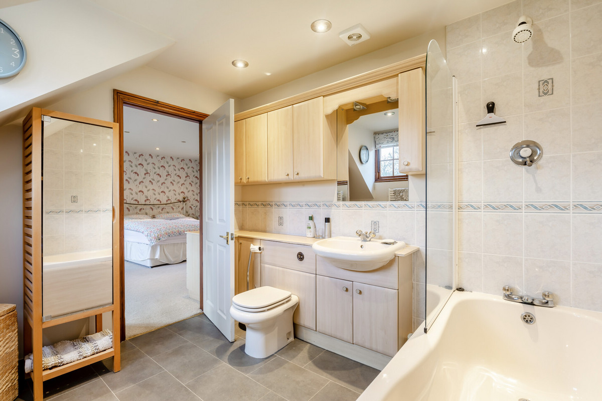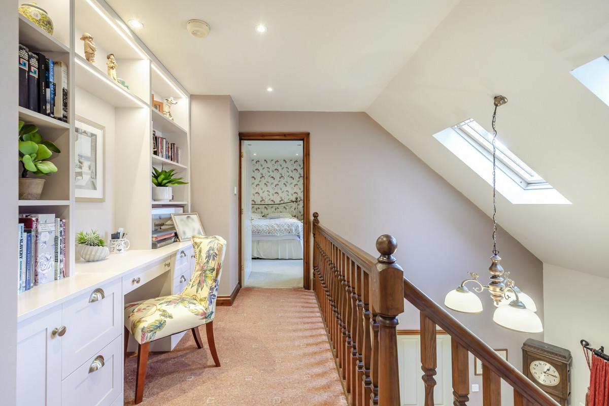 Ascending to the first floor, the gallery landing offers a charming study area, expertly crafted by West Country Wood Design, providing an inspiring space to work or relax. The main bedroom is a generous sanctuary with ample dressing space and a luxurious en-suite. The guest bedroom also benefits from its own en-suite shower room, a walk-in wardrobe, and access to a separate boiler room, adding to the thoughtful layout of this exceptional home.