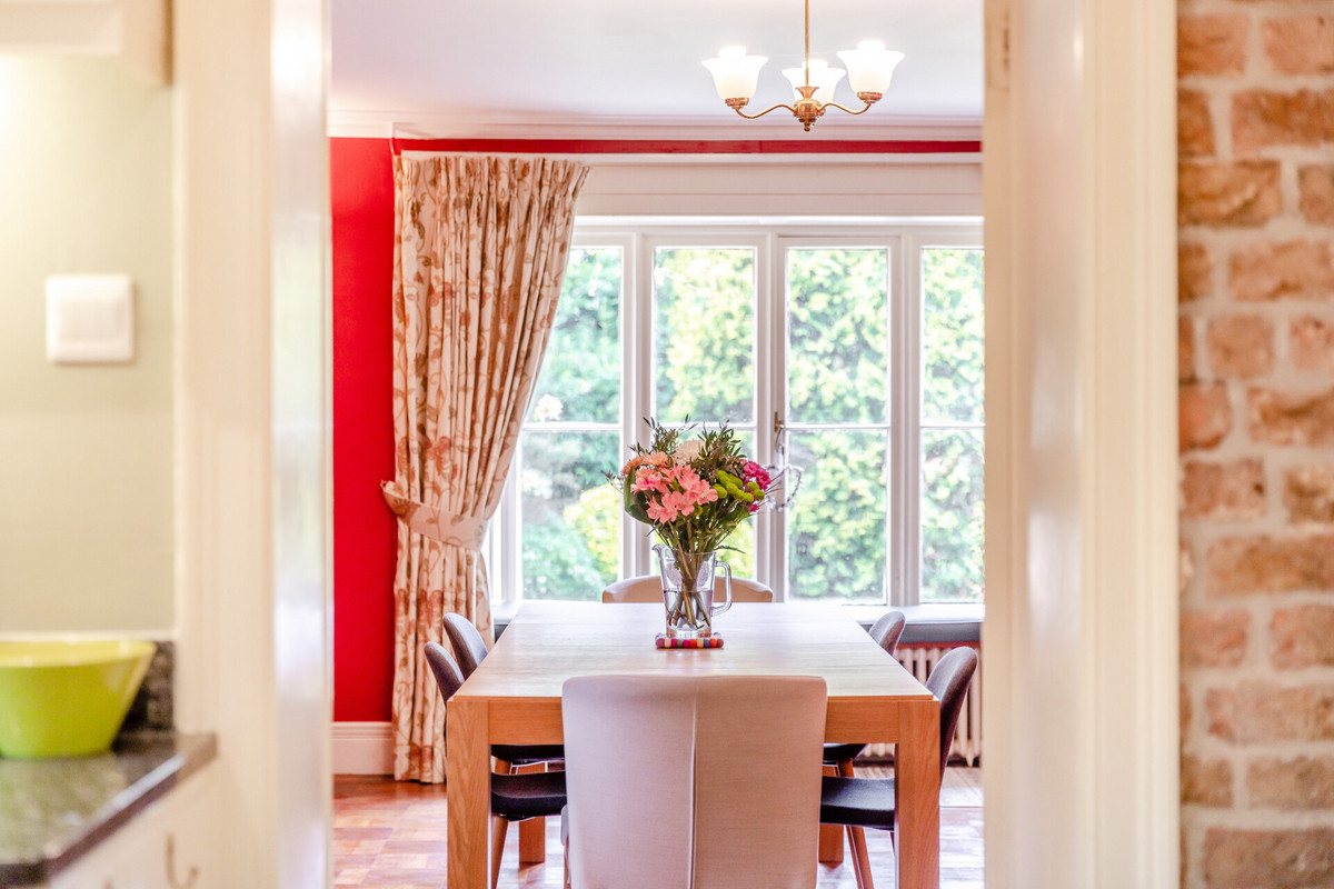 The dining room, with its elegant parquet flooring and second fireplace, feels like the natural heart of the home — a space where a family might gather daily for meals, conversation, and time together. Meanwhile, the kitchen/breakfast room, with views over the gardens, provides a warm and inviting hub, complemented by a walk-in pantry and spacious utility room. Multiple garden access points create a seamless indoor-outdoor lifestyle safe and suitable for young children, pets, or entertaining friends and family.