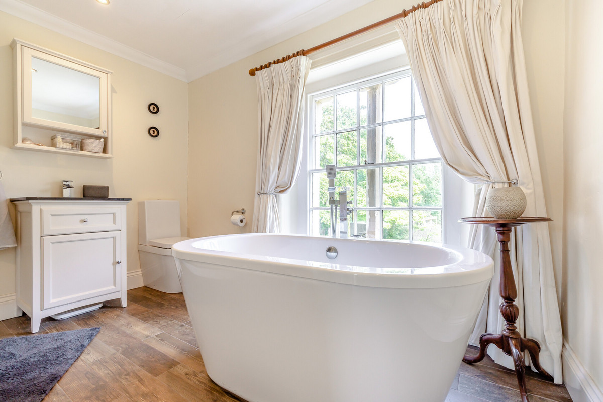 Upstairs, the property offers further flexibility with an east and west wing layout. In the west, the spacious principal suite includes a walk-in wardrobe and ensuite shower room. Alongside is a bright double bedroom — currently used as an artist’s studio — and a peaceful chapel room, perfect for a reading nook or second study. To the east, a generous guest suite with its own ensuite shower room, plus two additional bedrooms, and a luxurious bathroom with roll-top bath and separate shower ensure ample space for family, visitors, or even live-in support if needed.