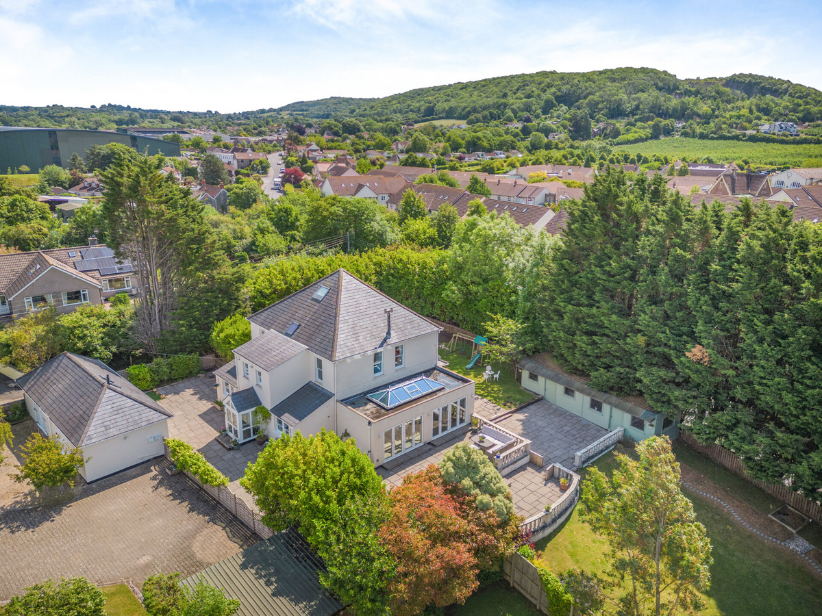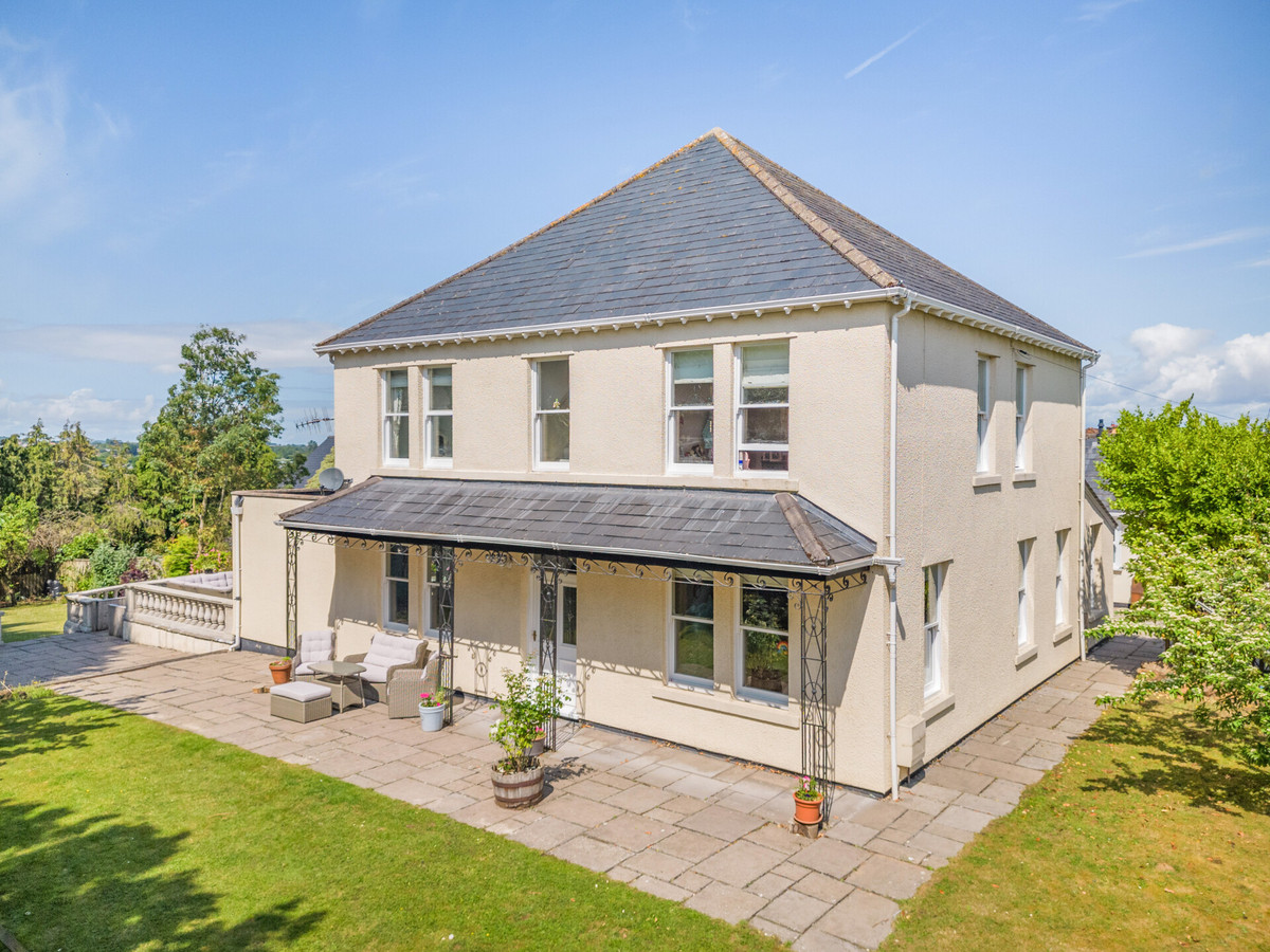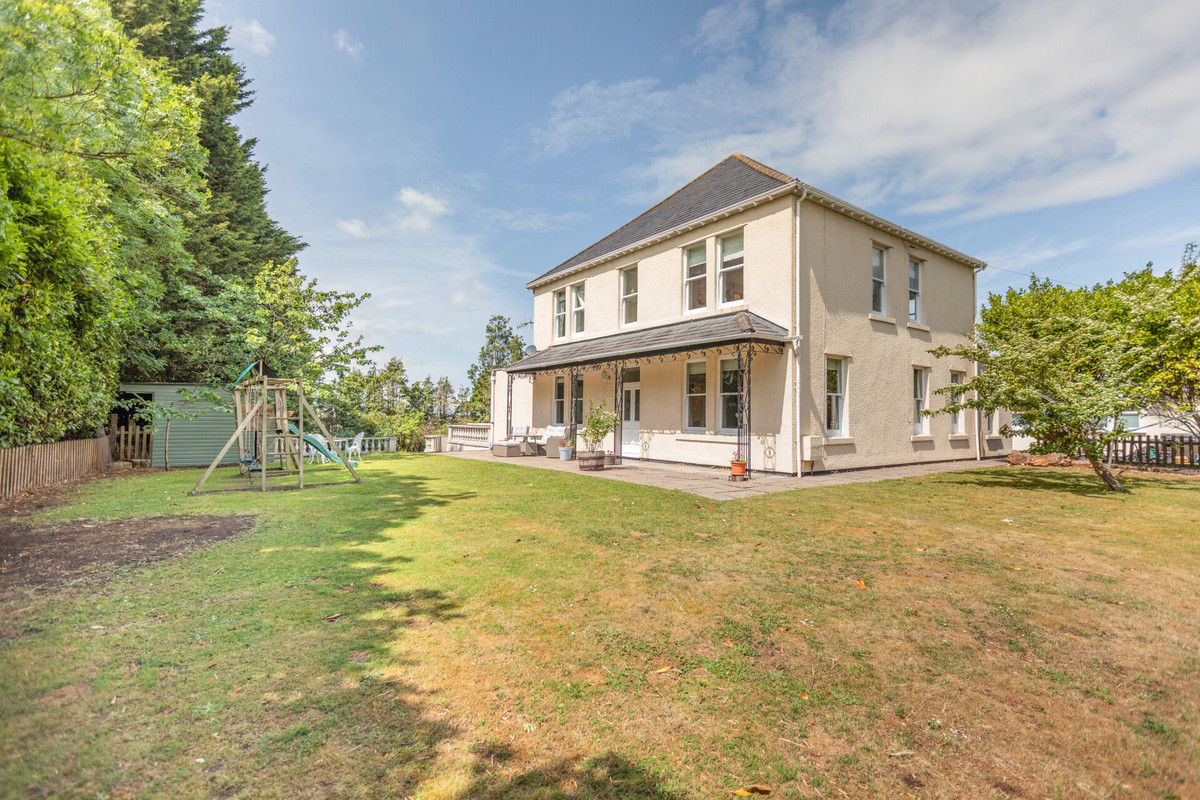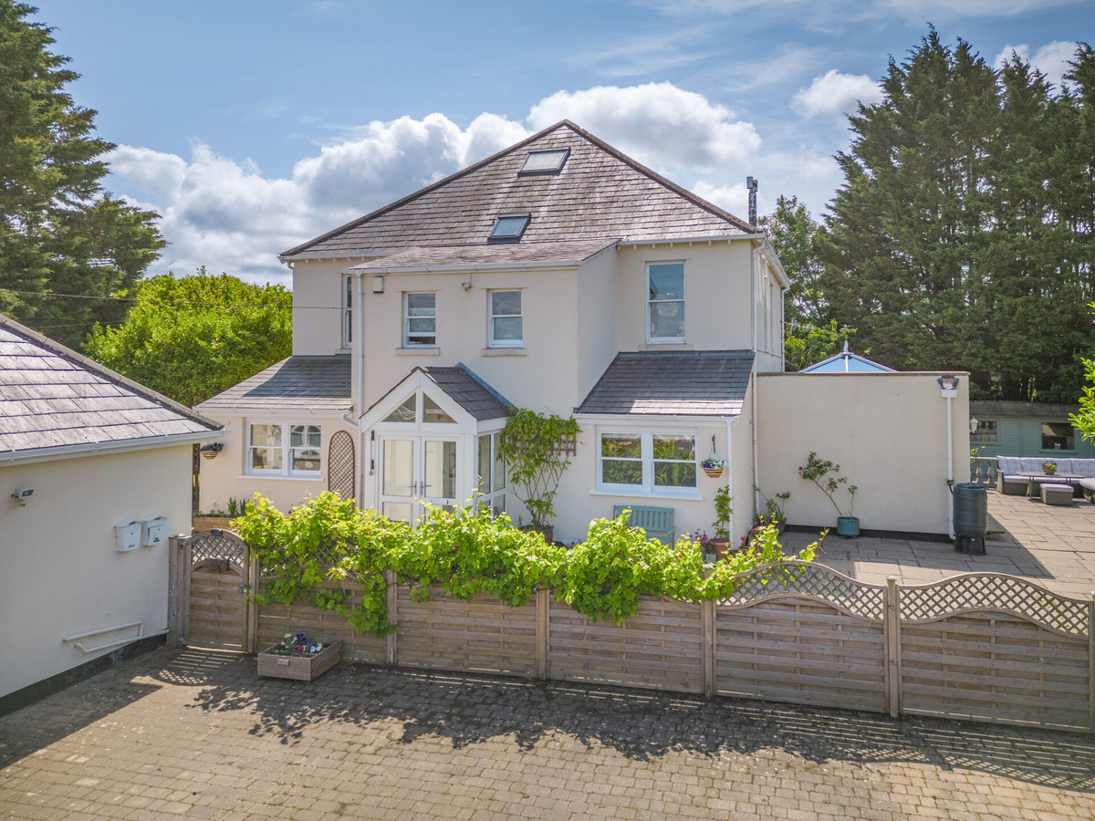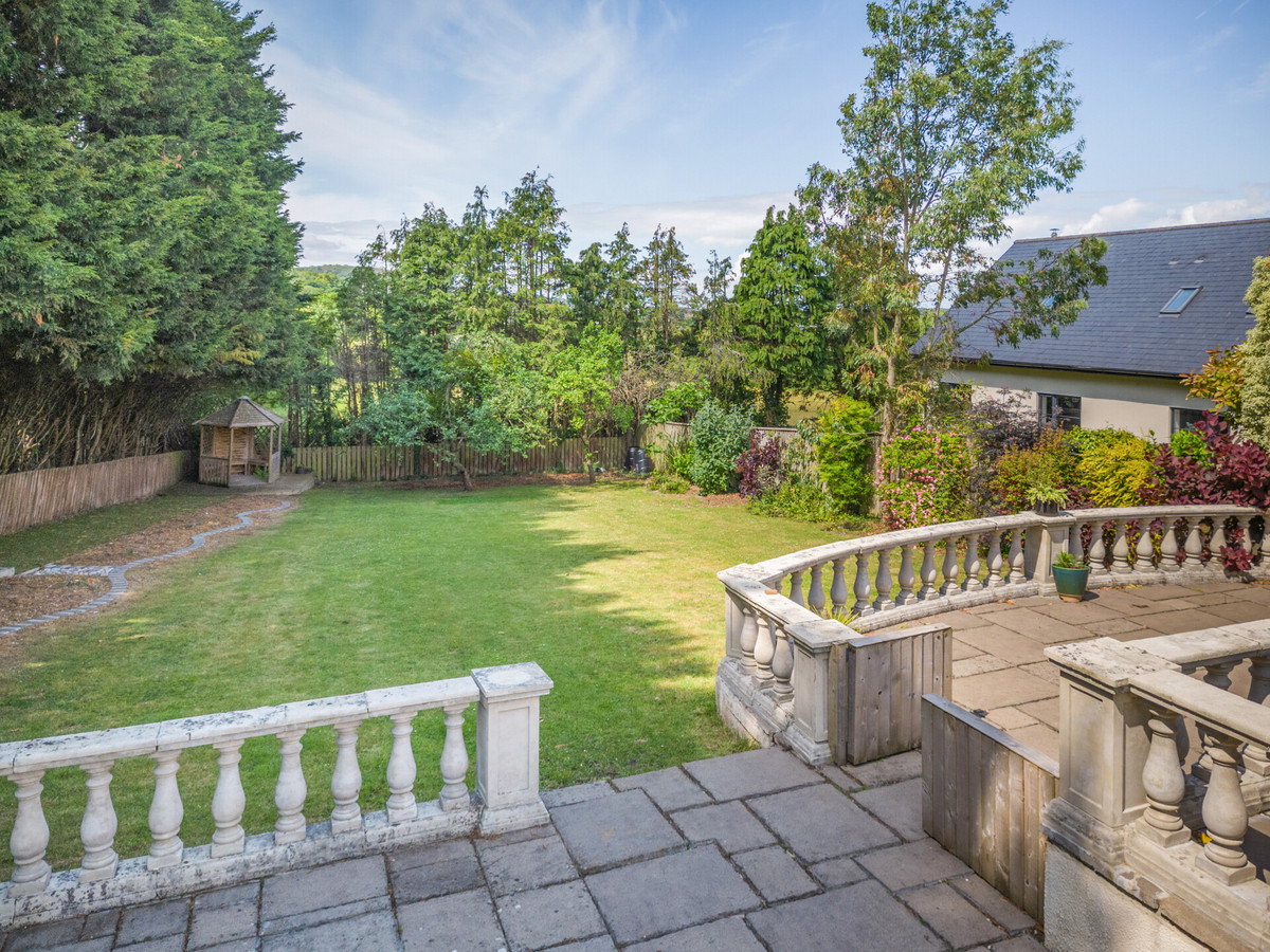 A sweeping driveway leads to ample parking and the main house, which sits proudly within its plot. The grounds are a true highlight, featuring extensive lawns, mature planting, a raised patio terrace for entertaining, and a sloping grass bank with established fruit trees. To the rear, a charming covered porch with intricate ironmongery offers a sheltered garden retreat—ideal for relaxing with a morning coffee or evening drink while soaking in the surroundings.