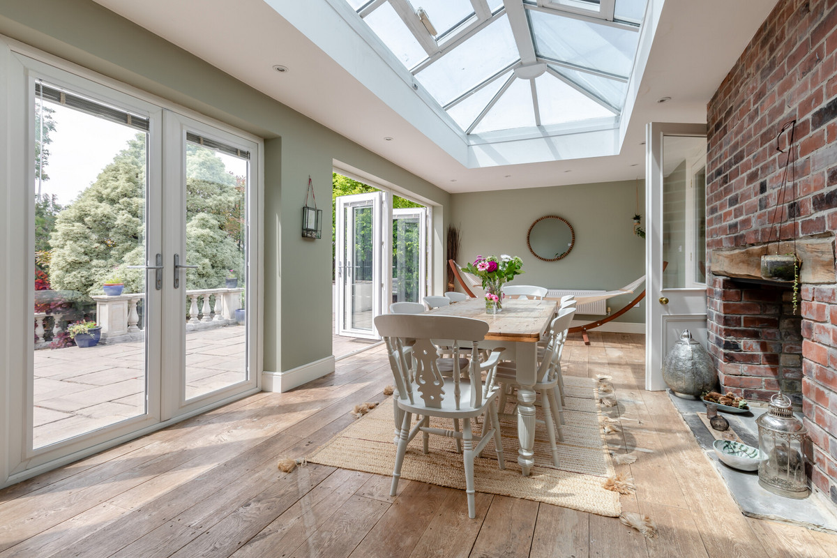 Inside, the home opens into a spacious entrance hall and boot room with a cloakroom. The heart of the house is a traditional wooden kitchen within a kitchen/breakfast room, accompanied by a practical utility room. A large study or playroom adds versatility, while the inviting sitting room—complete with wooden floors and a dual-aspect log burner—connects beautifully to a light-filled orangery with stunning garden views.