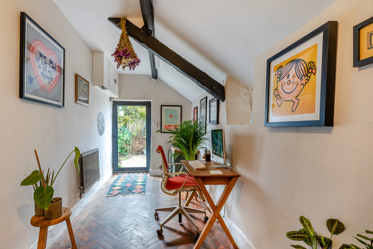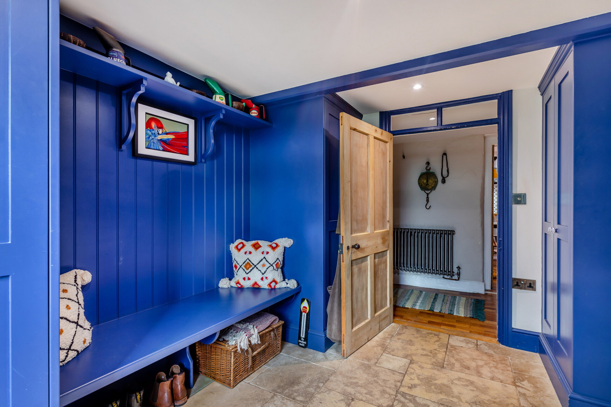 The ground floor features a welcoming boot room with ample storage, perfect for family living and countryside pursuits. A cosy sitting room, with a striking stone fireplace and dual-aspect views of the gardens, provides the ideal setting for relaxed evenings with family and friends. The well-appointed kitchen is thoughtfully designed with high-spec appliances and flows effortlessly into the dining room, which boasts its own charming fireplace for intimate family meals. Additional spaces include a versatile study or hobby room with its own external access and a bright garden room with French doors opening to the grounds. A utility room and a convenient cloakroom complete the ground floor.