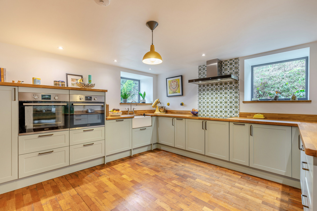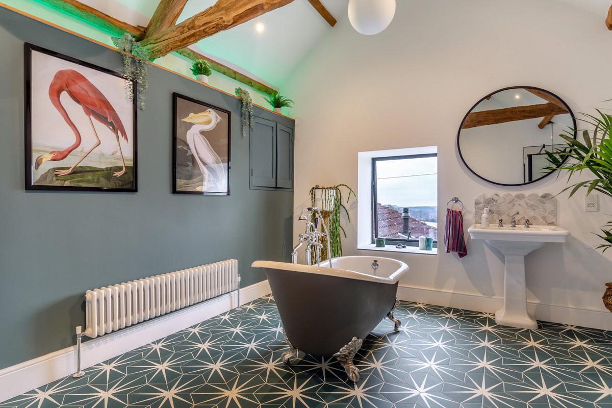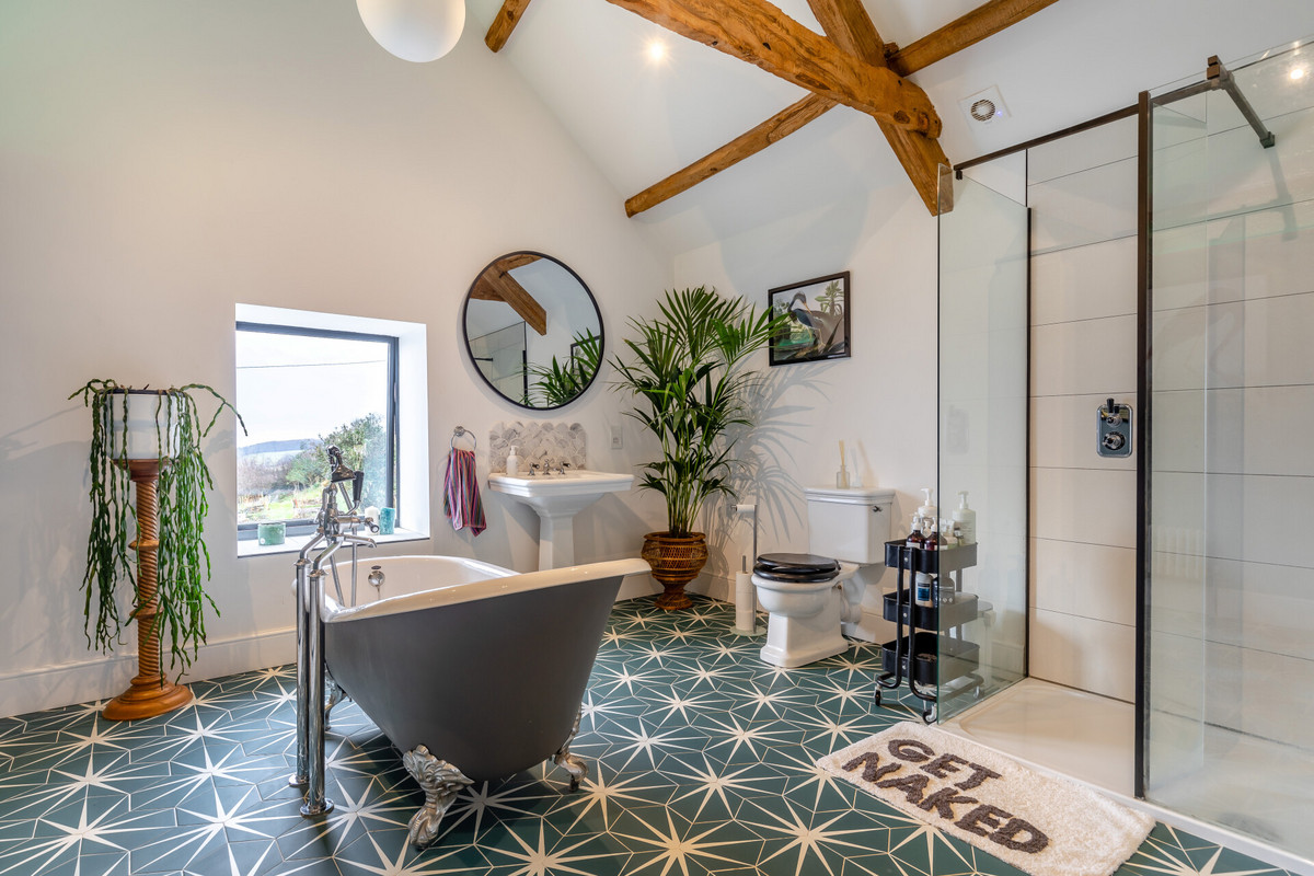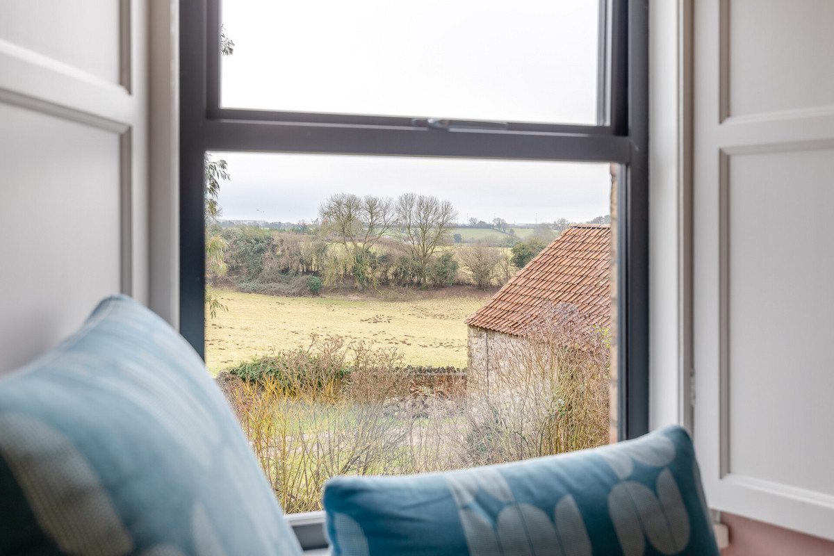 Upstairs, the farmhouse offers three generously sized double bedrooms, each with scenic views of the surrounding countryside. The standout feature is the family bathroom, where a freestanding bath is perfectly positioned to take in the serene views – an ideal retreat for enjoying sunset views in luxurious comfort.