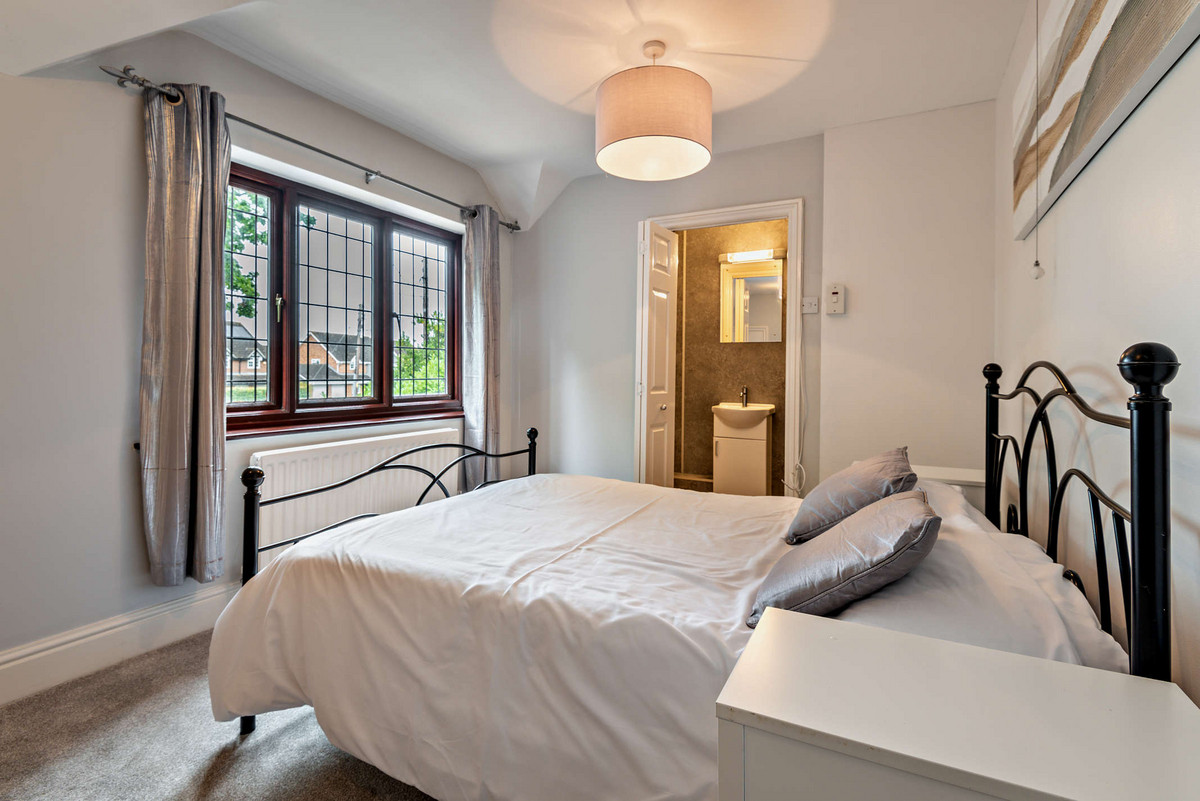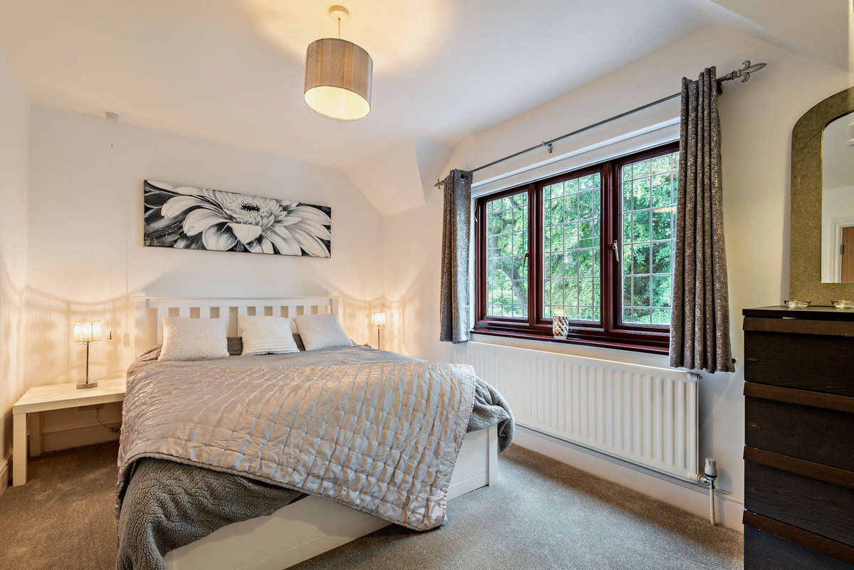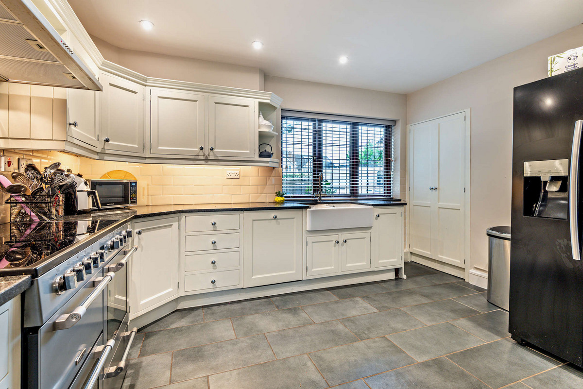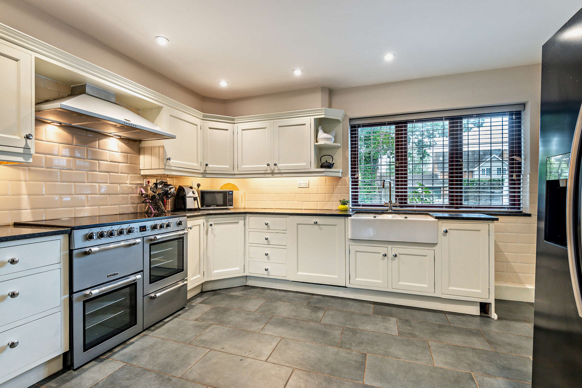The heart of the home, the kitchen/breakfast room, is fitted with high-quality units, granite countertops, and a range cooker. French doors connect this space to the garden room, making it an ideal setting for family gatherings. Adjacent to the kitchen, a study offers a quiet retreat for work or reading.