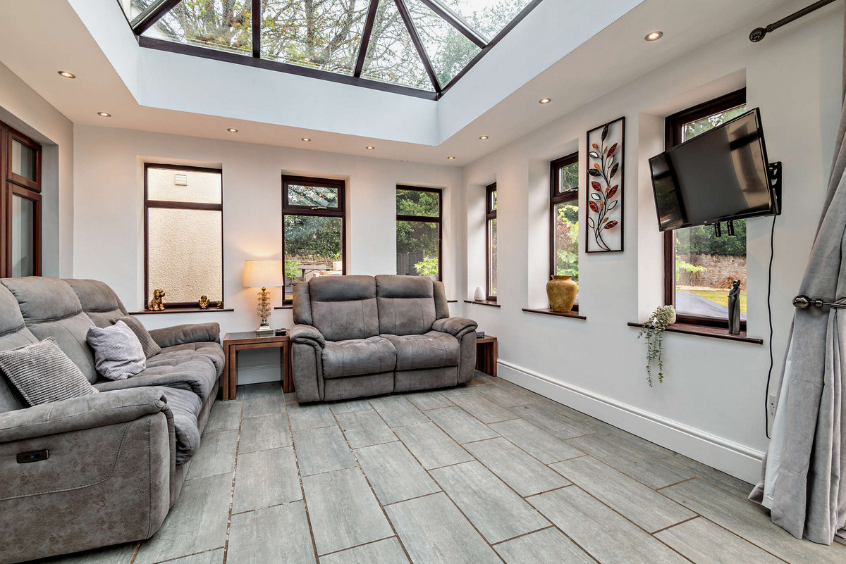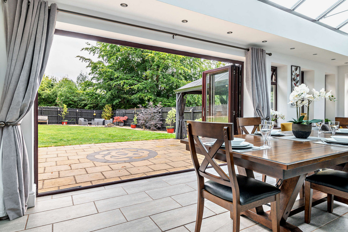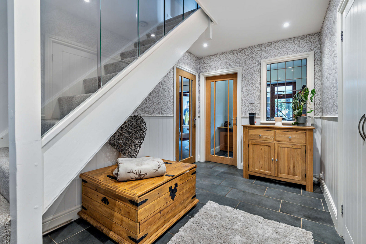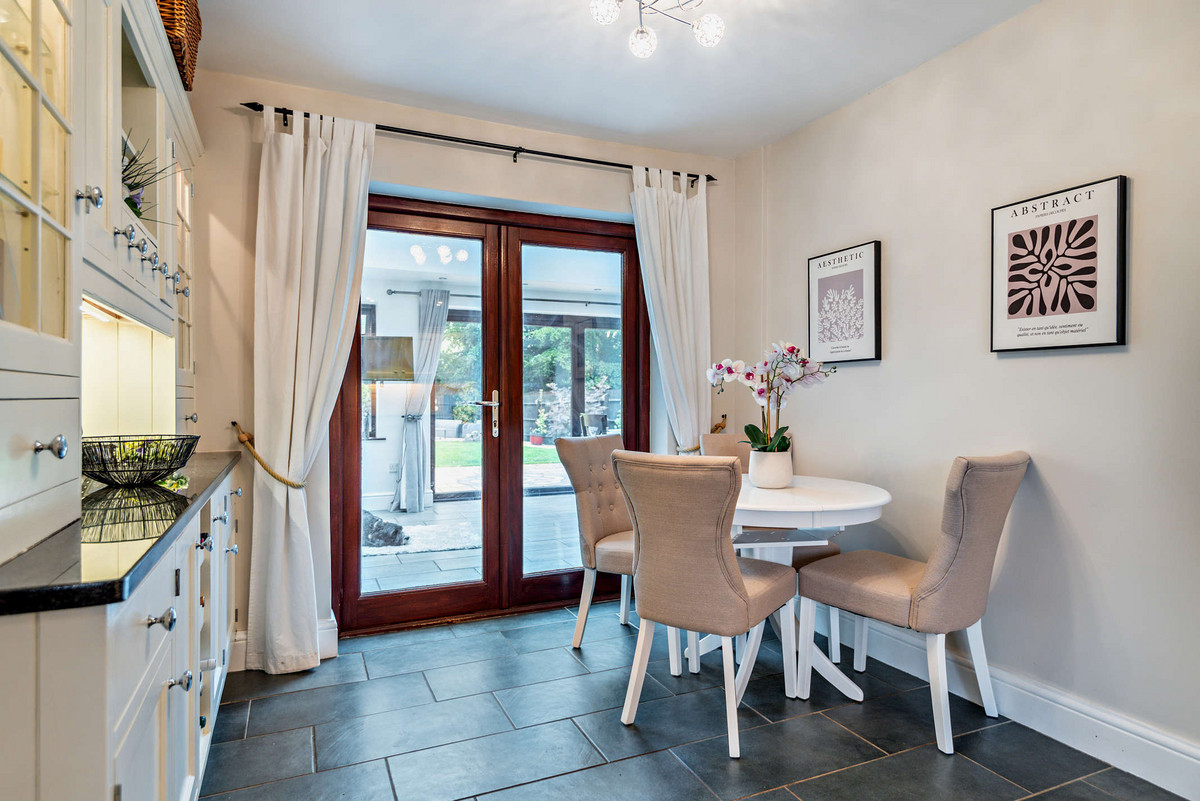 As you approach Ravenscourt, you are greeted by a charming entrance porch that leads into a welcoming entrance hall, where a glazed staircase and ample storage set the tone for the rest of the home. The sitting room, featuring a cozy wood-burning stove and contemporary surround, opens into a stunning garden room that floods the space with natural light. This fabulous addition stretches across the rear of the house, creating a perfect spot for relaxation and entertaining.
