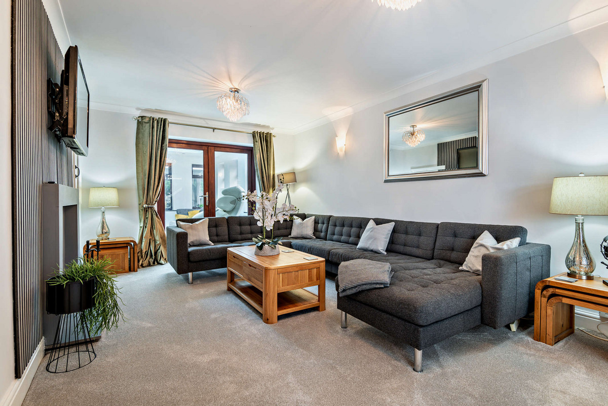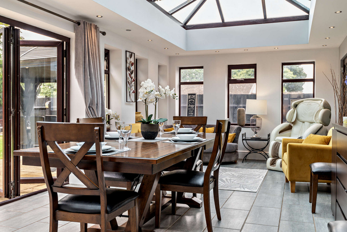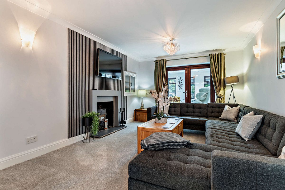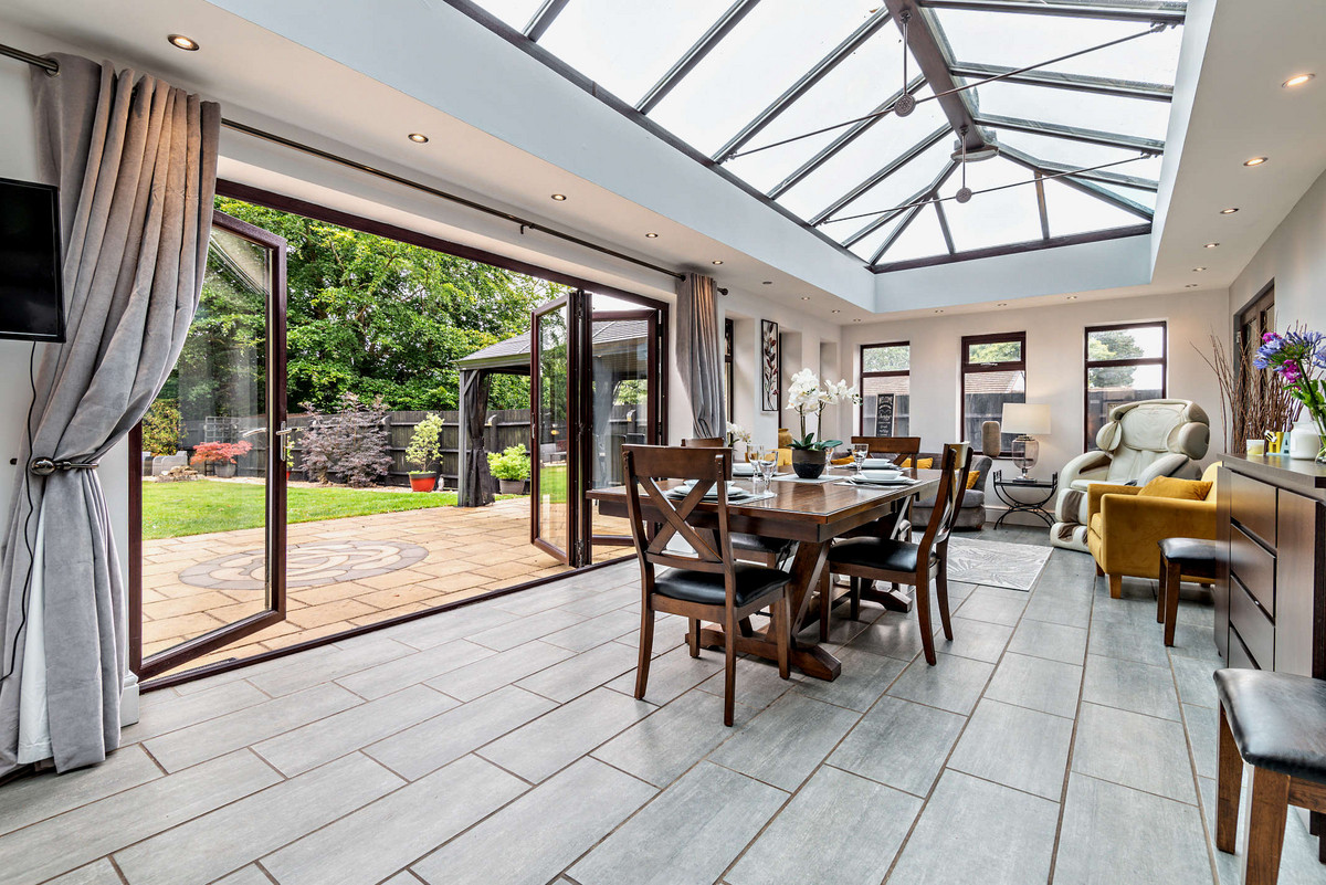 As you approach Ravenscourt, you are greeted by a charming entrance porch that leads into a welcoming entrance hall, where a glazed staircase and ample storage set the tone for the rest of the home. The sitting room, featuring a cozy wood-burning stove and contemporary surround, opens into a stunning garden room that floods the space with natural light. This fabulous addition stretches across the rear of the house, creating a perfect spot for relaxation and entertaining.