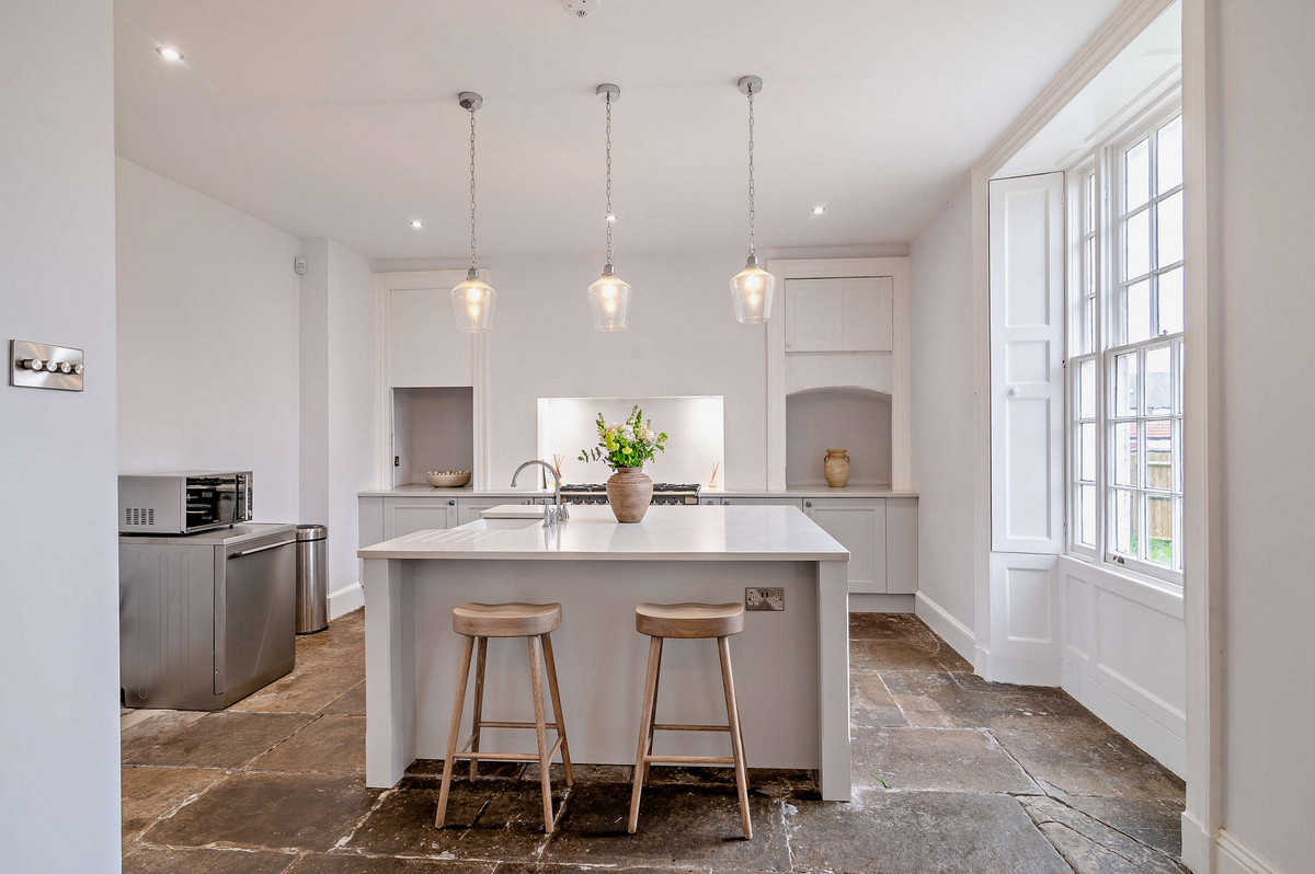 The reception rooms, including a formal dining room with a log burner and a separate sitting room with an open fireplace, offer spaces for both intimate gatherings and moments of relaxation. A large kitchen family room boasts a beautiful kitchen island and large sash windows, providing a perfect blend of functionality and elegance.