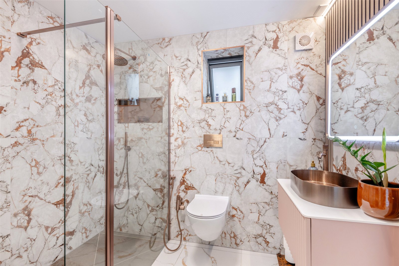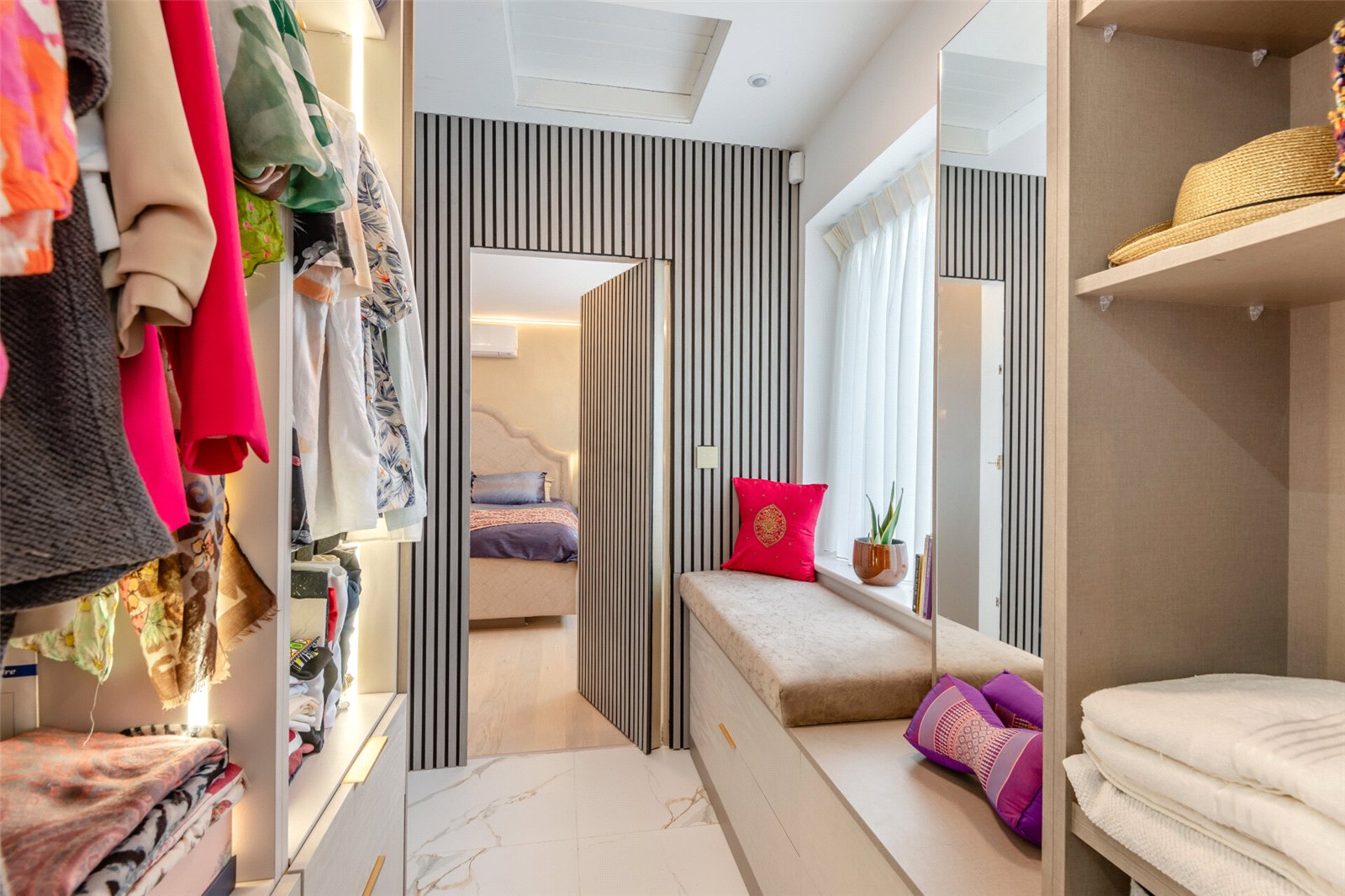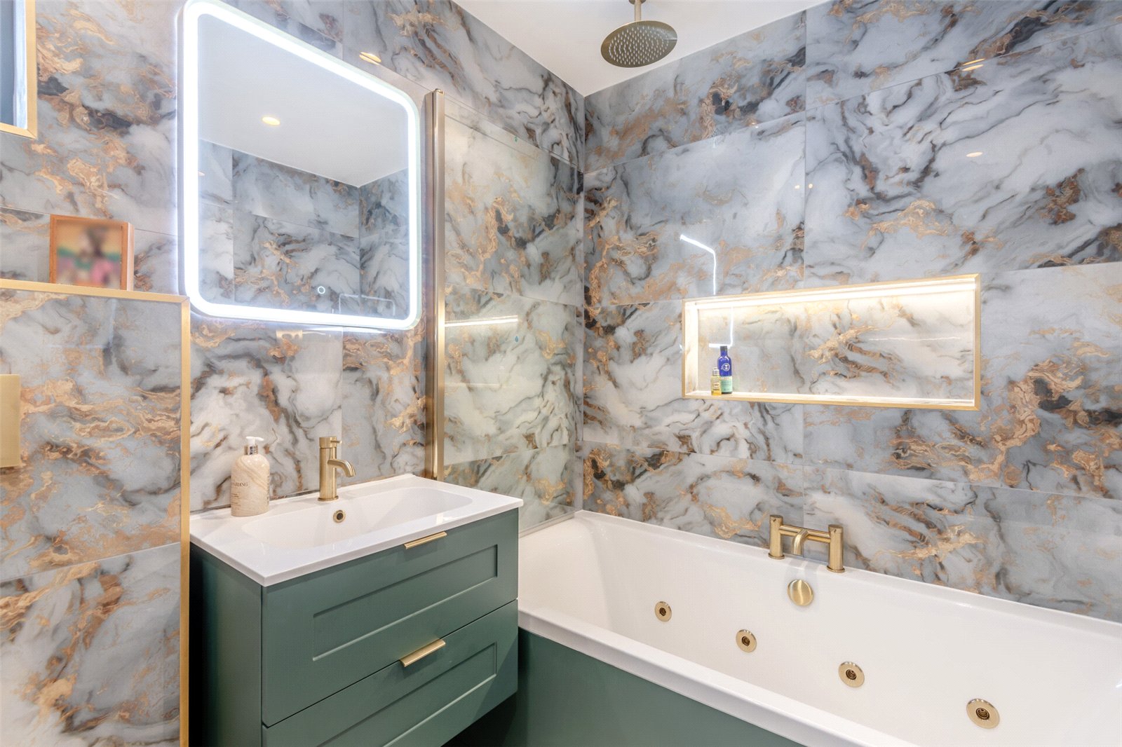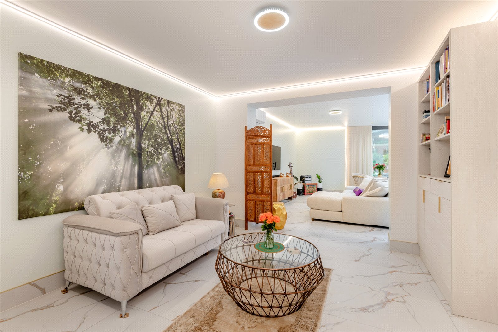 Custom fittings are evident throughout the property, with beautiful porcelain tiles on the ground floor and engineered wood flooring on the first floor. The new wood and glass-panelled staircase leads to three well-appointed bedrooms. The master suite features a separate dressing room and bathroom, while all bedrooms are equipped with quality fitted furniture. The family bathroom and en-suite include underfloor heating, high-quality fixtures and fittings, porcelain tiles, a spa bath, and a steam room/shower. Tasteful decorations and discreet LED lighting with touch-sensitive pads enhance the overall atmosphere.