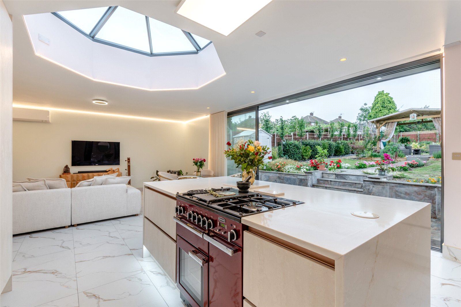 This home has been upgraded to a very high contemporary standard throughout. It features a new extension with a striking octagonal skylight that creates a light and spacious entertaining area. This space includes a stunning custom-built kitchen with a walk-in pantry, floor-to-ceiling cupboards, a Gas/Electric Rangemaster, and a quartz-topped central island. Triple floor-to-ceiling sliding doors provide a seamless transition to a tiled patio and a beautifully landscaped rear garden.