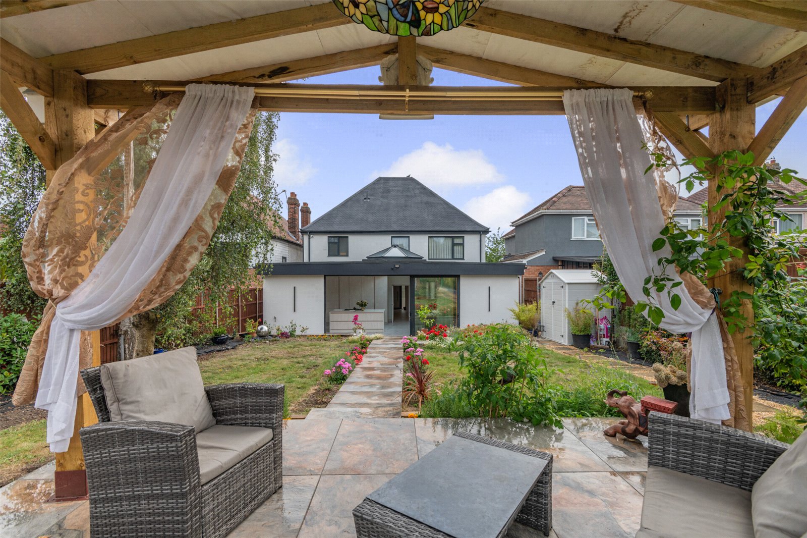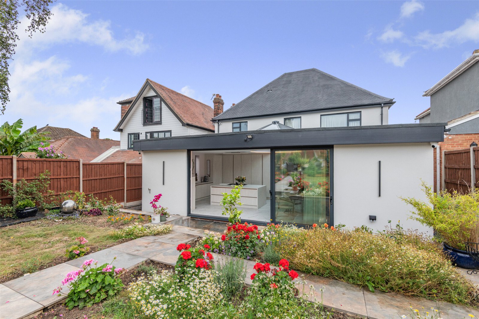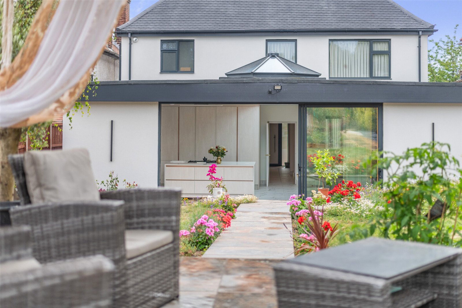 This unique home is set back from the road, with a green area leading to the driveway. The front of the house has been architecturally remodelled to feature a contemporary and imposing design that complements the stylish interiors. All interior windows and doors have been replaced, and a new heating system with feature radiators on the first floor and underfloor heating on the ground floor has been installed. This stunning home is light and airy, offering well-proportioned rooms with ample modern family living space, located in a highly desirable position close to all amenities, schools, and major routes.