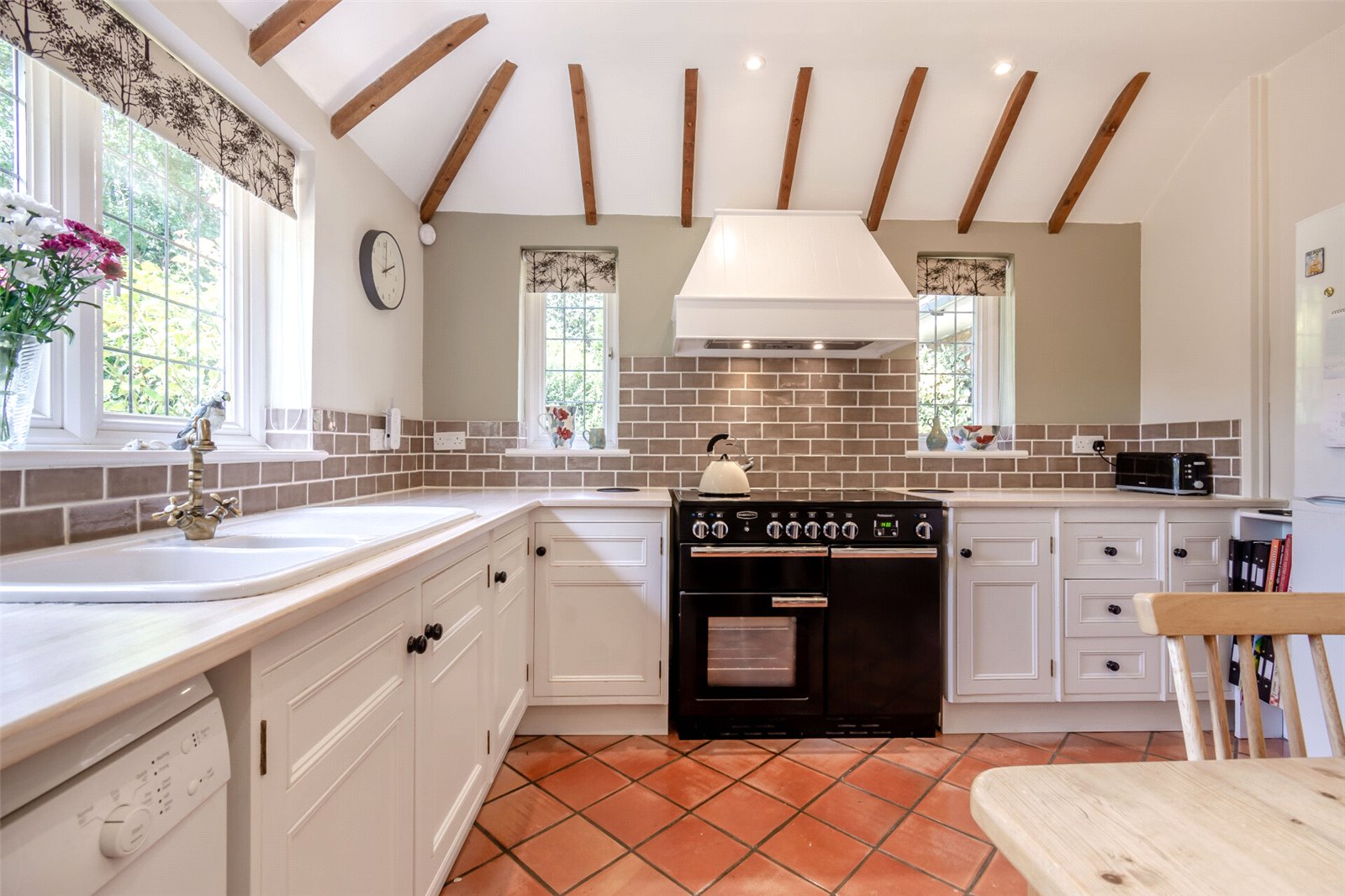 This delightful, semi-detached 17th century cottage bordered on three sides by secluded mature grounds. This was originally the farmhouse that was converted into two farm workers cottages in the 1800s, remodelled extensively in the 1970s and extended by the present owner in the 1990s. The tiled entrance hall has practical utility boot room and a shower room and wc. The kitchen/breakfast room overlooks the garden and has solid wood worksurfaces and ample storage with walk-in larder and Rangemaster cooker. The original entrance hallway is now in the centre of the house with door leading onto patio and gardens. This provides access to the double aspect lounge with beamed ceilings and brick fireplace with multi fuel stove. A separate double aspect dining room has built-in period dresser and a separate study.