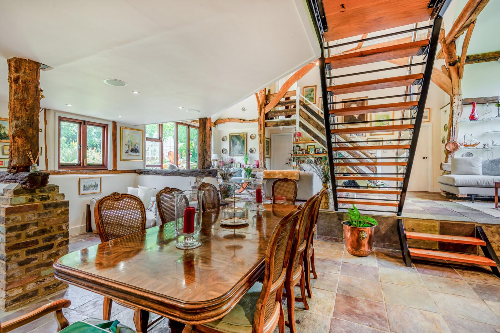 We lived in an urban location but, due to an increase in traffic volume, it was taking longer and longer to reach my place of work. I had a long held desire to live in the countryside, and discovering this fabulous barn in this wonderful rural location, whilst enabling easy access to both the M25 and M20, ticked all my boxes. In addition, local stations provide quick and efficient service into the capital, or to the coast. The traditional historic charm, of the barn has been cleverly retained in this fabulous home, whilst providing a relaxed and companiable ambience throughout. Its large windows enable natural light to flood through and having such an outlook into the surrounding garden adds to its magic. Whilst here, I have enhanced the comforts and enchantment of the barn, and its cleverly zoned open plan living space has been ideal. A fabulous home in which to enjoy the company of friends and family, particularly when grandchildren are around as they commandeer the mezzanine as their special place. In addition, when my wife became very ill, being mostly on one level, was a huge advantage.