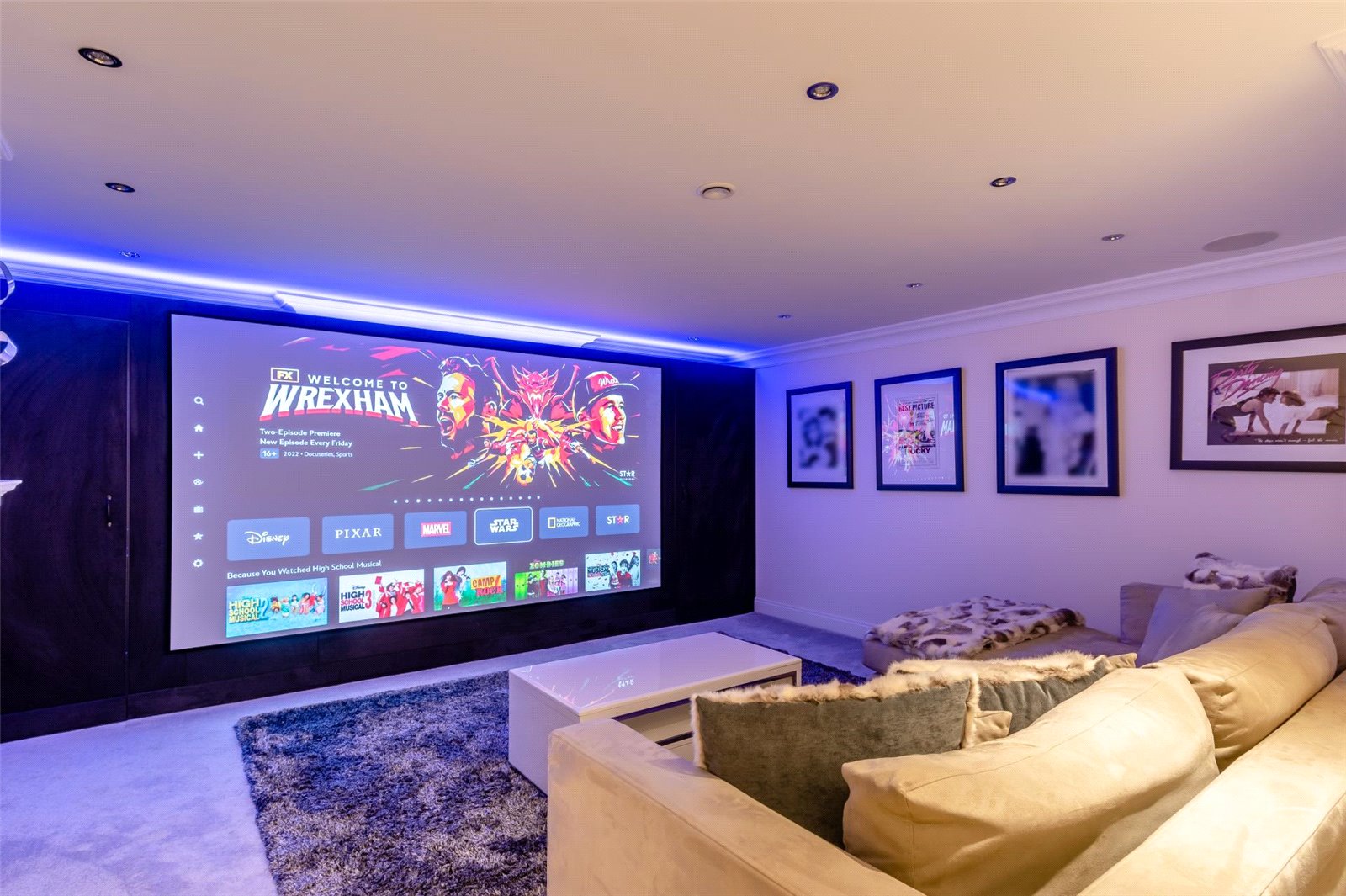 Cinema/Family Room 29'10" x 17' (9.1m x 5.18m). Grey carpet. Plain coved ceiling. Down lighters. Underfloor heating. Limestone fireplace surround and gas flame fire. Air circulation system and cupboard housing unit. 144 inch Cinema system incorporating Sony, Marantz and Artcoustic components. Bang and Olufsen Audio system. Two free standing Bang and Olufsen tower speakers.