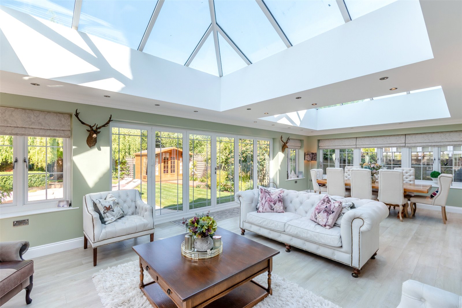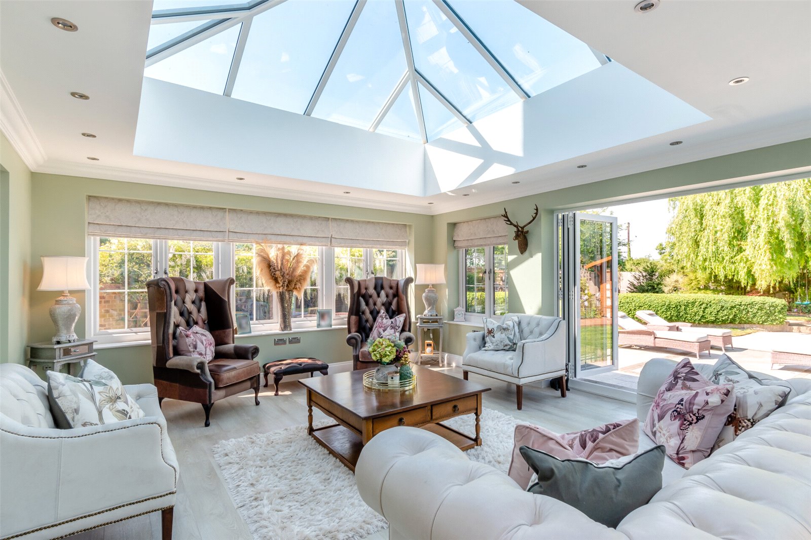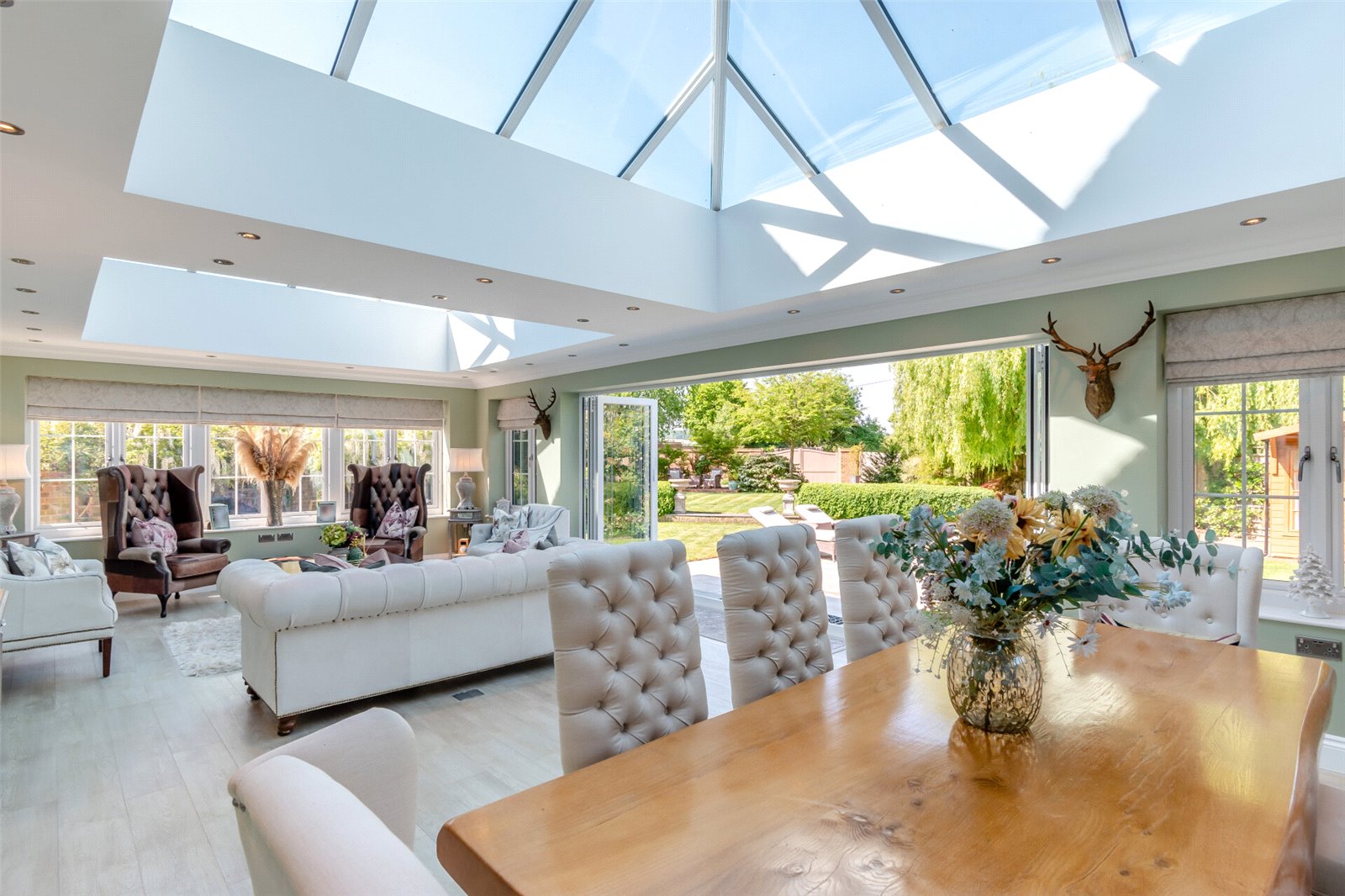 Orangery 29'2" x 15'10" (8.9m x 4.83m). Double glazed window to sides and rear. 2 large ceiling roof lanterns. 6 way bifold doors leading to garden. Blinds to windows. Multiple USB power points and down lighters. Underfloor heating. Moduleo Sherman Oak flooring. Reverse cycle Toshiba air conditioning.