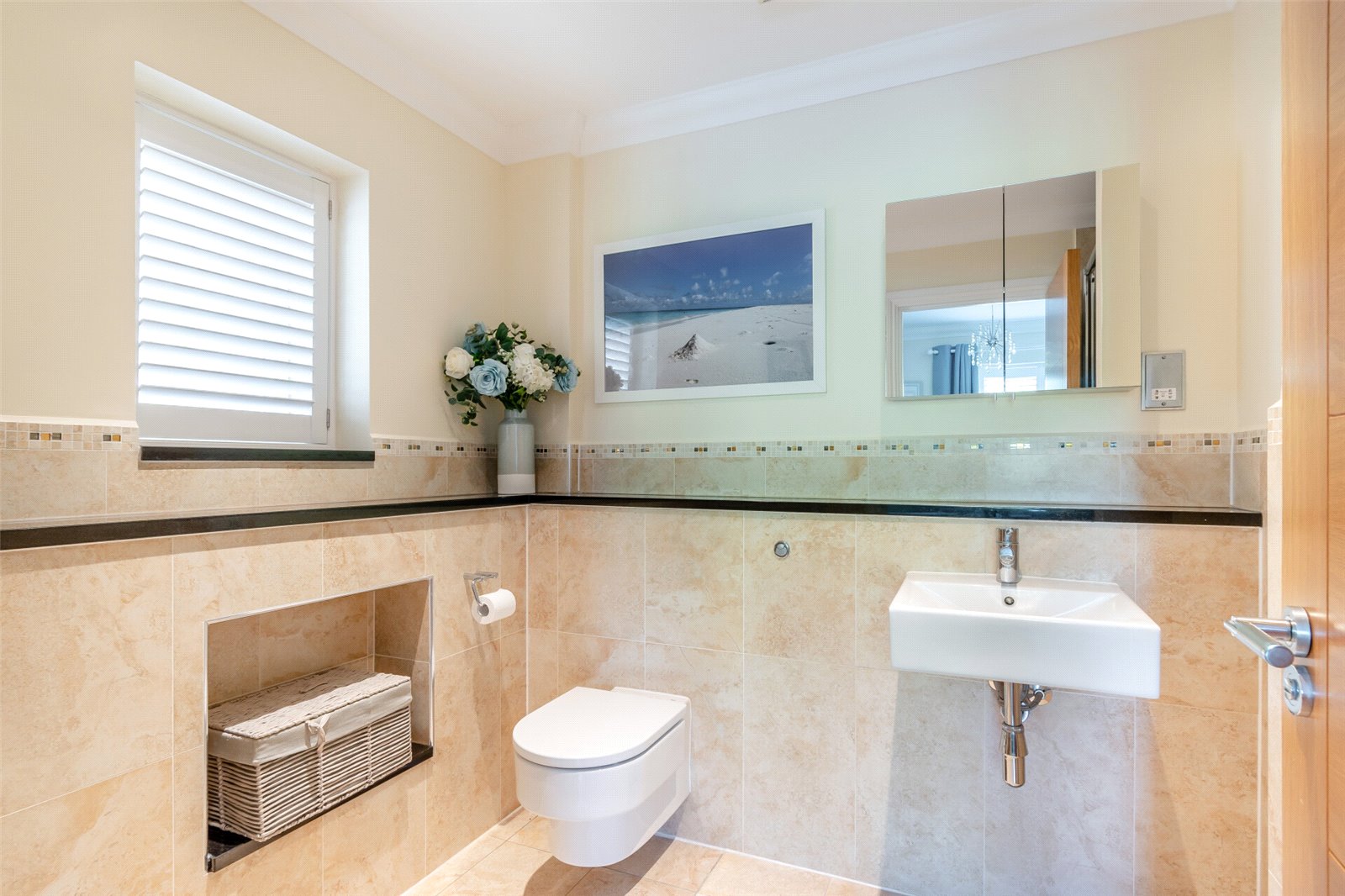 Ground Floor Cloakroom 5'1" x 3'9" (1.55m x 1.14m). Georgian style double glazed window to side. Plain coved ceiling. Rustic Jerusalem limestone flooring. Underfloor heating. Down lighters. Extractor. Heated towel rail. Roca white suite comprising of wash hand basin and low level WC. Local tiling. Window Shutters.