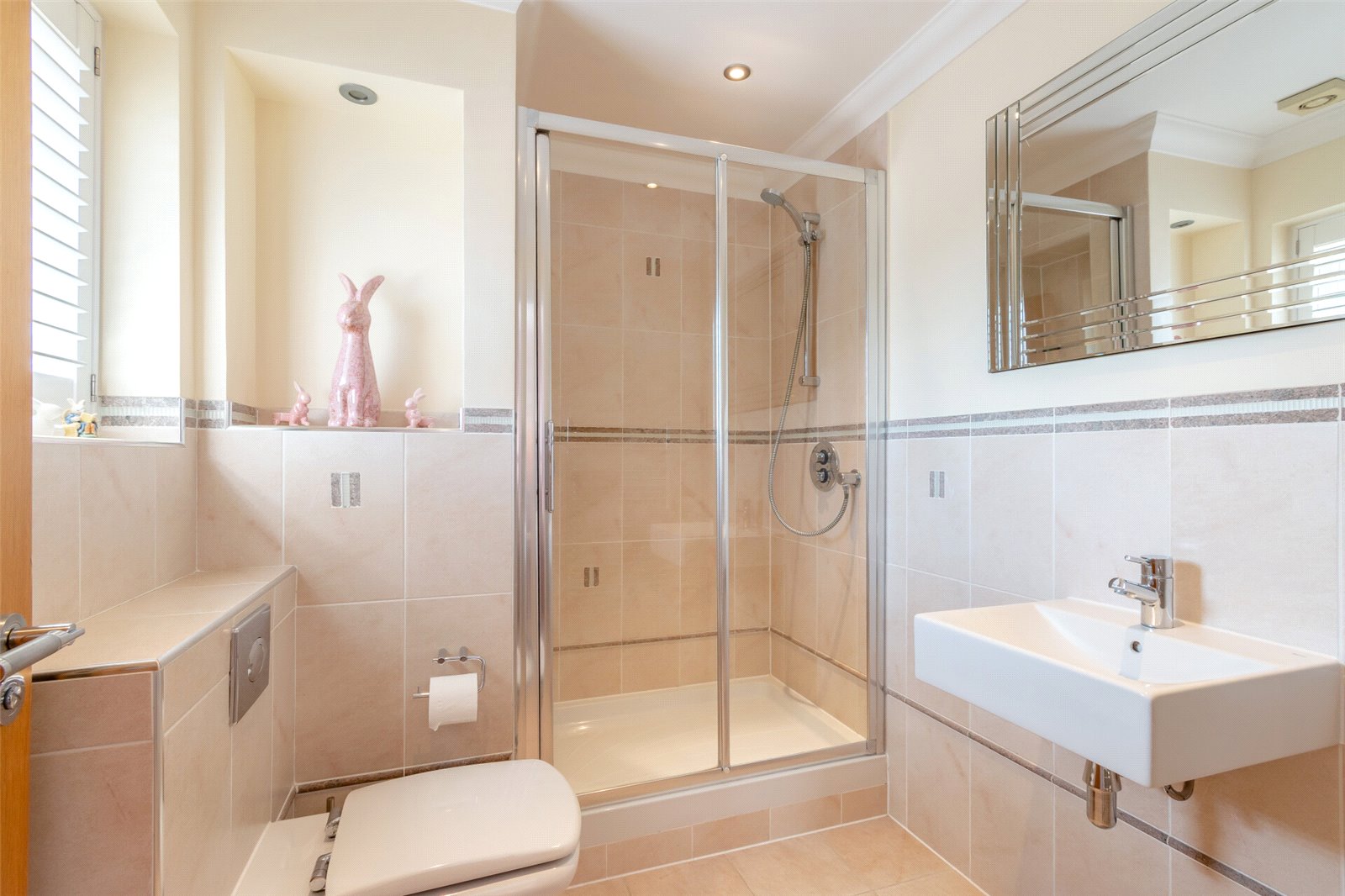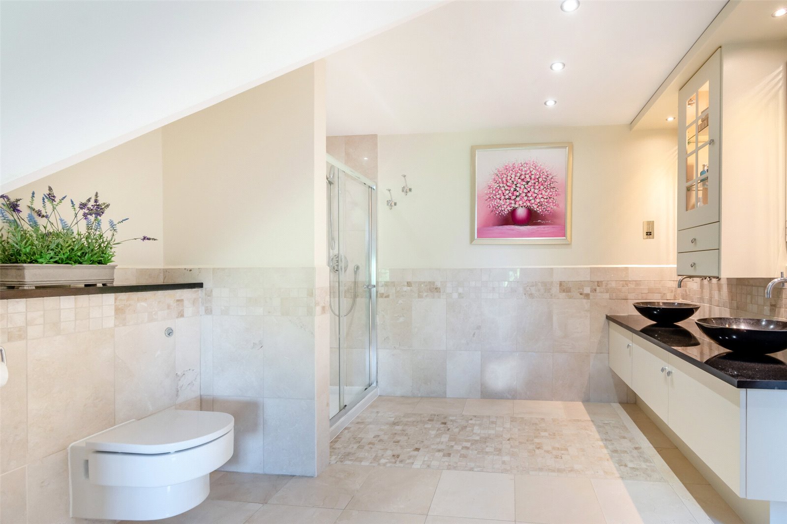 En-Suite Shower Room 7'3" x 6'6" (2.2m x 1.98m). Double glazed window to side. Plain coved ceiling. Down lighters. Porcelain floor. Underfloor heating. Extractor fan. Heated towel rail. White Roca suite comprising of low level WC and square wash hand basin. Local tiling with recess. Shaver point. Window Shutters.