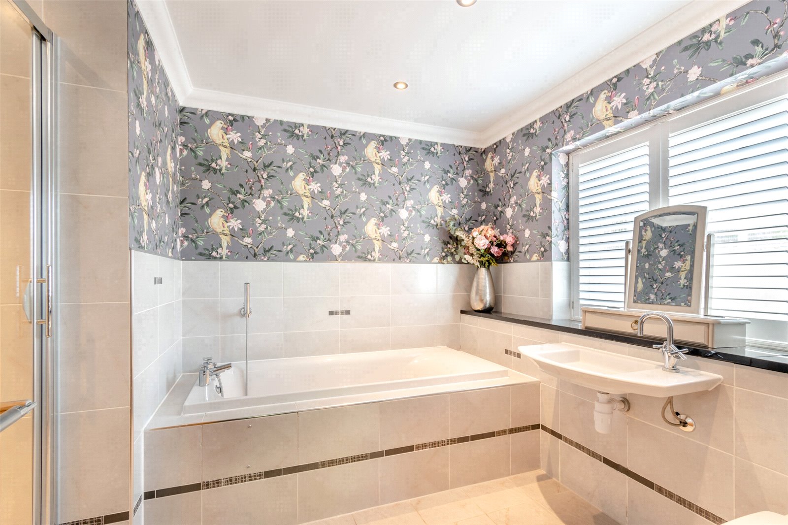 En-Suite Bathroom 17'10" x 11' (5.44m x 3.35m). Georgian style arched double glazed window to rear. Plain ceiling. Marble flooring. Radiator. White Roca suite comprising of sunken 'Jacuzzi' bath with shower attachment, low level WC, walk¬ in shower, his and hers double bowl wash hand basins with mixer taps and mirrors above. Wall cabinet and matching vanity unit. Marble tiled walls. Shaver point.