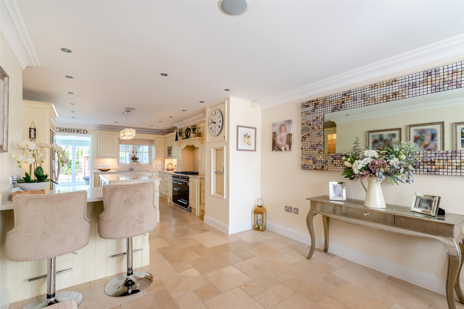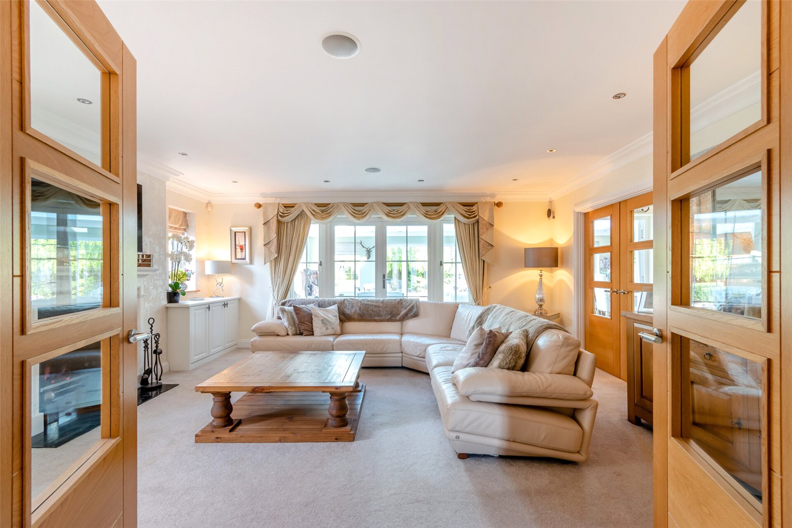 Sitting Room 17'5" x 16'3" (5.3m x 4.95m). Two Georgian style windows to side. Double aspect Oak doors to entrance hall and kitchen/family room. Georgian style French doors to garden room. Plain coved ceiling. Carpet. Underfloor heating. Bang & Olufsen speakers. Marble fireplace and gas flame fire. Built in cupboards to side of fireplace. TV mounting for flat screen television.