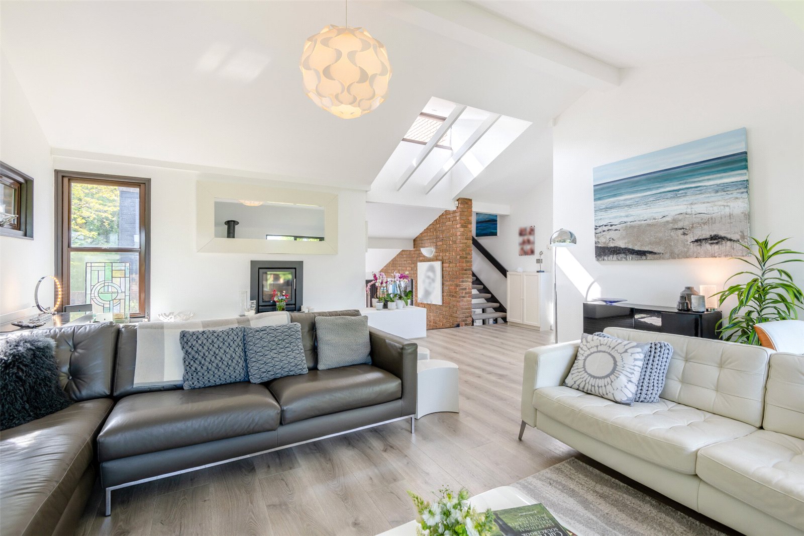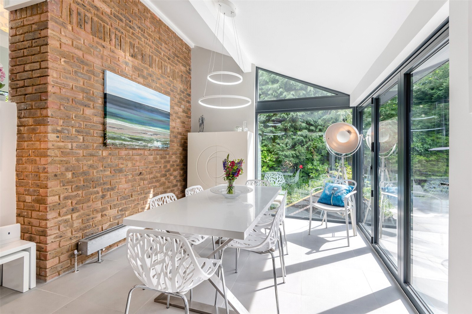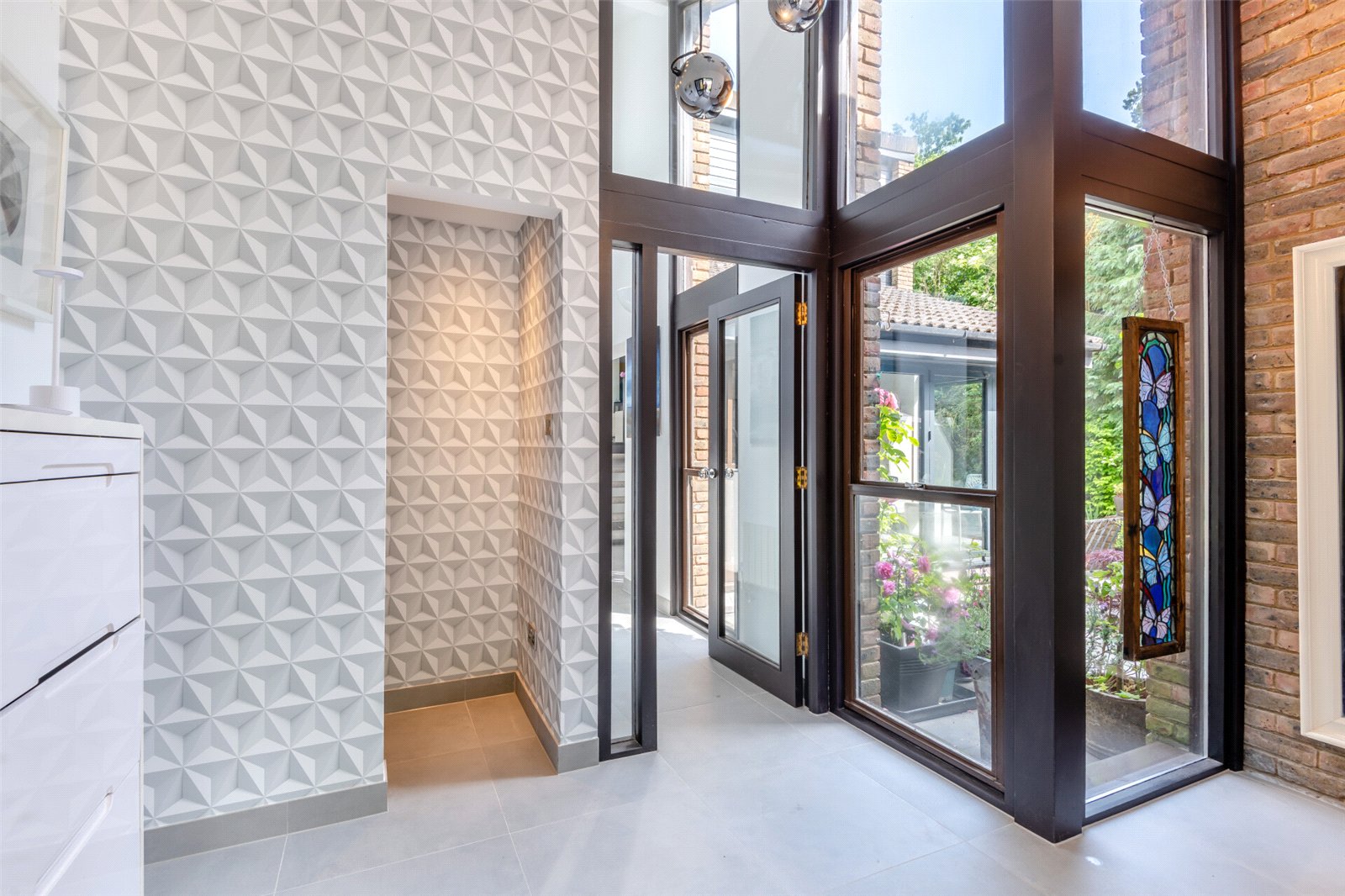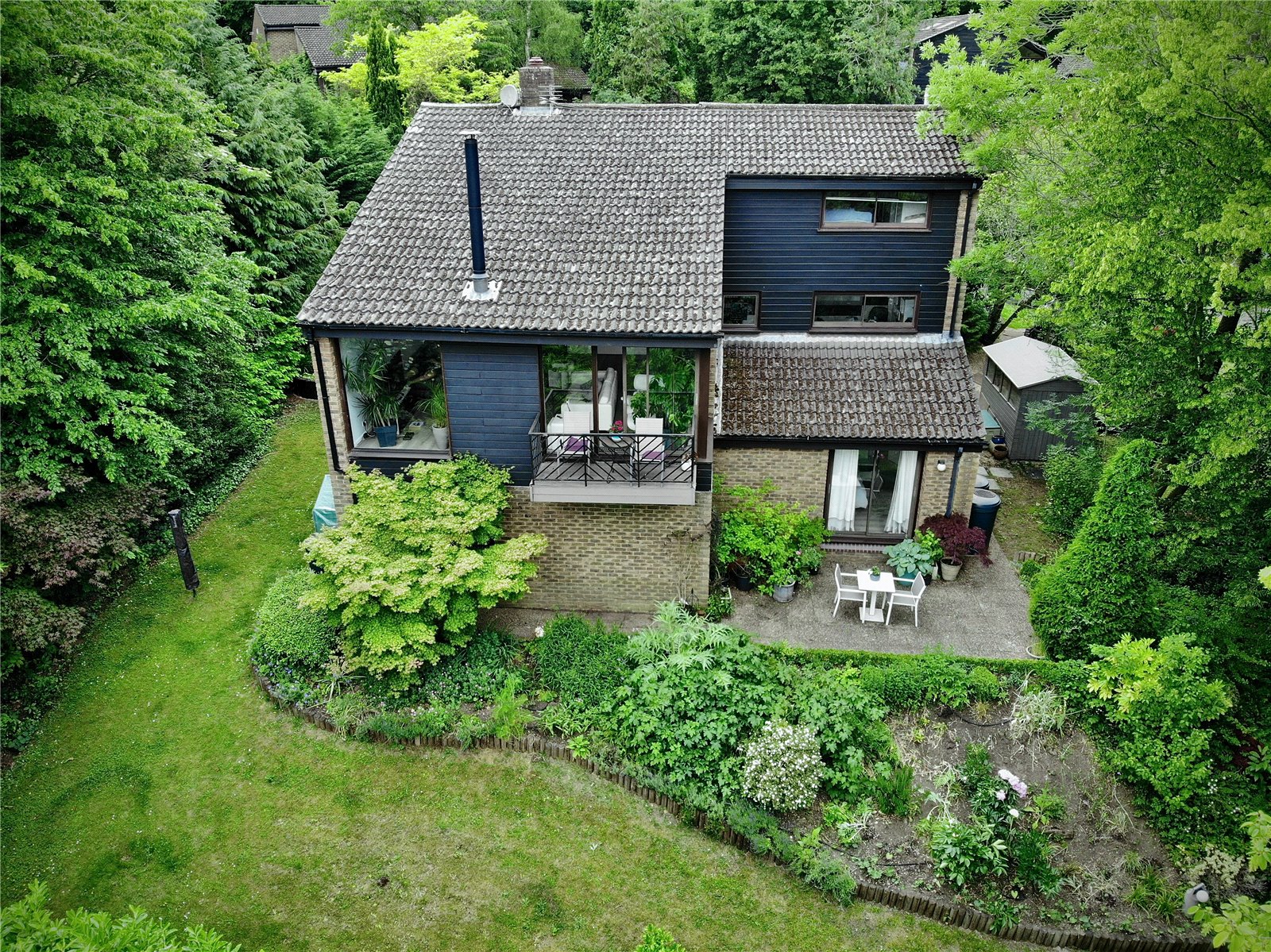Tucked away in the established and sought-after Redhill Wood, this impressive architecturally individually designed circa late 1970s multi-level home enjoys a corner plot position approaching 0.37 acres and offers versatile accommodation, perfect for modern family living. The unique layout delivers a striking entrance hall with vaulted ceiling, full-length glazing which floods the space with natural light. From here, a stylish cloakroom and a well-appointed kitchen/breakfast room lead off, complete with a range of newly fitted integrated appliances and a Quooker tap. A separate utility room provides additional practicality with space for laundry appliances and further storage. The dining room which is open plan to the kitchen is an inviting space, with feature brick wall, bi-fold doors opening to the private courtyard element of the wraparound garden, making it an ideal setting for entertaining. Underfloor heating is a feature of this level of the property.