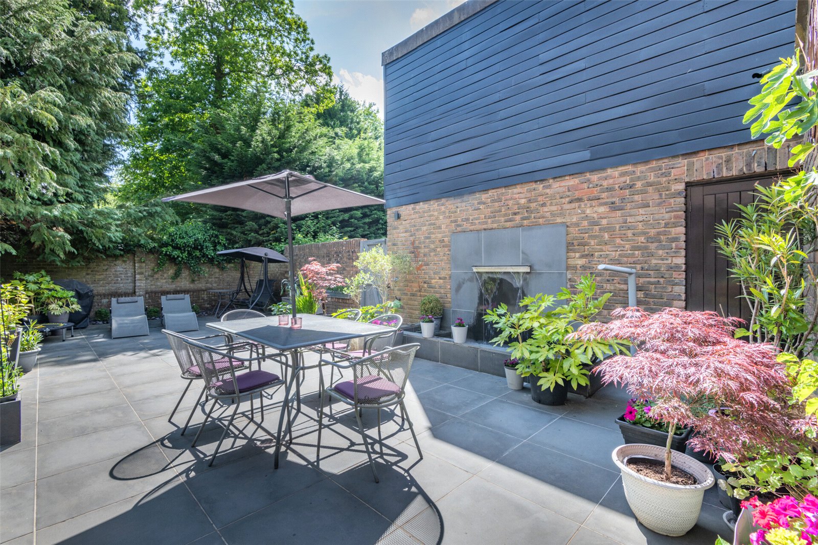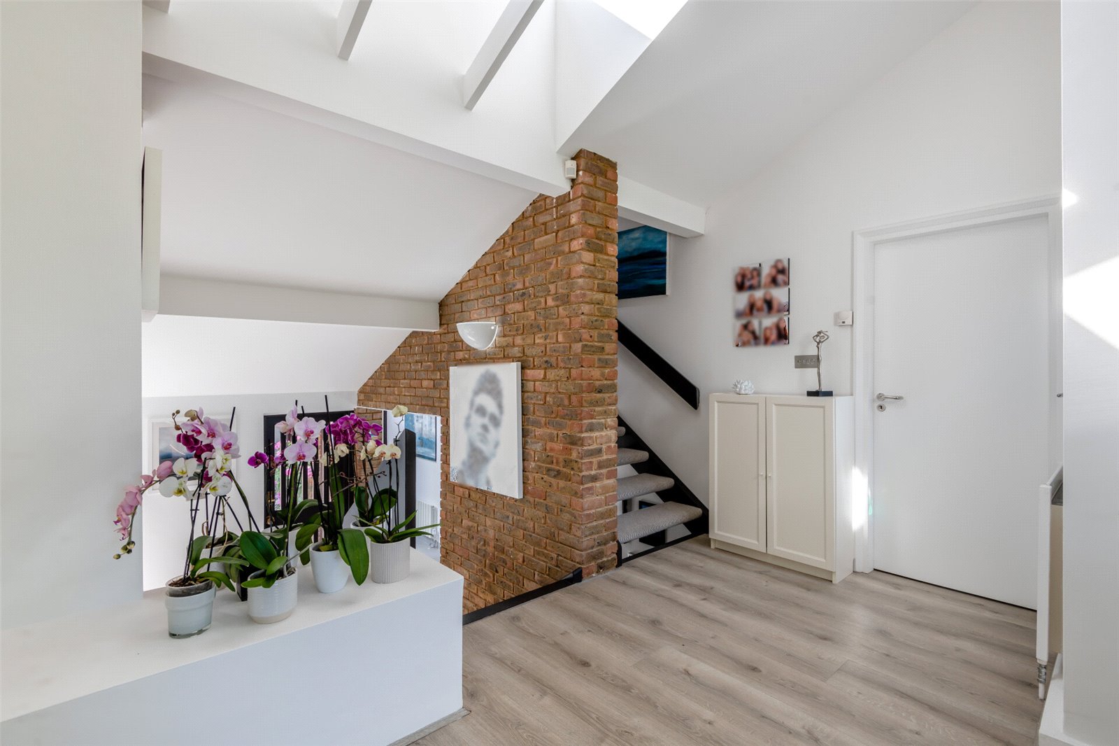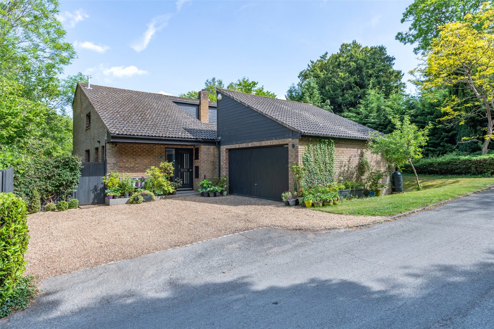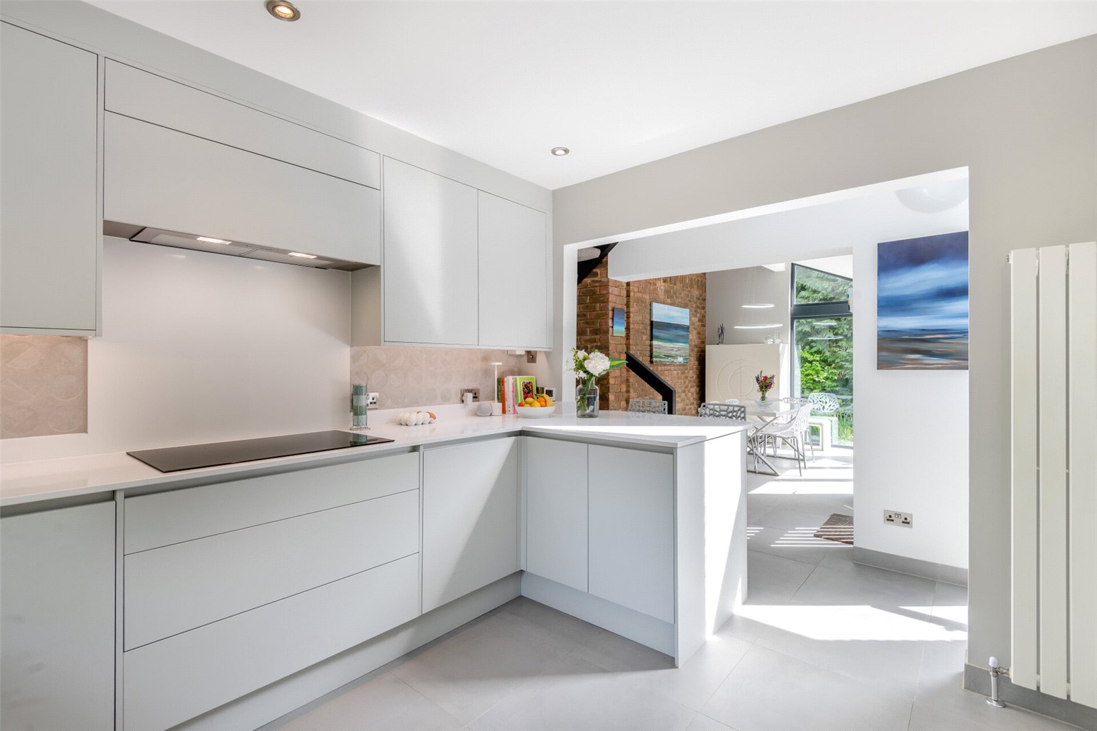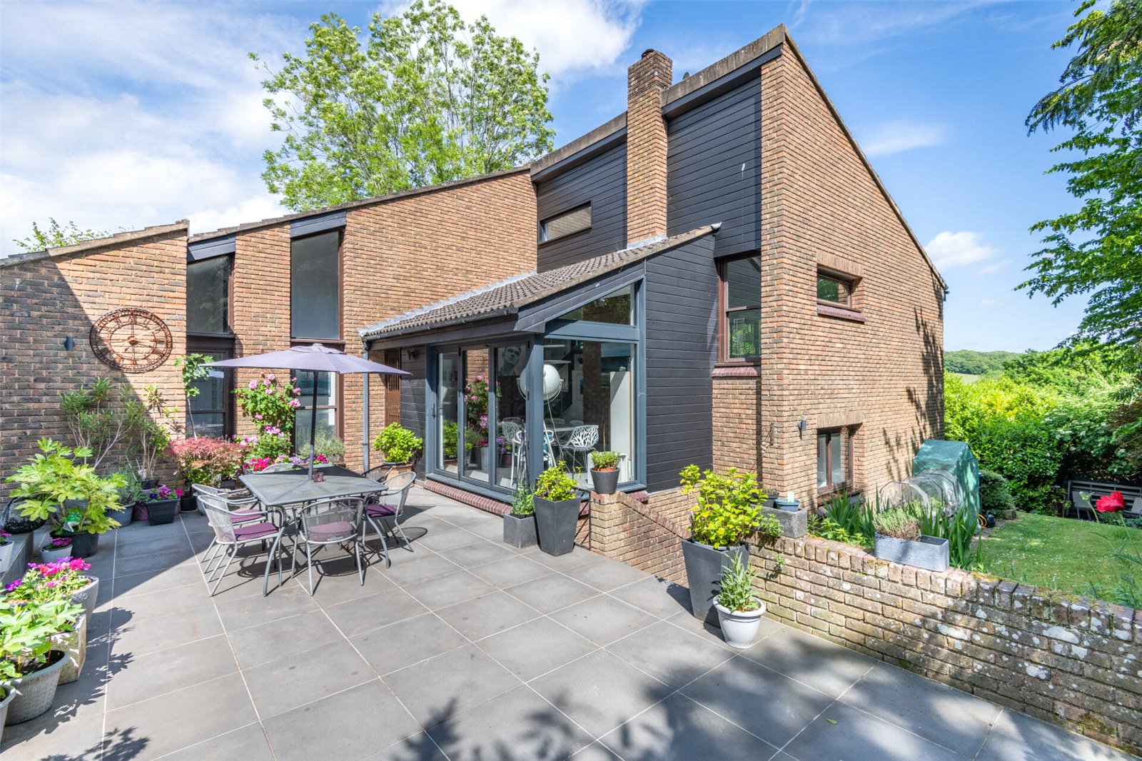 Tucked away in the established and sought-after Redhill Wood, this impressive architecturally individually designed circa late 1970s multi-level home enjoys a corner plot position approaching 0.37 acres and offers versatile accommodation, perfect for modern family living. The unique layout delivers a striking entrance hall with vaulted ceiling, full-length glazing which floods the space with natural light. From here, a stylish cloakroom and a well-appointed kitchen/breakfast room lead off, complete with a range of newly fitted integrated appliances and a Quooker tap. A separate utility room provides additional practicality with space for laundry appliances and further storage. The dining room which is open plan to the kitchen is an inviting space, with feature brick wall, bi-fold doors opening to the private courtyard element of the wraparound garden, making it an ideal setting for entertaining. Underfloor heating is a feature of this level of the property.