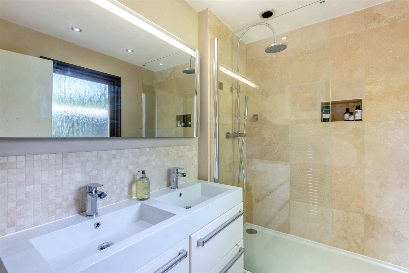 Ensuite Shower Room 7'4" x 5'2" (2.24m x 1.57m). Double glazed window to side. Tiled flooring. Plain ceiling with downlights. Heated towel rail. Walk-in shower cubicle. Two wash hand basins in vanity unit. Mirror light. Local tiling to walls.