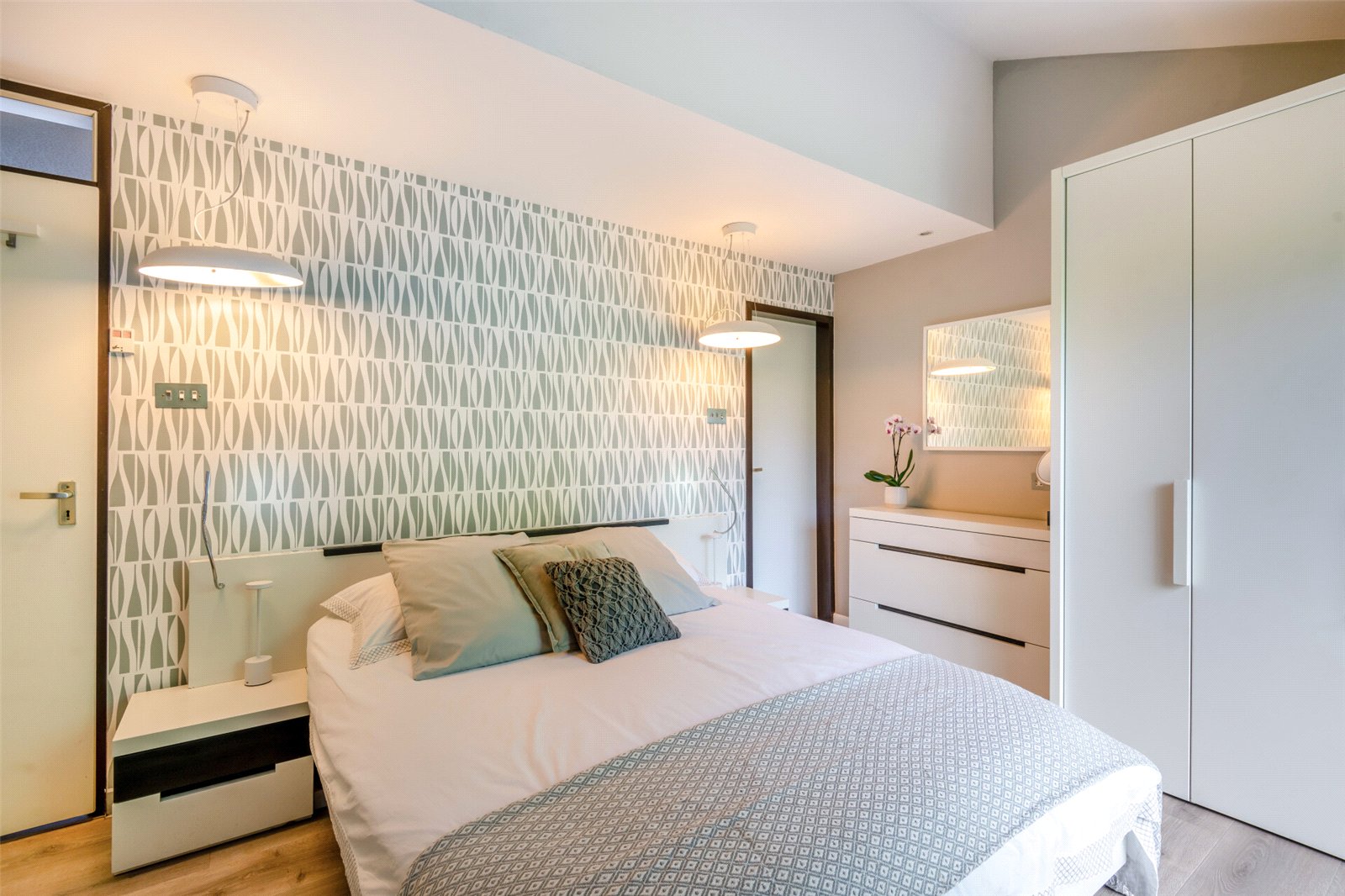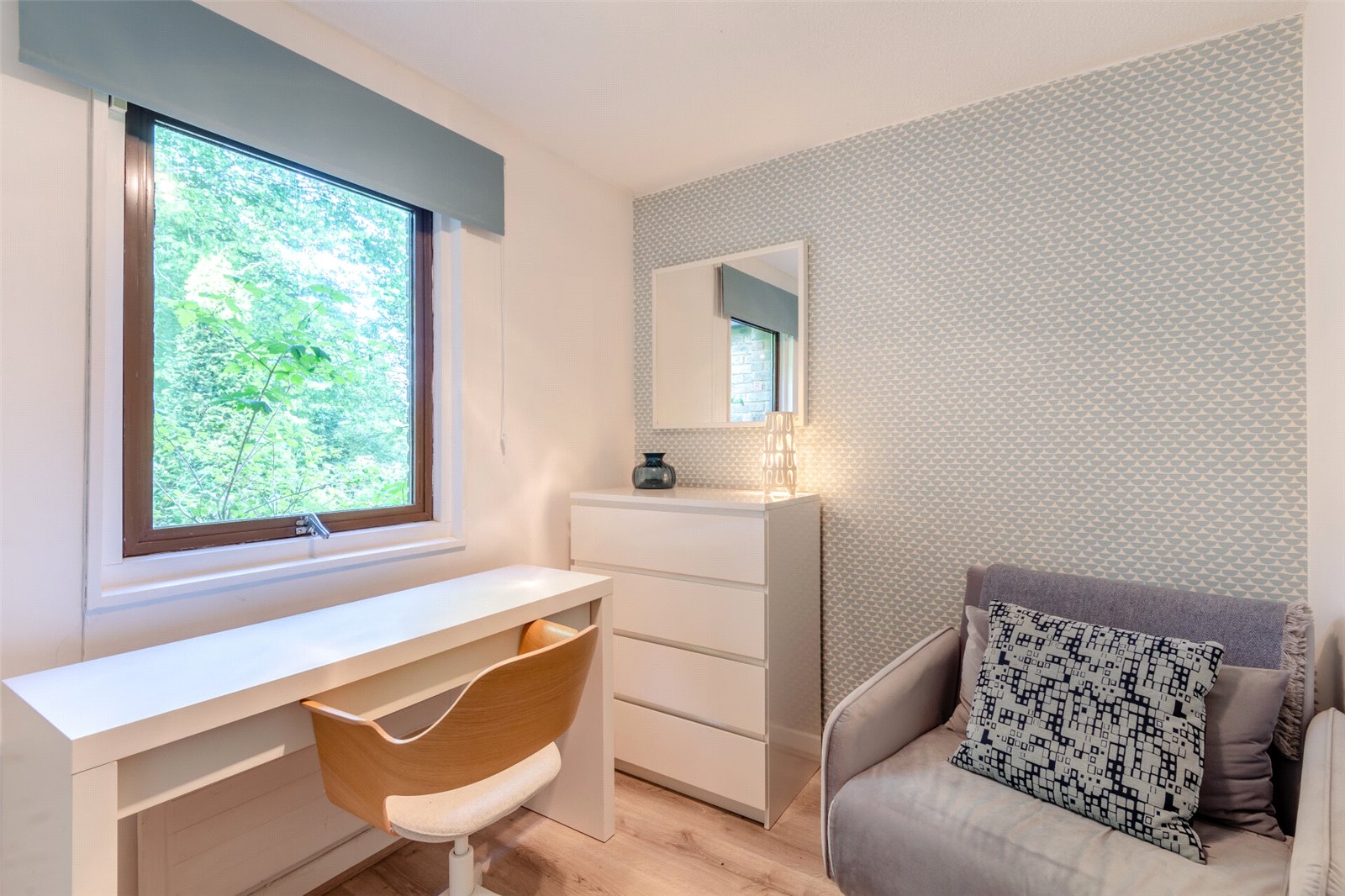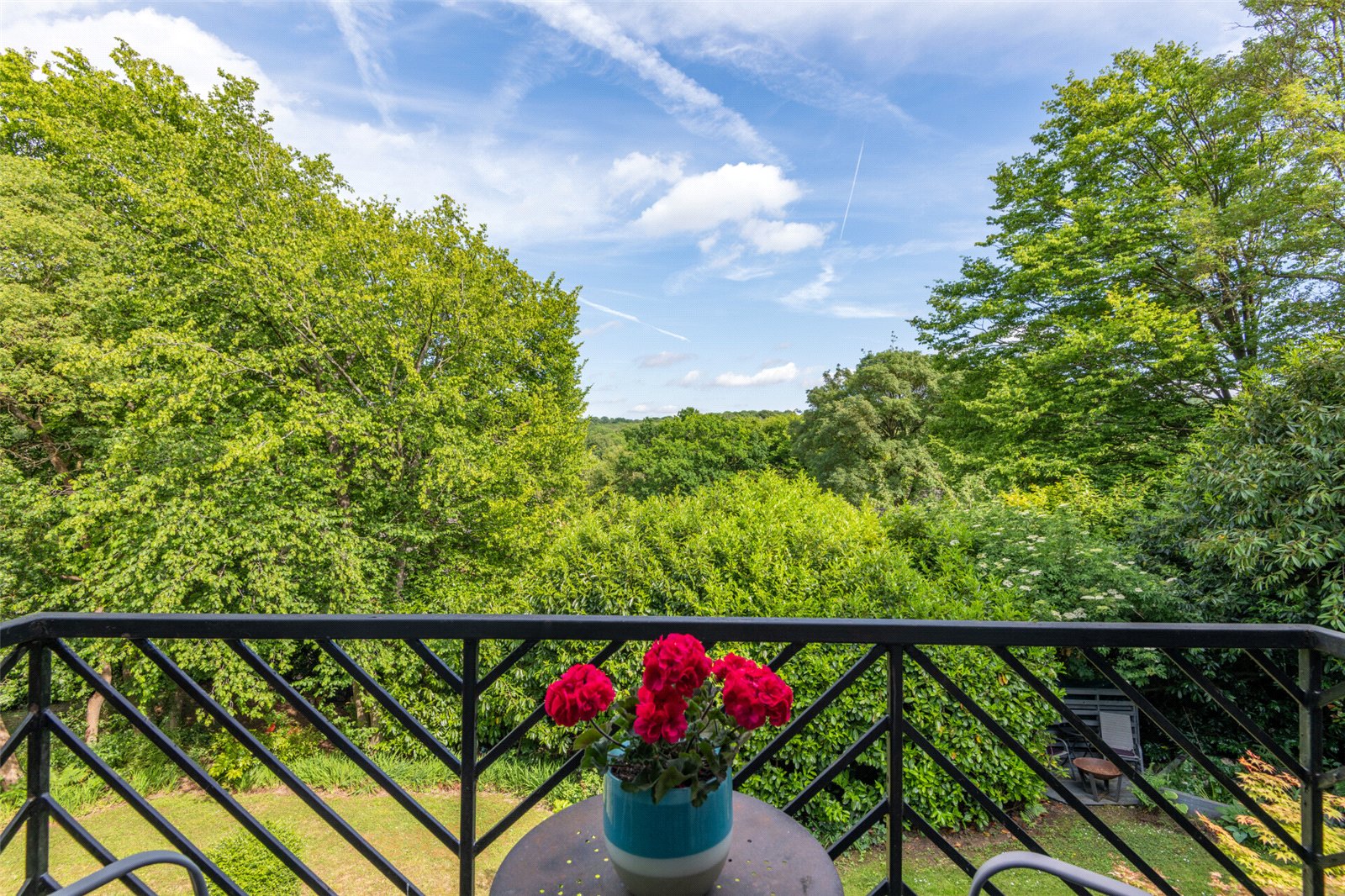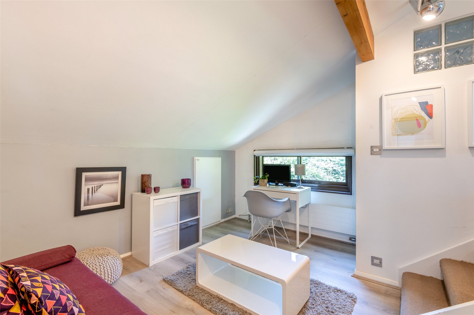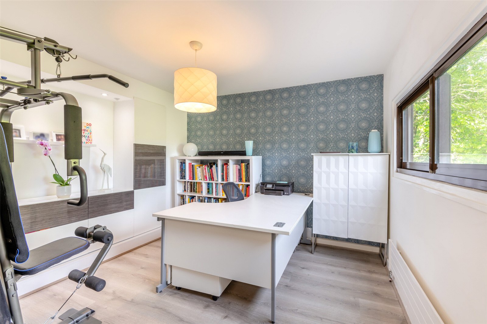 To the upper ground floor, the generous sitting room commands attention with dual log burners, sliding doors opening onto a private balcony overlooking the rear part of the garden, and a wealth of glazing creating a wonderfully light and airy living space. Adjacent is a separate study which also has views over the garden, ideal for home working. The lower ground floor accommodates four bedrooms including a spacious principal bedroom with patio doors to the garden, fitted wardrobes and a contemporary ensuite shower room with double vanity basins. Three further bedrooms offer built-in wardrobes and are served by a modern family bathroom. On the top floor, a further guest bedroom benefits from an adjacent WC and a snug/study area with eaves storage and its own shower cubicle, providing flexible use for guests, older children or additional workspace.