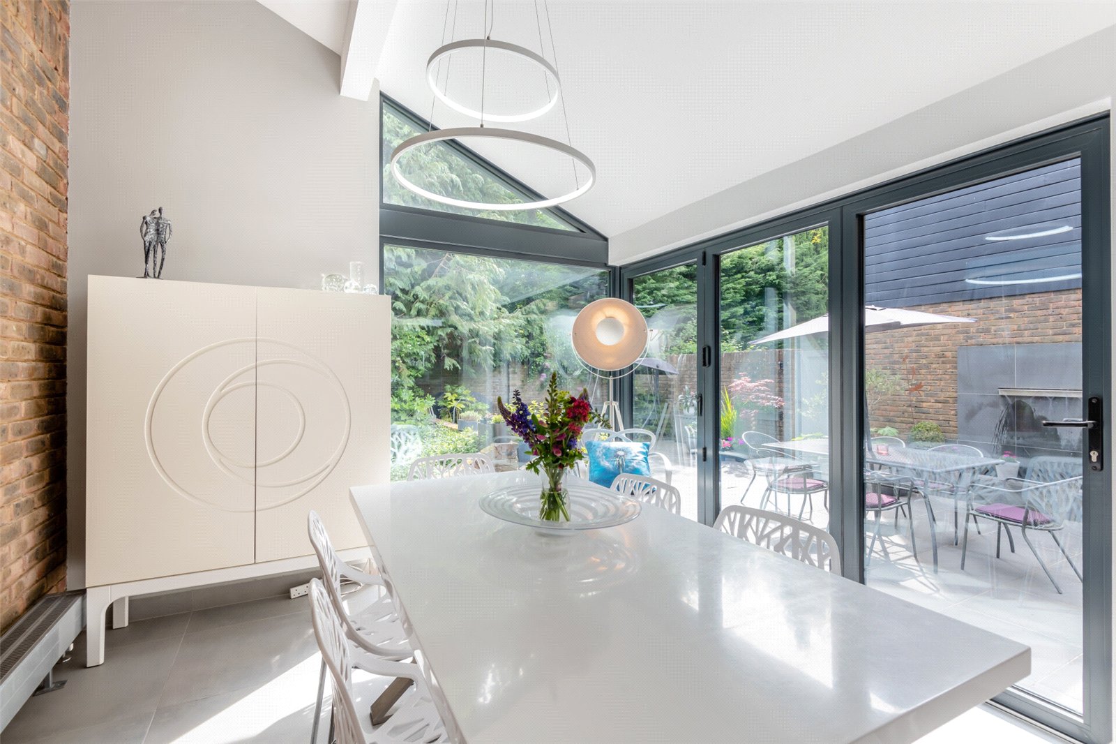 Dining Room 14'11" (4.55m) extending to 19'5" (5.92m) x 11'7" (3.53m). Double glazed full length window to side. Double glazed bi-fold doors to front. Tiled flooring with underfloor heating. Plain vaulted ceiling. Radiator. Feature brick faced wall.