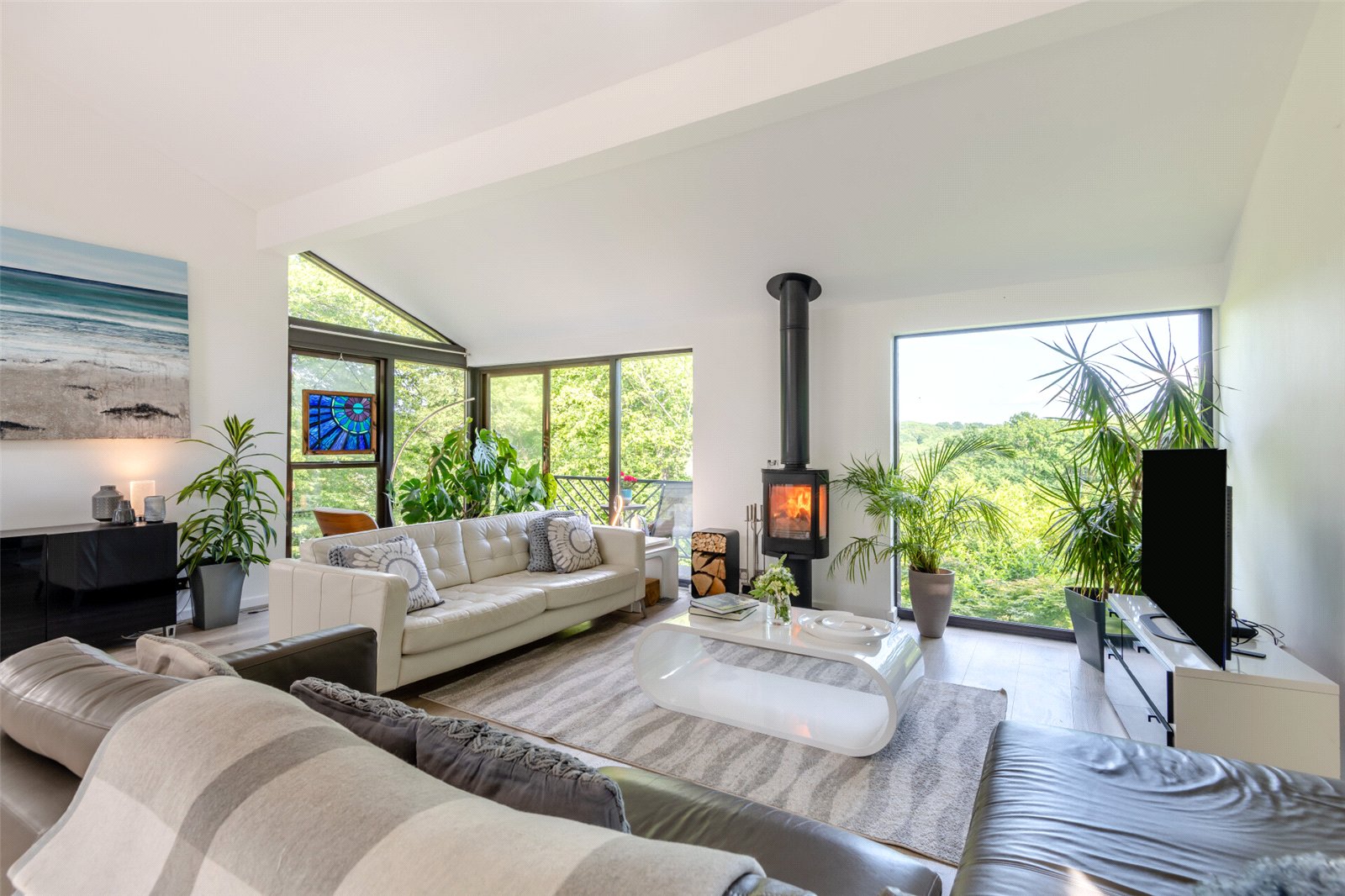 Sitting Room 21'9" x 19'5" (6.63m x 5.92m). Double glazed sliding doors to balcony. Double glazed full length window to rear. Double glazed windows to front and sides. Wood effect flooring. Plain ceiling. Two radiators. Two log burners.