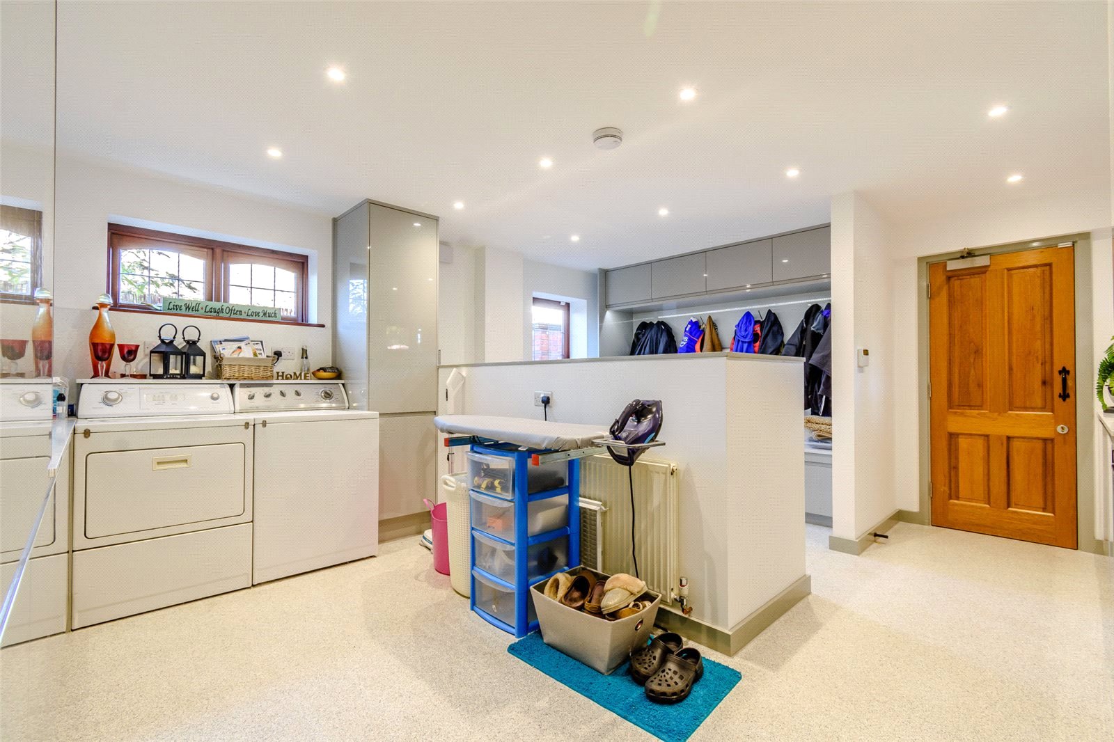 Utility Room/Bootery 17'2" x 14'8" (5.23m x 4.47m). Double glazed leaded light window to front. Double glazed leaded light window to side. Vinyl flooring. Plain ceiling with down lighters. Fitted wall and base units with work top surfaces. Sink and drainer unit with mixer taps. Commercial washing machine and tumble dryer. Siemens oven. Dog grooming station with stainless steel sink and drainer unit and mixer taps. Bootery seating.