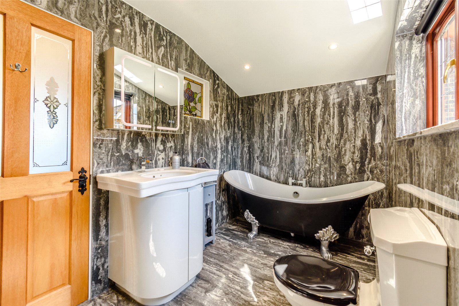 En-suite 12'7" (3.84m). narrowing to 911 x 63 Double glazed leaded light window to rear. Wet room. Polished resin flooring and walls. Plain ceiling with down lighters. Claw foot bath. Wash hand basin. Low level wc. Shower cubicle with overhead attachment. Towel radiator.