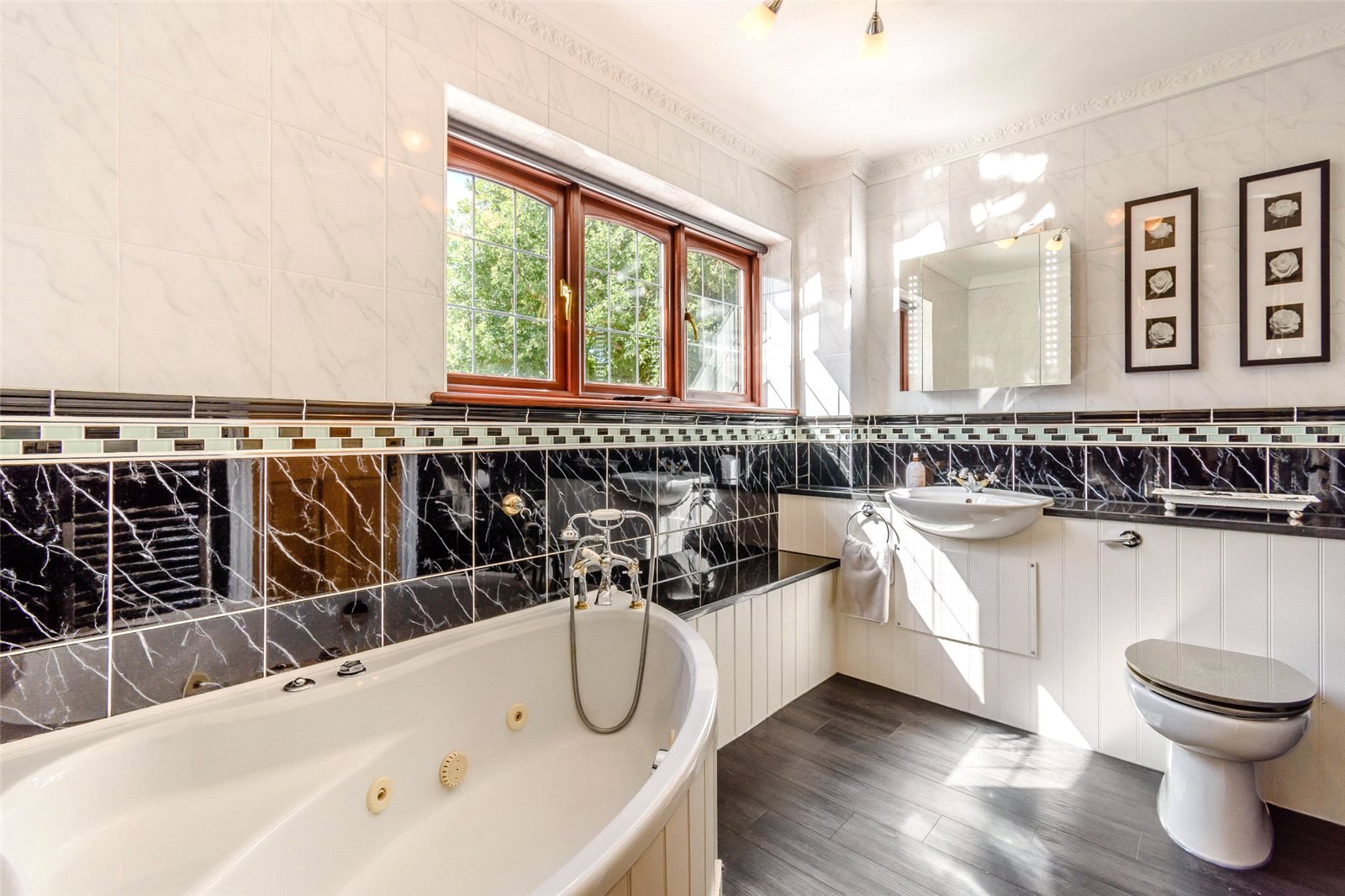 Bathroom 9'6" x 6'4" (2.9m x 1.93m). Double glazed leaded light window to rear. Wood effect flooring. Plain ceiling. Jacuzzi bath. Low level wc. Wash hand basin. Shower cubicle. Tiled walls. Heated towel rail.