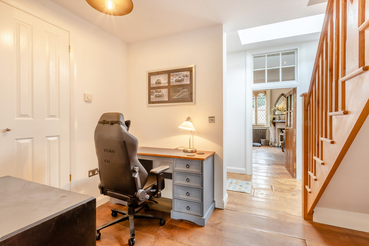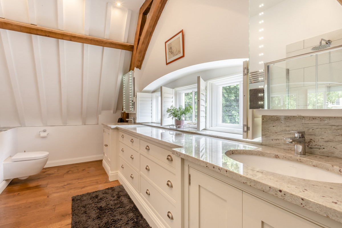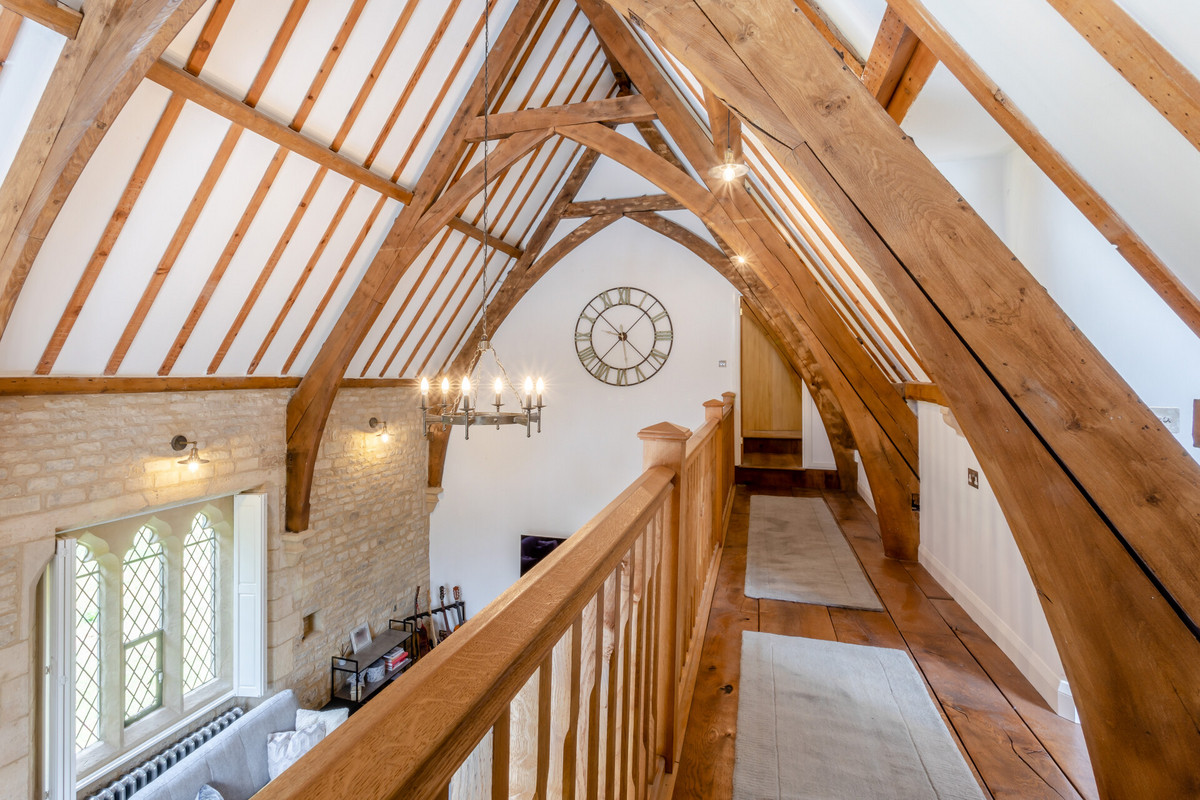 Upstairs there are two separate areas accessed from their own staircases. To the rear of the house there are two double bedrooms both with their own luxurious en suite shower rooms. The main bedroom suite is accessed from the front staircase and the long gallery overlooking the main reception room. This bedroom is a wonderful room with a vaulted ceiling and views over the garden and towards the village church, there is a range of fitted wardrobes and a beautiful and luxurious en suite shower room with bespoke cabinetry. The last double bedroom is to the front of the house overlooking the village road and again is a large bright room with fitted wardrobes and a quality en suite shower room.