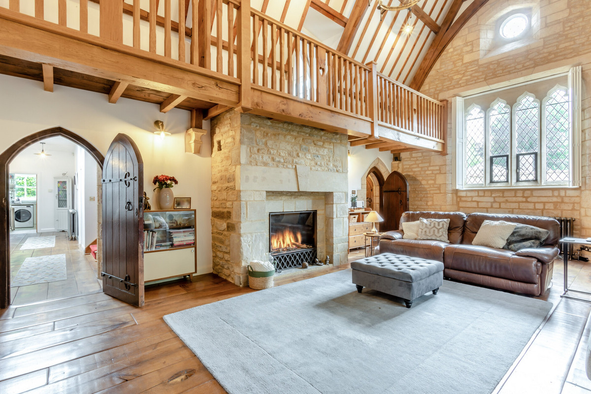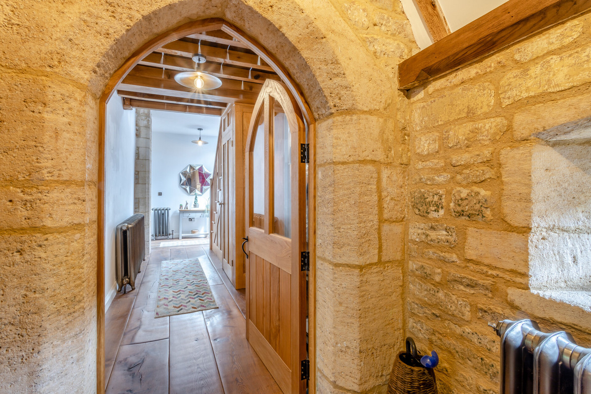 On entering through the original solid oak arched old school door you are greeted by a warm and welcoming entrance lobby and central hallway with exposed stone walls, beams and solid oak floor. On the left is the magnificent main reception room which was originally the school assembly hall. This room has a vaulted ceiling with beams and a gallery landing, there is an impressive stone fireplace with a living flame gas fire, exposed stone walls, a wide plank solid oak floor and superb leaded glass mullion windows with shutters.