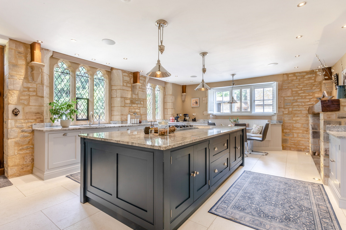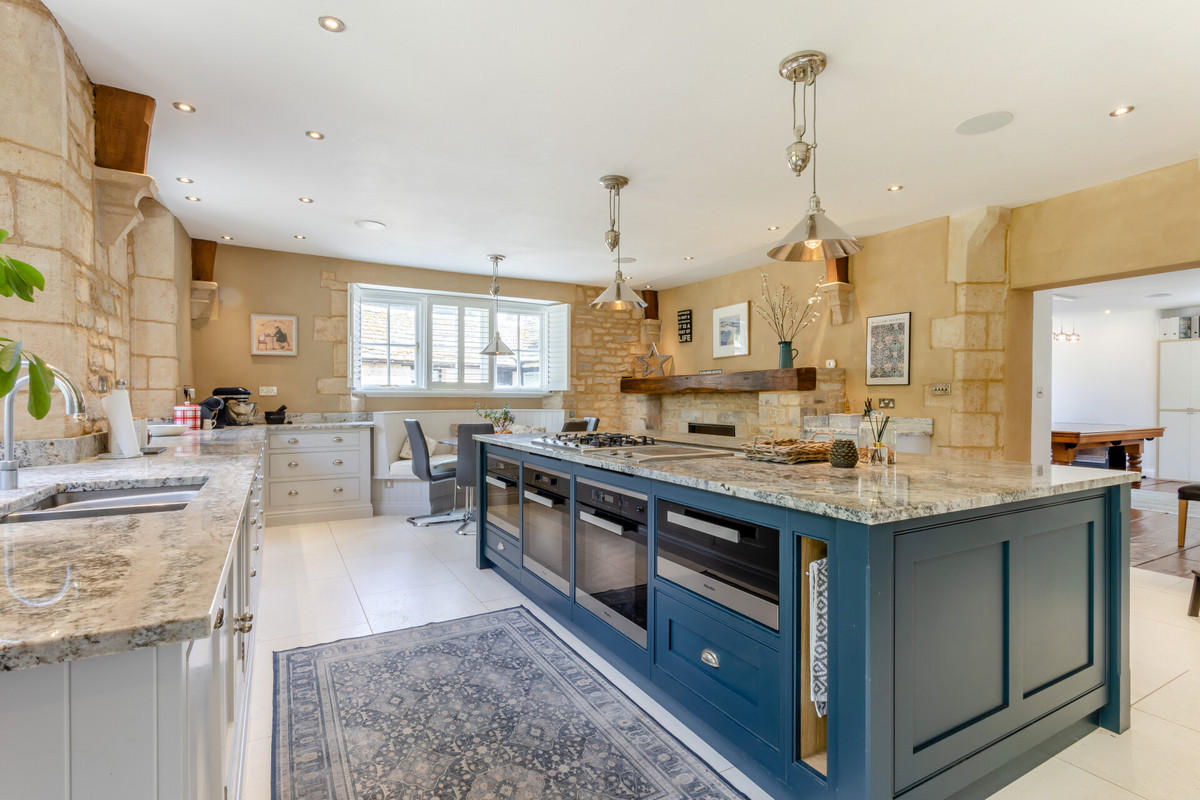To the rear of the house is the stunning kitchen/dining room which is fitted with an extensive range of bespoke ‘Tom Howley’ shaker style units in shades of grey and blue with granite work tops. There is a vast granite topped central island which houses an abundance of Miele appliances including two double ovens, a steam oven, a warming drawer, a gas fired hob and a hot plate with a retractable downdraft extractor fan, there is also a dishwasher, Miele coffee machine, microwave., a Quooker hot tap, waste disposal unit and plumbed in American style fridge freezer. The kitchen again has an array of period features with leaded glass mullion windows, exposed stone walls with corbels coupled with modern features such as the lovely, tiled floor with underfloor heating. At the far end of the room is a breakfast area with a fitted banquette and another impressive stone fireplace with oak mantel and a fitted living flame fire. Double oak doors lead out to the garden.