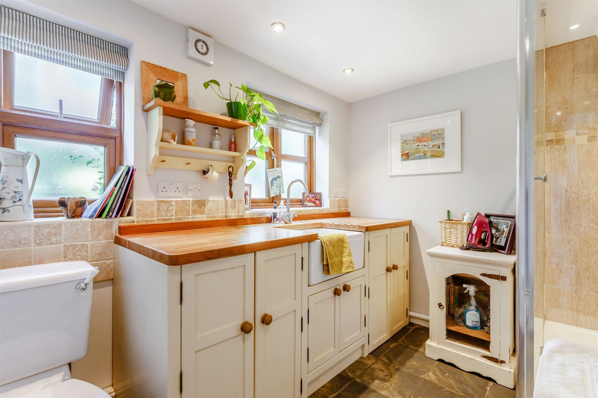 On entering you immediately notice how bright the house is there is a welcoming entrance hallway with a floor to ceiling glass wall overlooking the rear garden. On the right is the main reception room which is a great size and retains original beams and a superb stone inglenook with wood burner, there is also a bright sitting/dining area with doors opening to the garden. Located off the hallway is a useful utility/cloakroom with shower. On the left of the house is a modern fitted kitchen which leads through to a bright sitting room with exposed brick firebreast and wood burner, this room opens into a conservatory/breakfast room leading out to the garden.