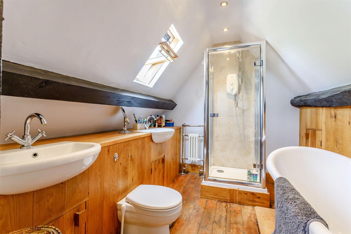On the first floor there are two good size double bedrooms and a fourth bedroom. The main family bathroom which is in the eaves is accessed up a further staircase, it’s a great size with a free-standing bath and a separate shower. At the far end of the house is the main bedroom which retains period beams and has an en suite shower room and walk in wardrobe.