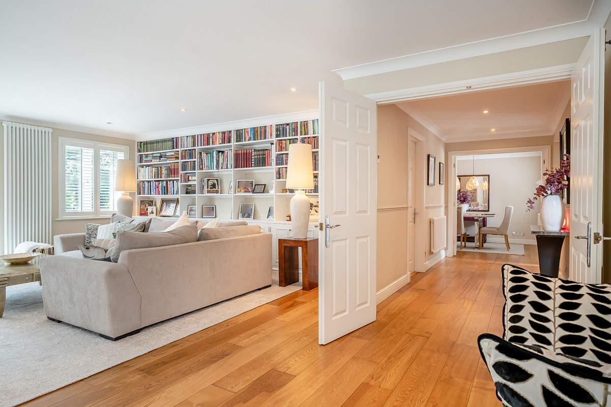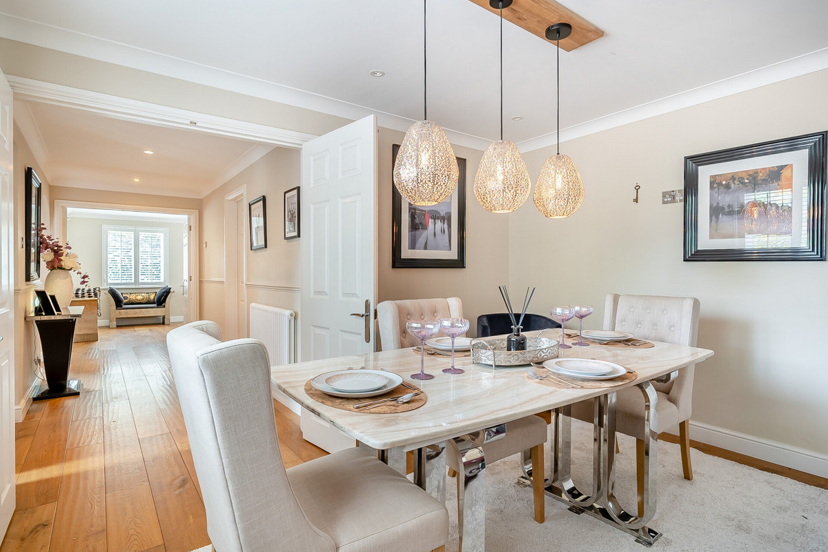 On entering you are greeted by a bright central hallway with an oak floor and staircase to the upper floor, there is also a guest cloakroom. To the front of the hall is a study which looks onto the front driveway and has access into the garage. On the left of the hall is a beautifully proportioned reception room with windows to the side and rear flooding the room with natural light, there is a modern style wall hung marble fireplace with a living flame gas fire and a full wall of bespoke fitted cupboards and display/book shelves, glazed doors lead through to the conservatory with access to the garden and sun terrace. The kitchen/breakfast room which is accessed from the hallway is a really good size and big enough for a breakfast table, it is fitted with an extensive range of wall and floor units, granite work tops, a range cooker and quality integrated appliances, there is a separate utility room with a further fitted hob and access to the rear garden.