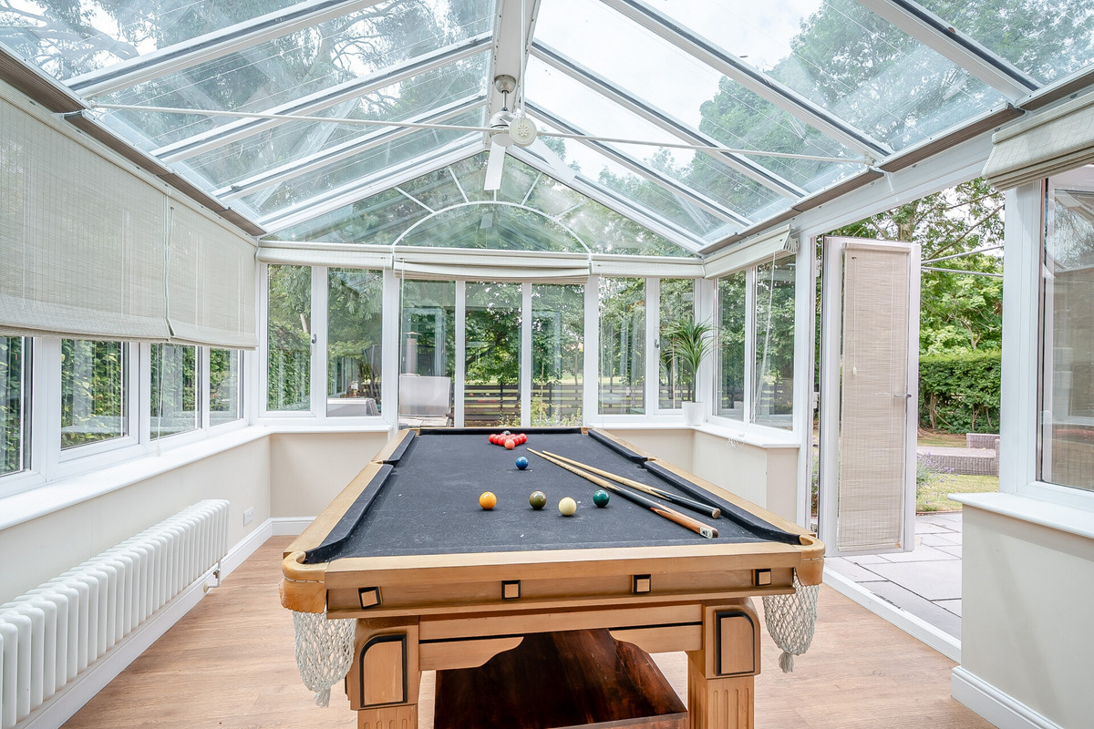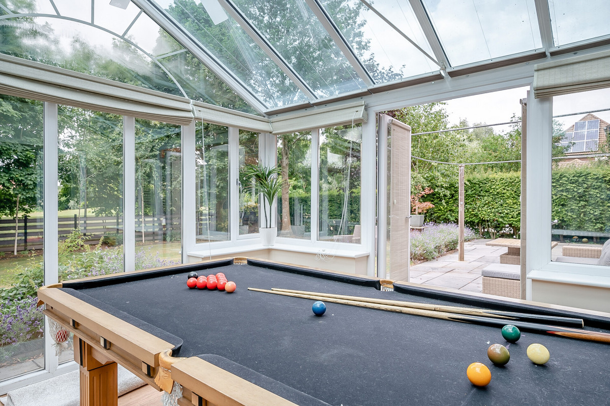 Outside the sunny gardens with an east west aspect are a sheer delight and are mainly laid to lawn with a paved sun terrace spanning the rear and side of the house which is ideal for outside dining, the whole garden is bordered by mature hedging and trees, fencing and mature shrubberies with views over the golf course.