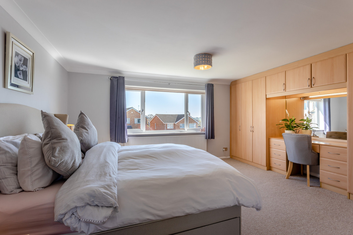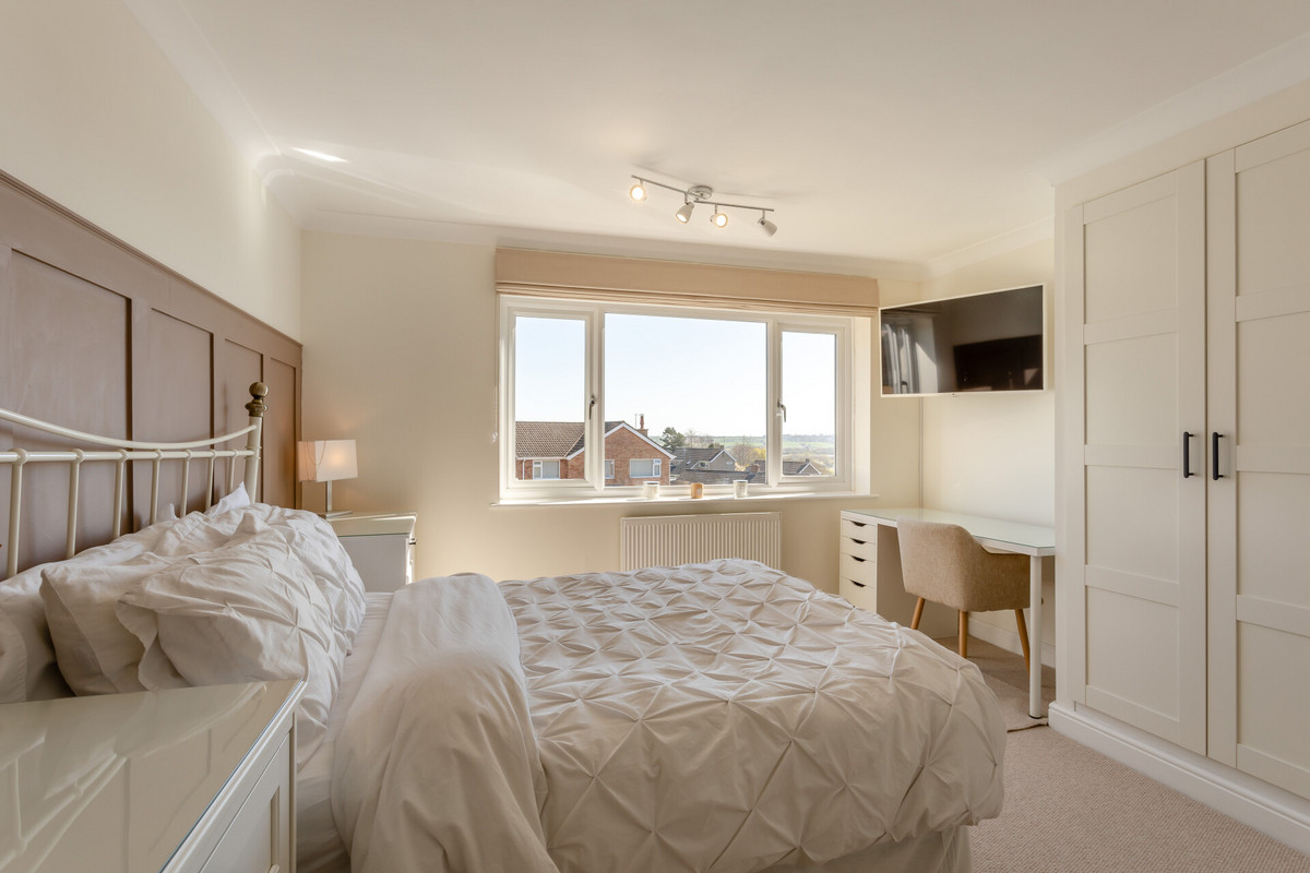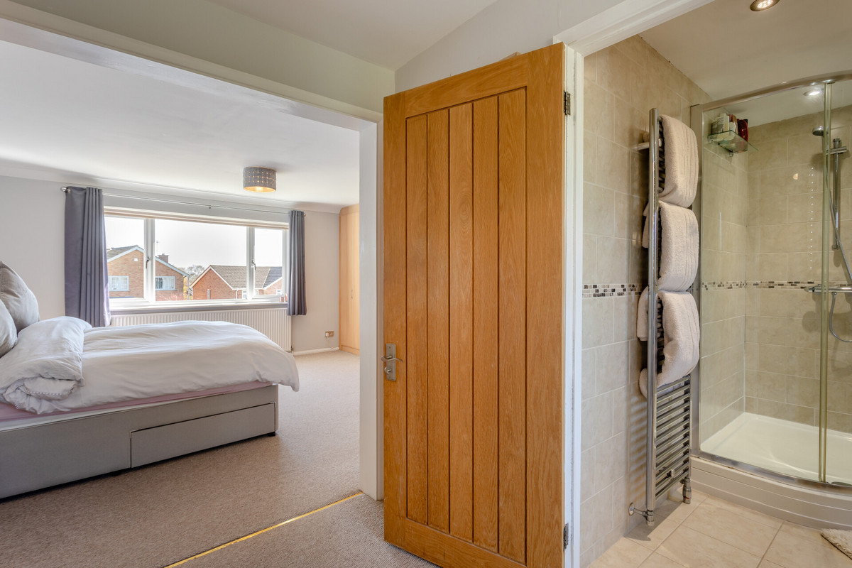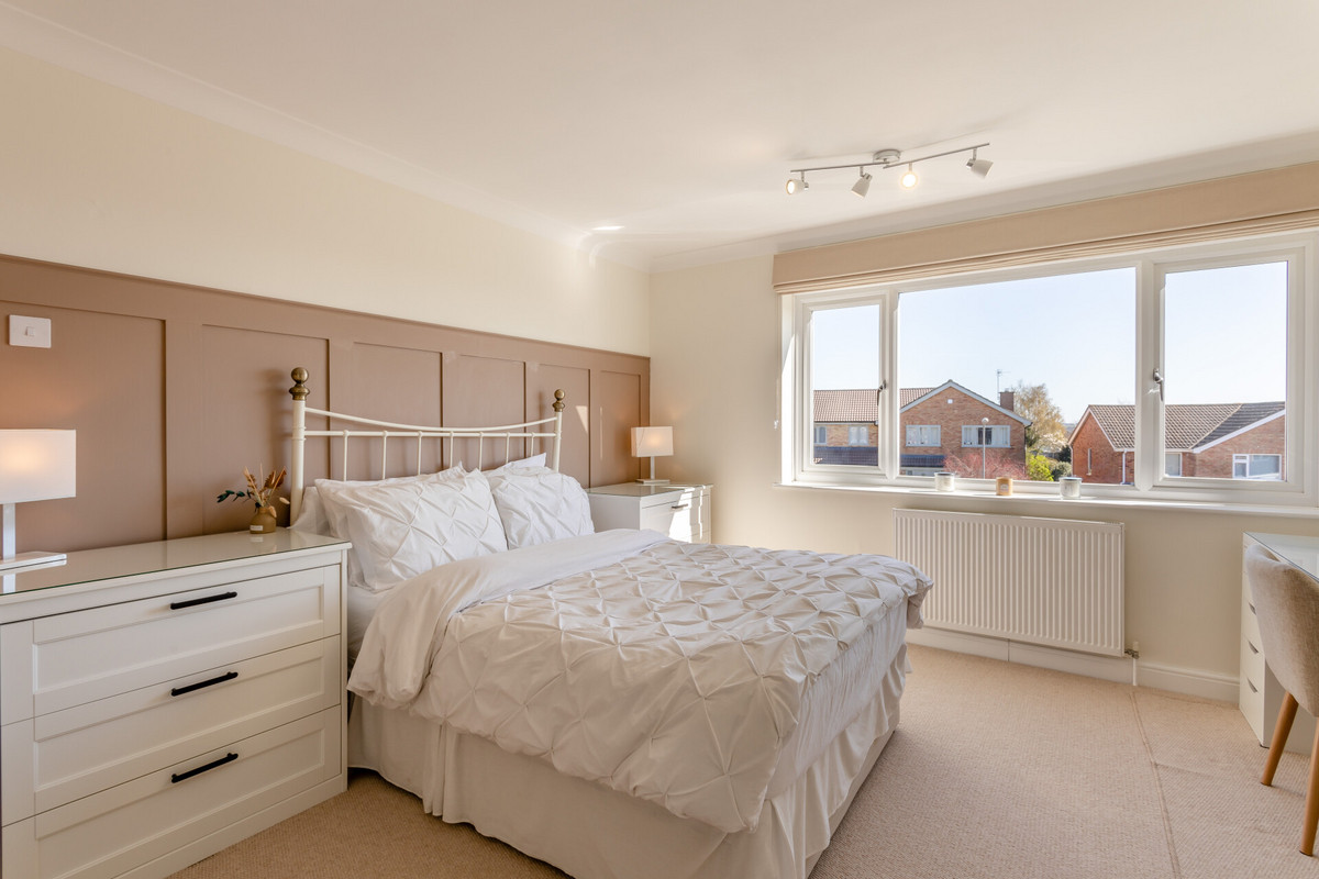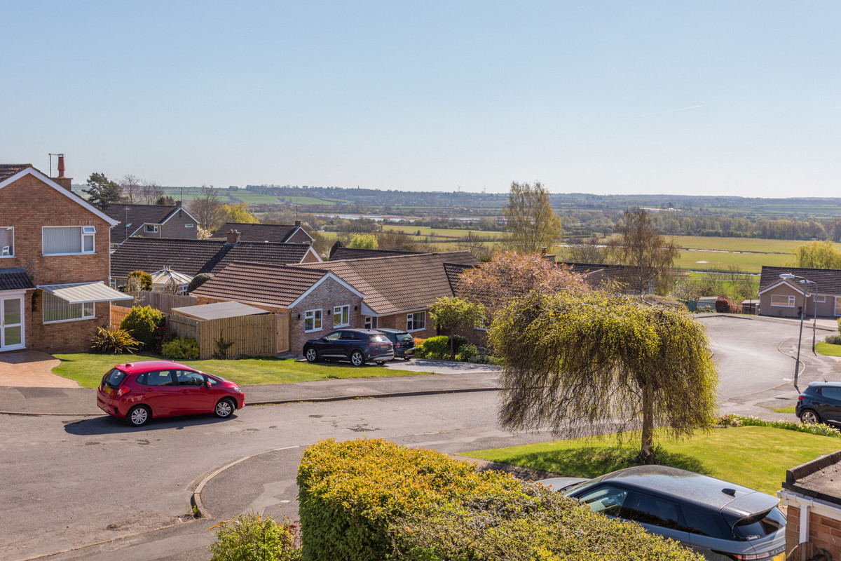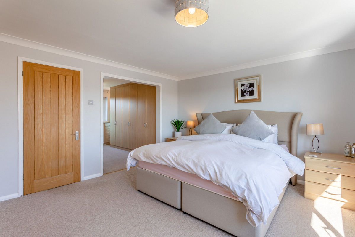 Upstairs, the split-level landing leads to four generously proportioned double bedrooms – all of which enjoy breathtaking views across the Nene Valley and Summer Leys Nature Reserve. The primary suite is a standout, offering a large bedroom with fitted wardrobes, a dedicated dressing room, and a luxurious en-suite bathroom complete with both bath and walk-in shower. A stylish family bathroom serves the remaining bedrooms.